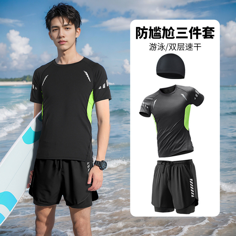 • 검정색과 녹색 반팔 쓰리피스 슈트(수영모 포함)
