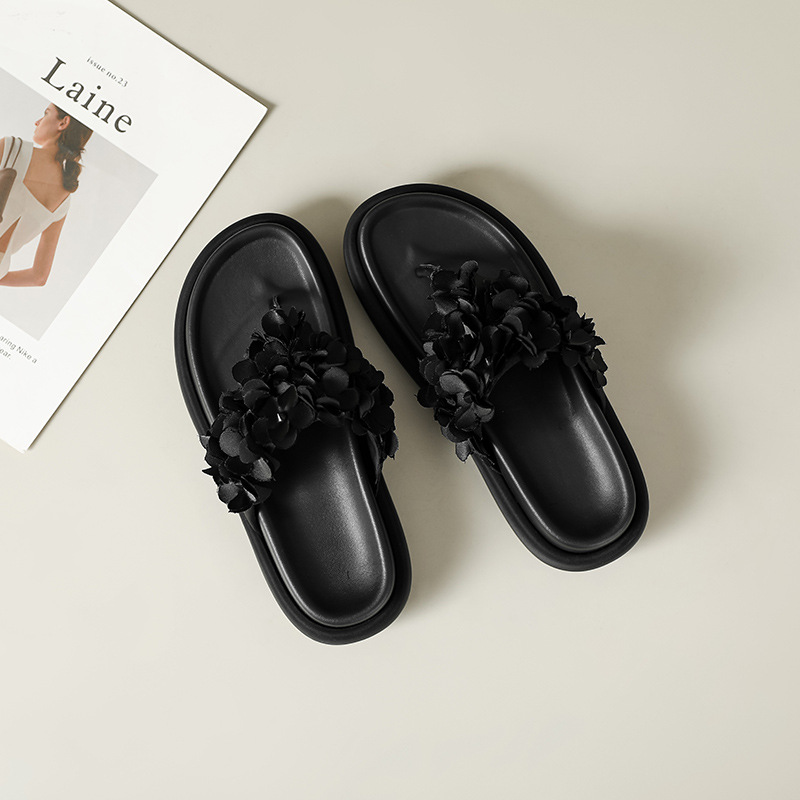 2025 새로운 스타일의 천 꽃 두꺼운 밑창 웨지 슬리퍼 패션 라운드 발가락 보우 원 스트랩 여성 슬리퍼