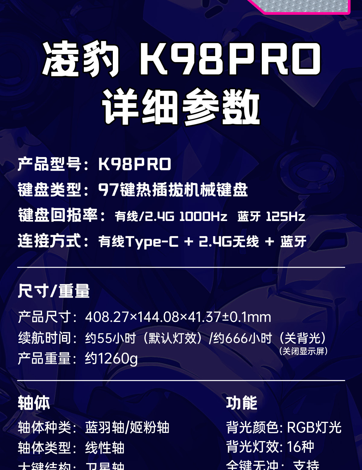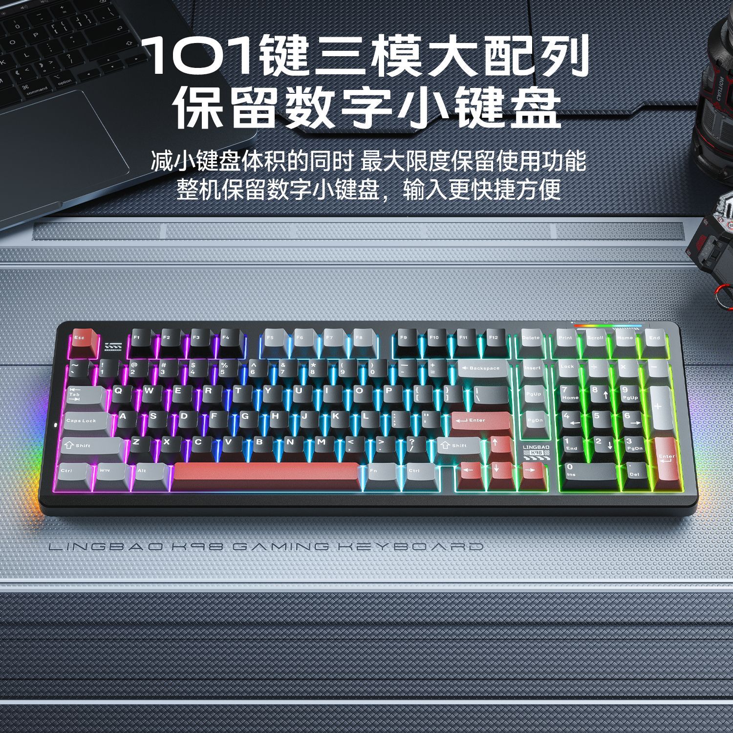 한국어 및 러시아어 Lingbao K98 기계식 키보드 측면 새겨진 무선 Bluetooth 3 모드 e-스포츠 게임 키보드 사용자 정의