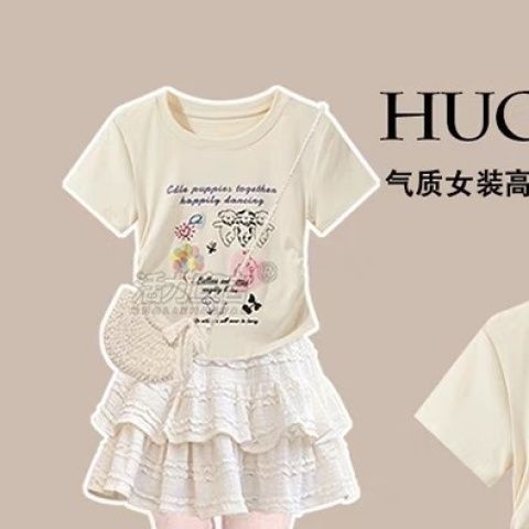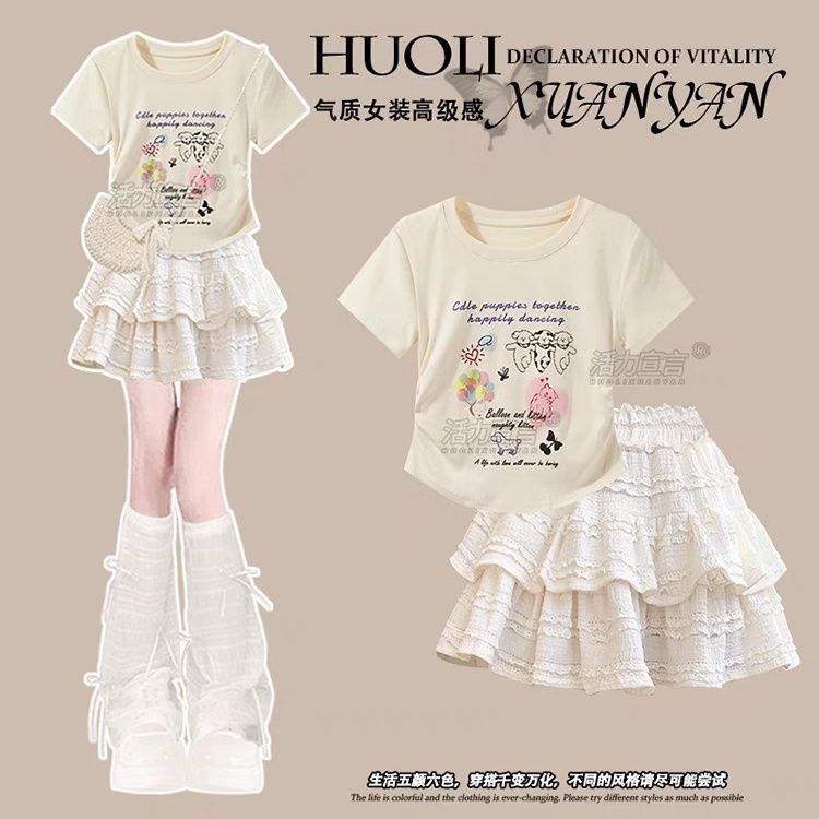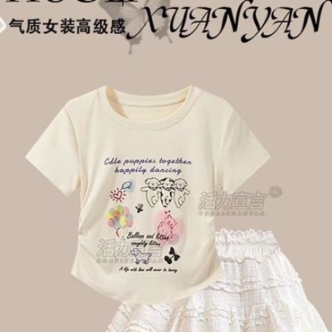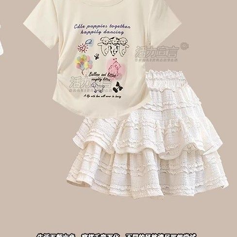 큰 어린이를위한 여자 아기 한국어 영어 인쇄 달콤한 케이크 스커트 정장 여름 새로운 만화 반팔 티셔츠 정장스토어 가기