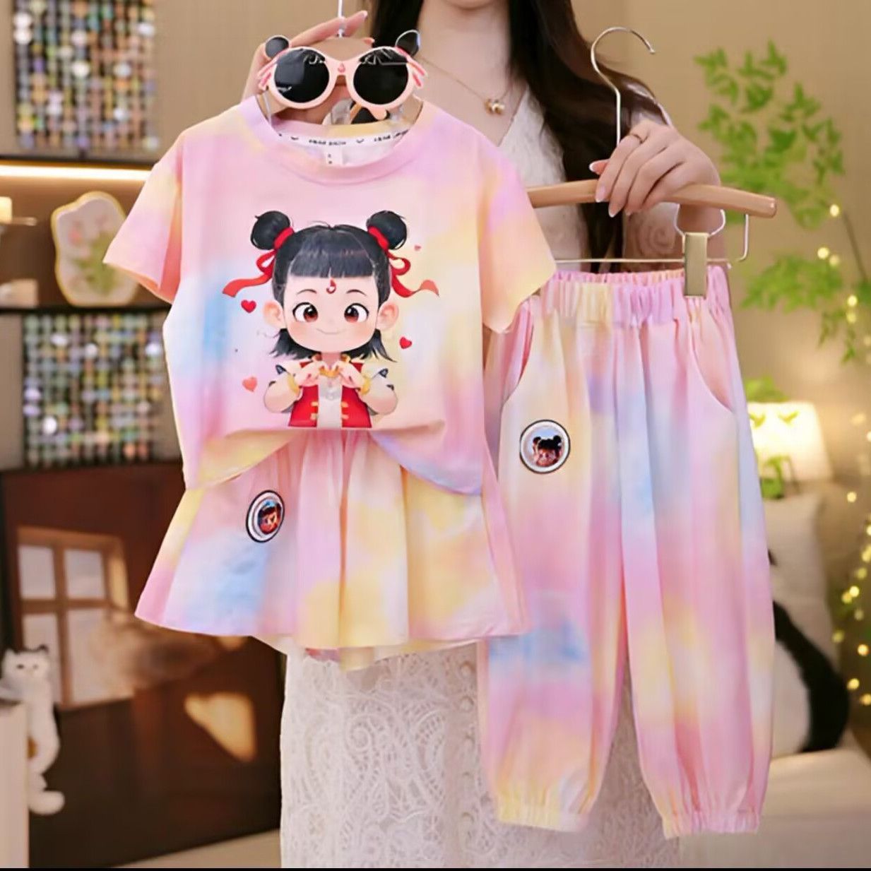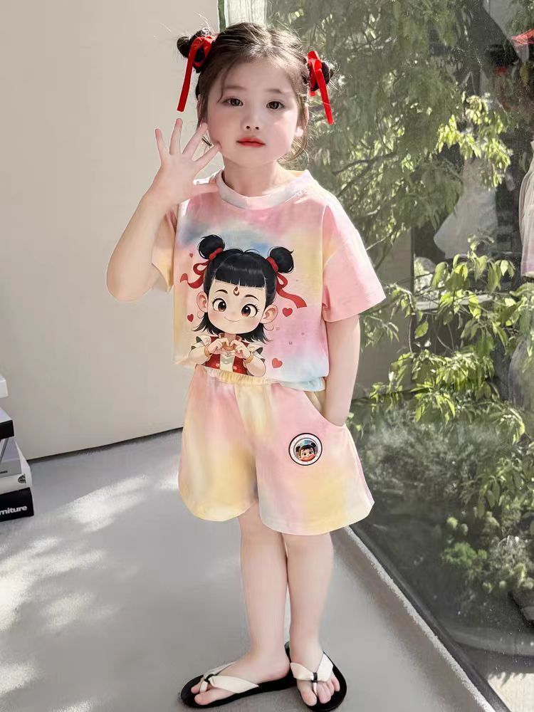 Nezha 어린이 반팔 양복 2025 새로운 여름 아기 소녀 타이 염색 만화 탑과 바지 투피스 아동 의류스토어 가기