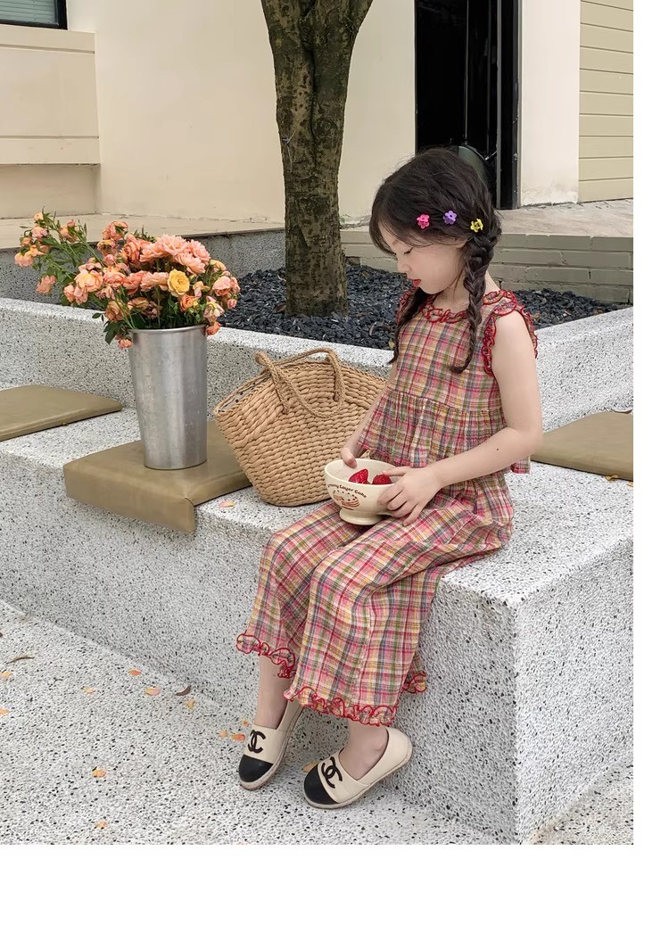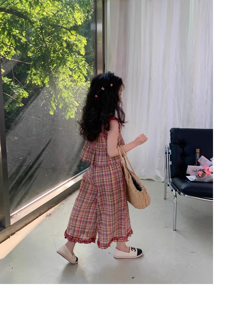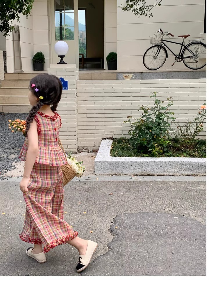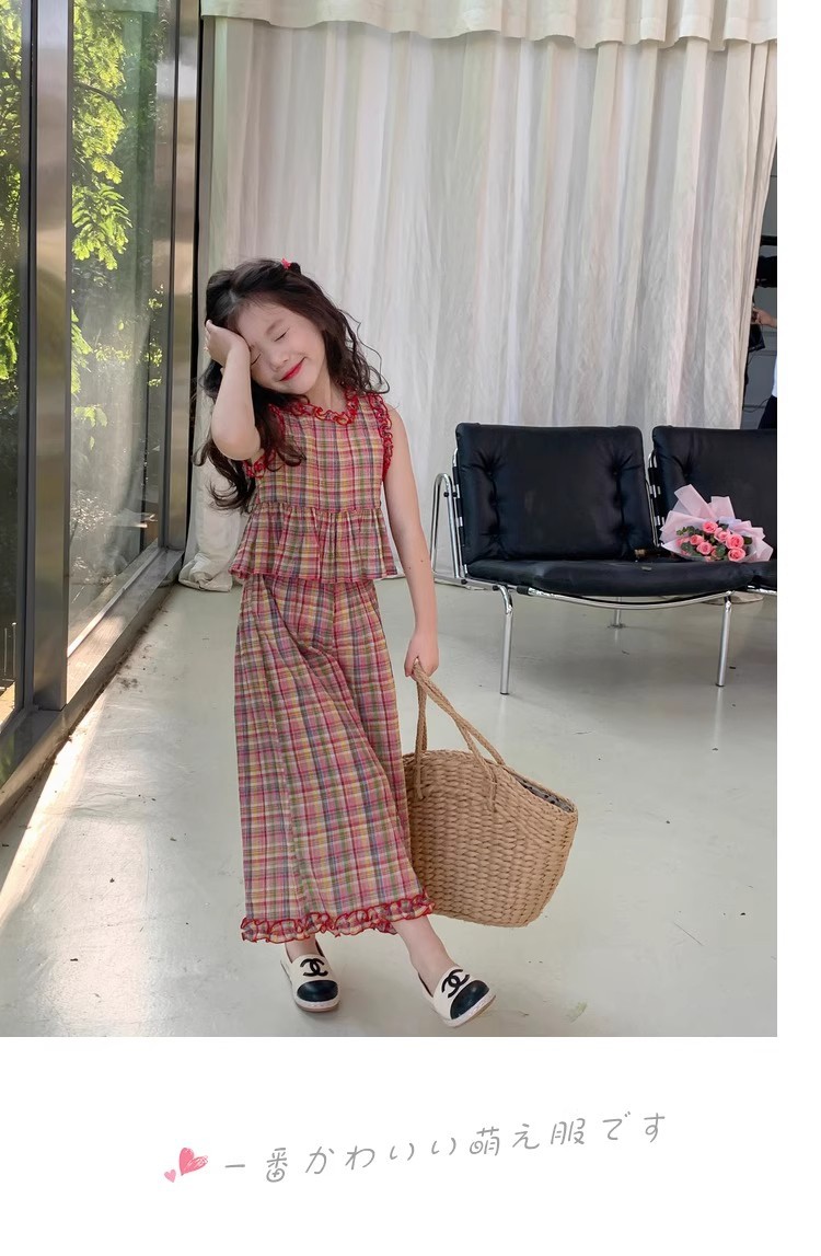 여자 캐주얼 정장 2025 여름 새로운 스타일 어린 소녀 유행 격자 무늬 민소매 조끼 와이드 레그 팬츠 투피스 세트스토어 가기