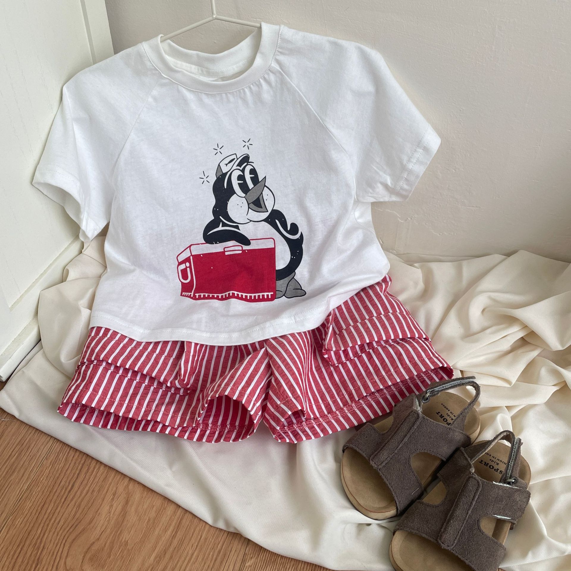 Galakoko 여름 한국 스타일 남성 스트라이프 반바지 니트 만화 캐주얼 티셔츠 새로운 스타일 슈트