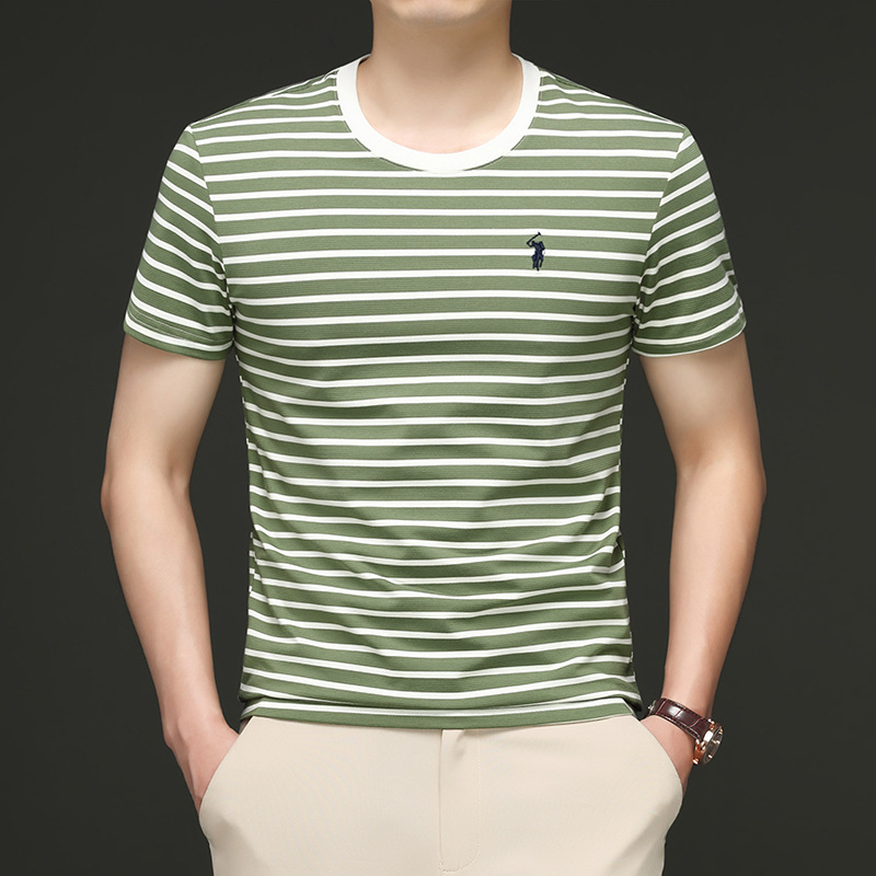 2025 여름 새로운 데일리 패션 캐주얼 얇은 통기성 반팔 남성 코튼 암모니아 스트라이프 자수 남성 티셔츠스토어 가기