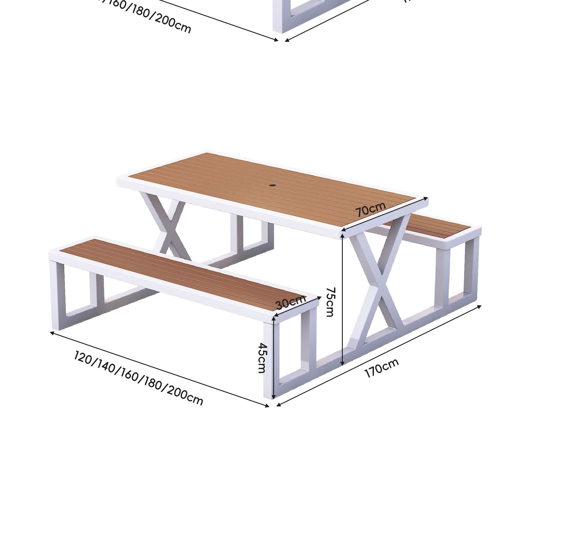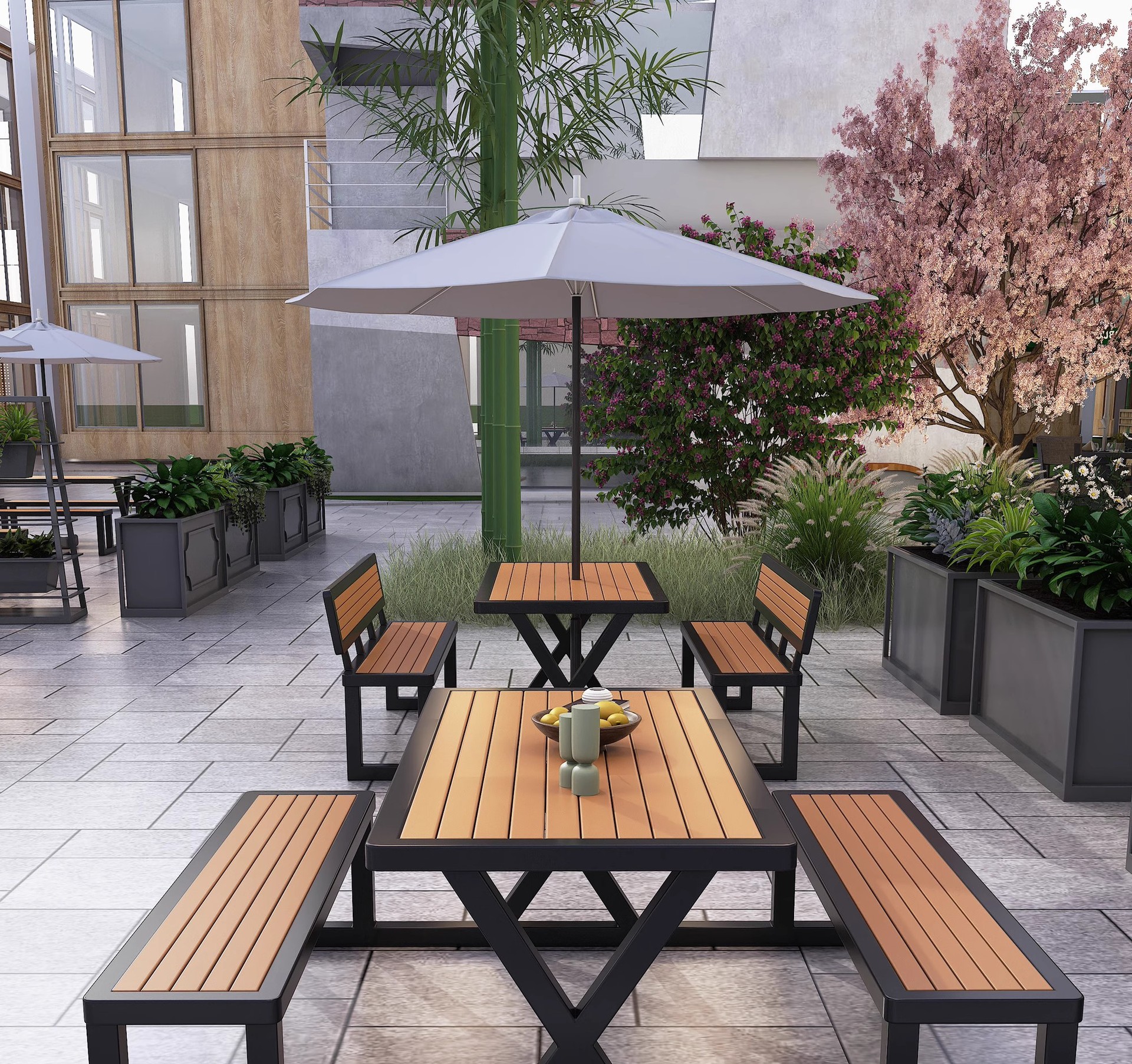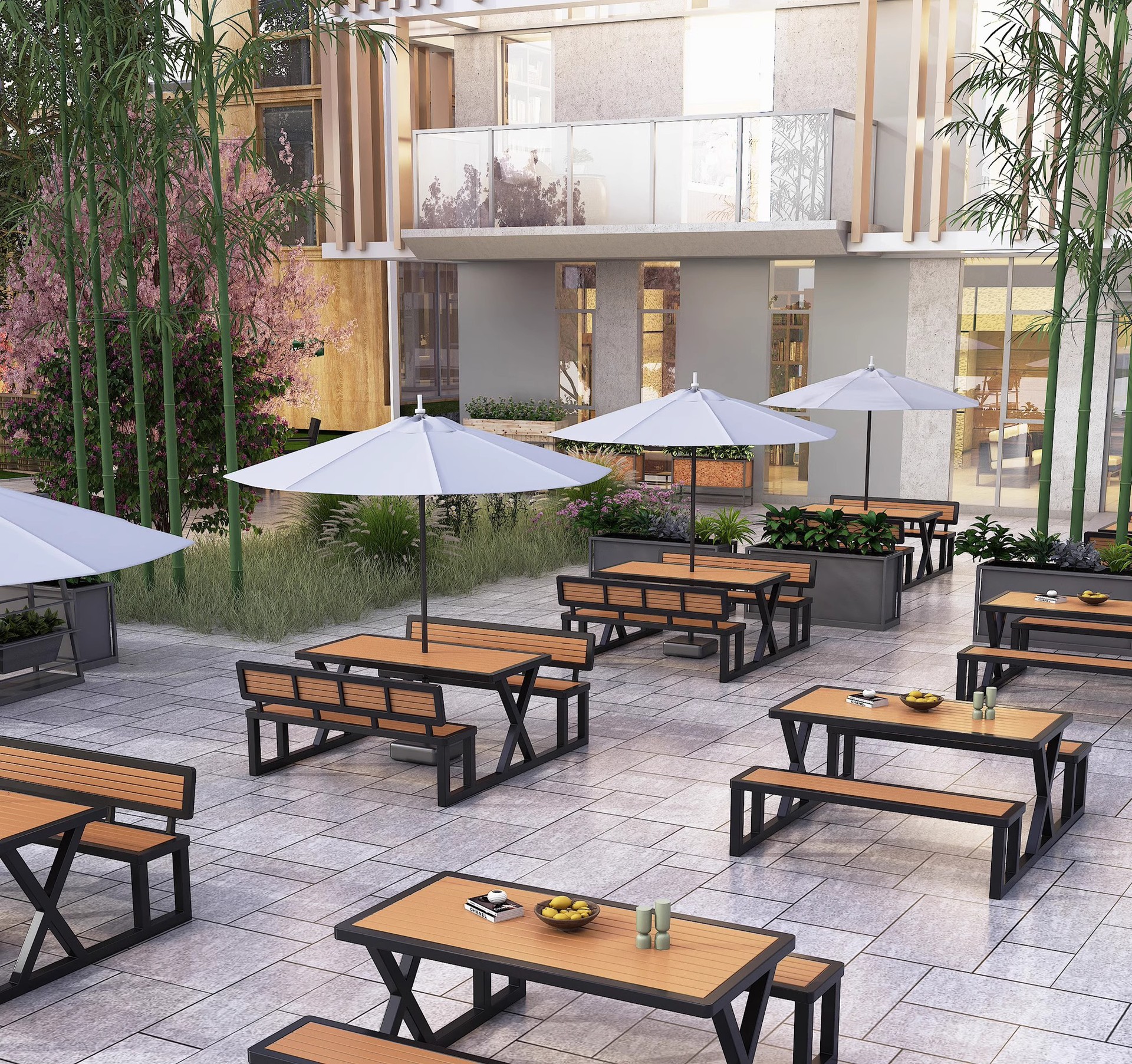 야외 안뜰 방수 및 자외선 차단 일체형 테이블과 의자 야외 상업용 식탁 플라스틱 목재 등받이 긴 테이블과 의자 조합