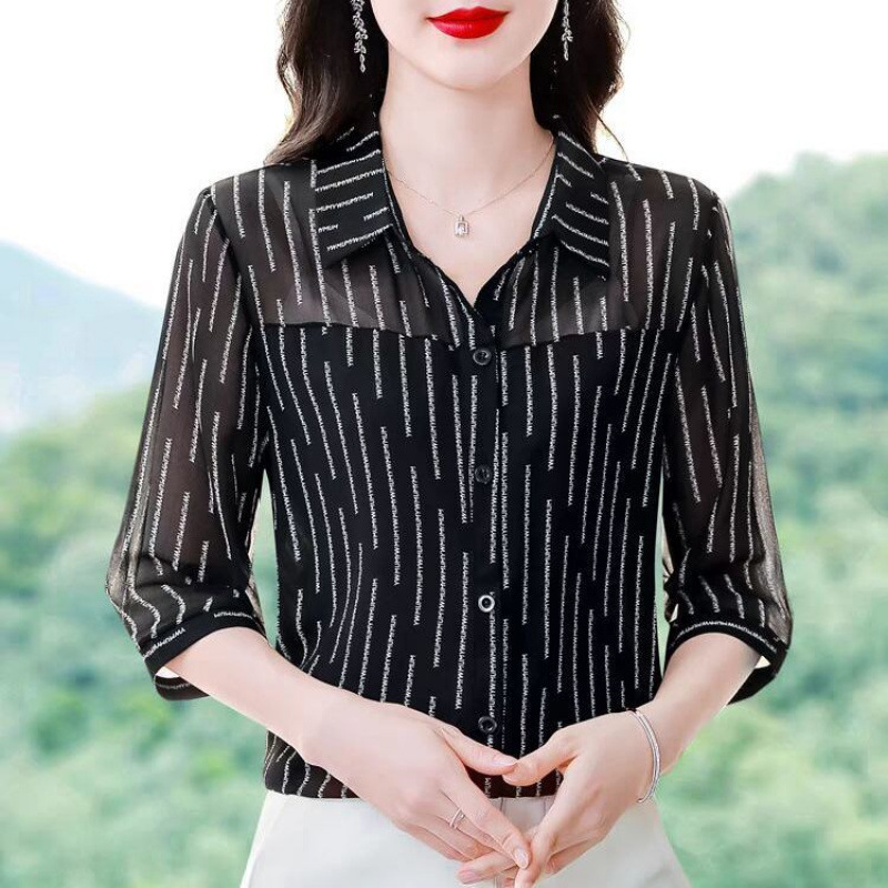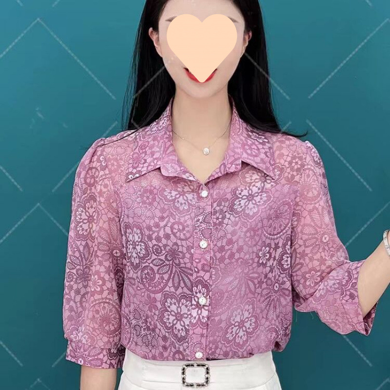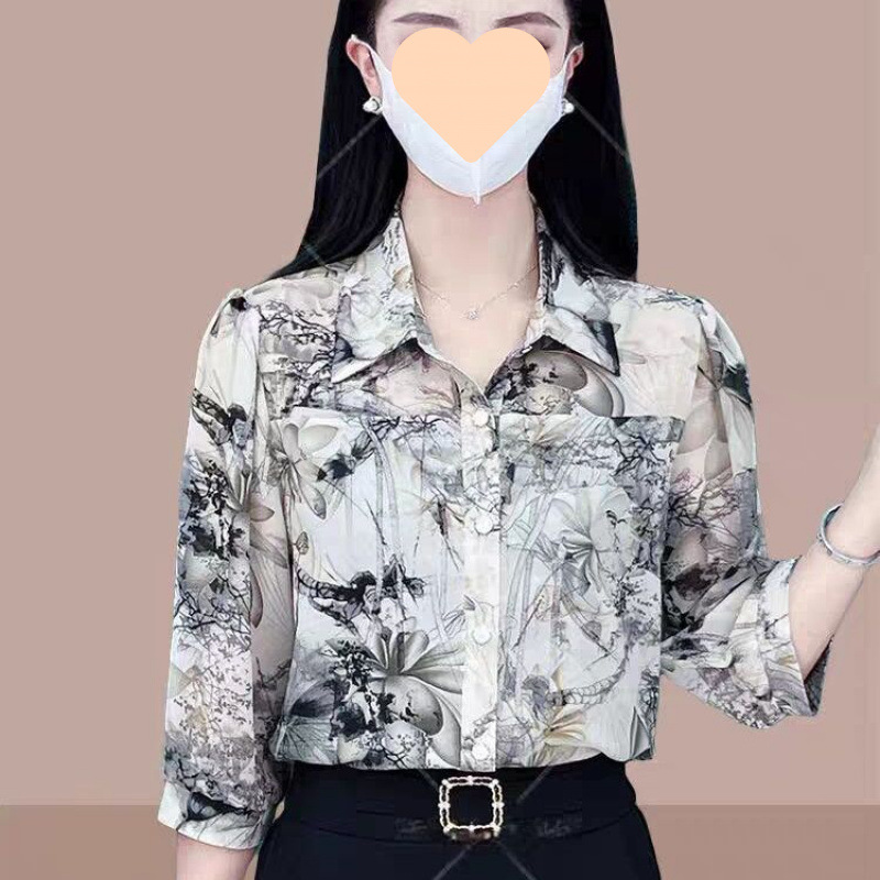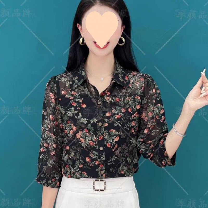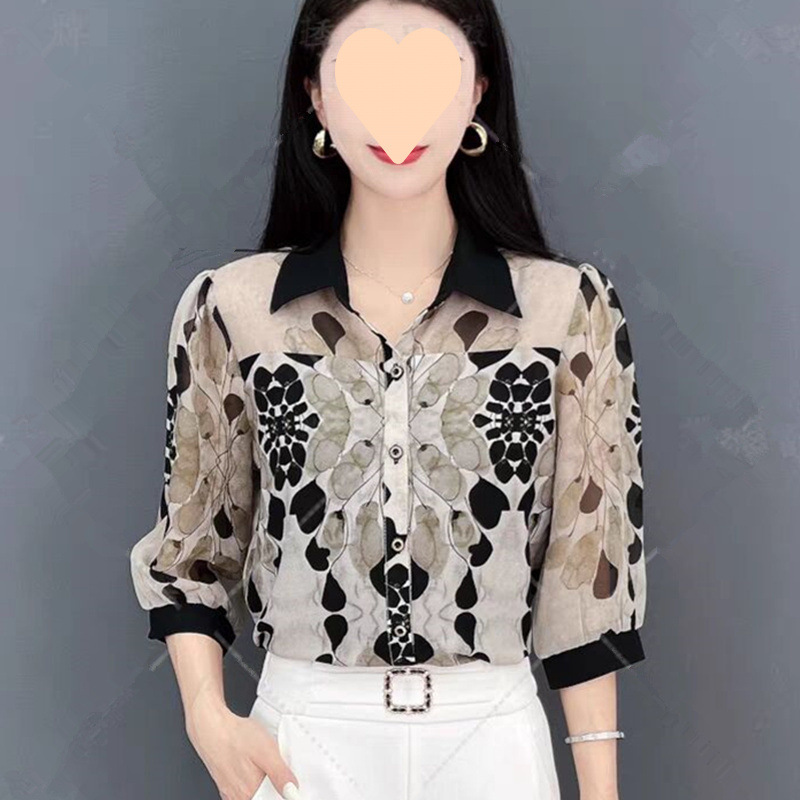 여름 얇은 7부소매 프린트 셔츠 플러스 사이즈 중년 엄마 플러스 사이즈 슬리밍 가디건 쉬폰 탑스토어 가기