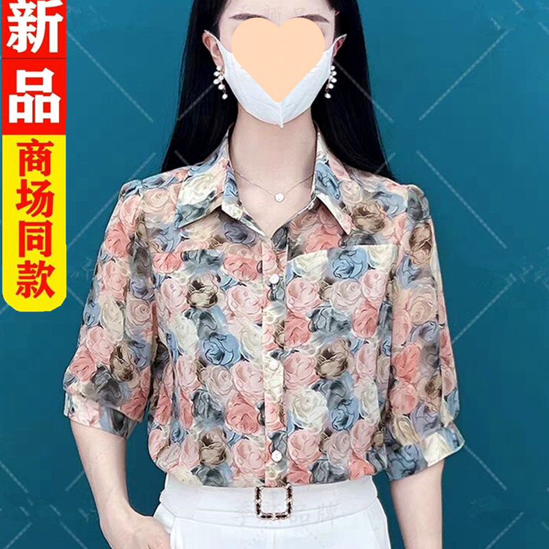 여름 얇은 7부소매 프린트 셔츠 플러스 사이즈 중년 엄마 플러스 사이즈 슬리밍 가디건 쉬폰 탑