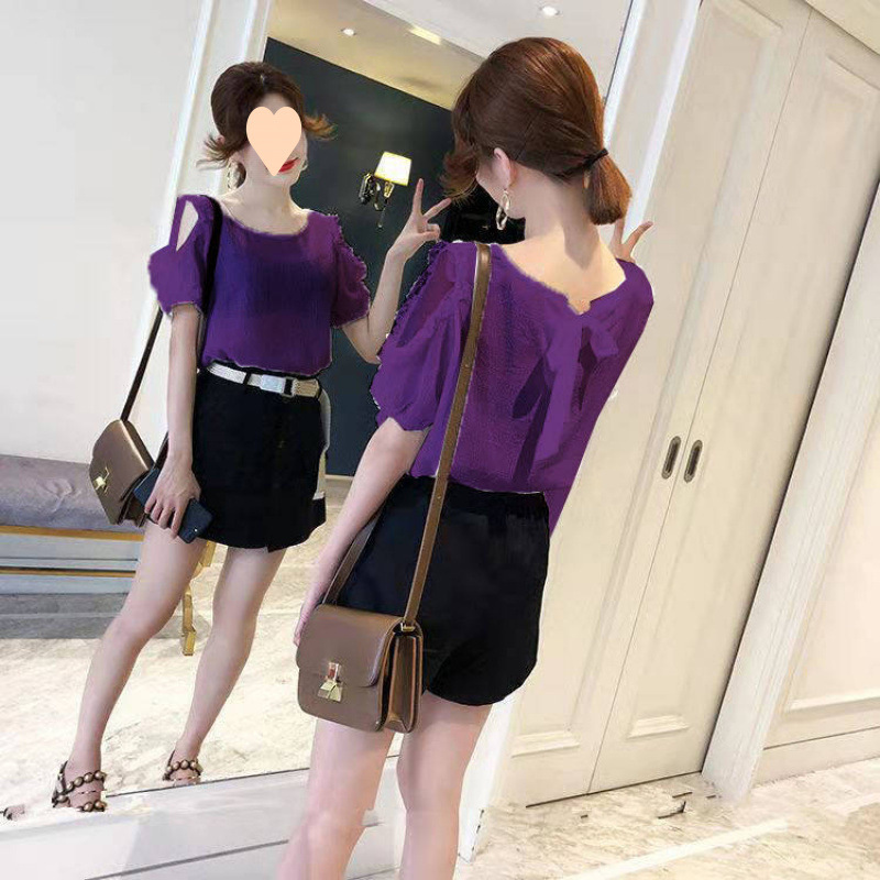 쉬폰 반팔 여성 여름 2025 신상 여성 한국 패션 레이스 업 스타일 인형 셔츠 기질 오프 숄더 탑 여성