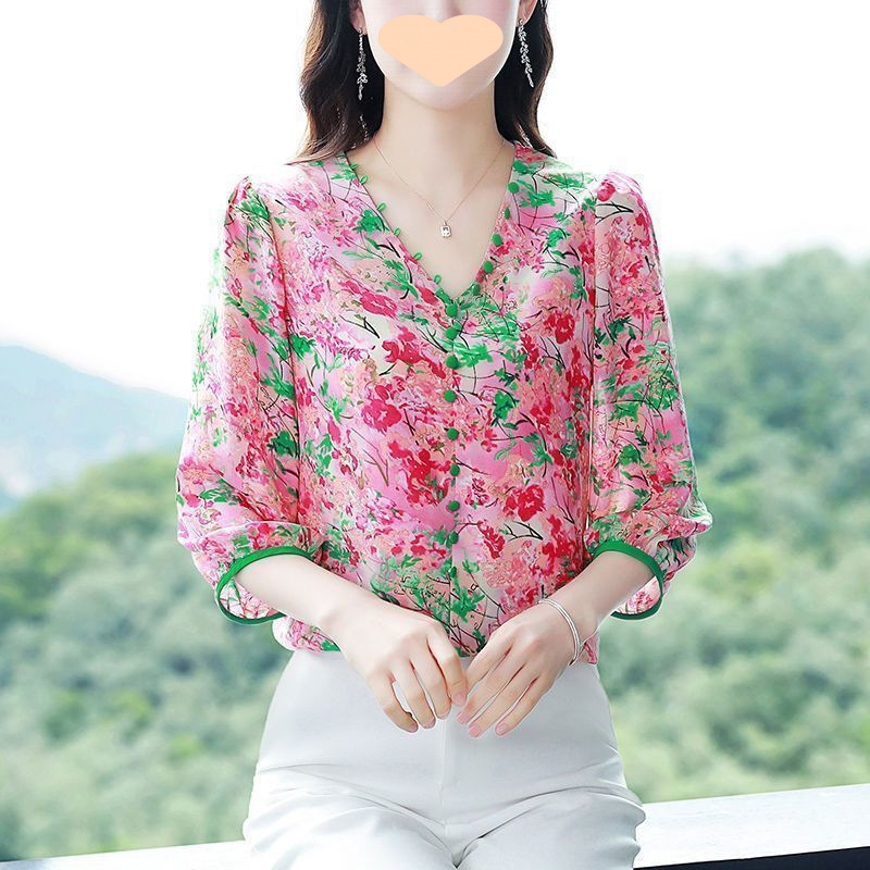 여성을위한 7부 소매 꽃 무늬 쉬폰 셔츠 탑 여름 2025 새로운 느슨한 칼라 디자인 프린트 컬러 외국 스타일스토어 가기