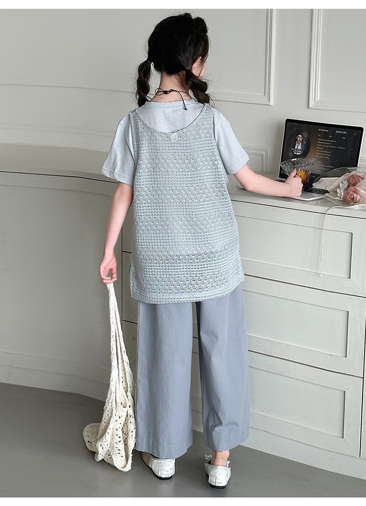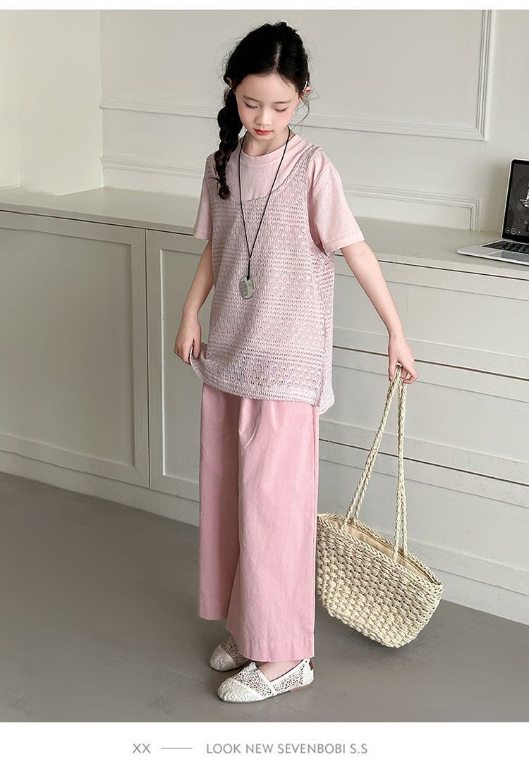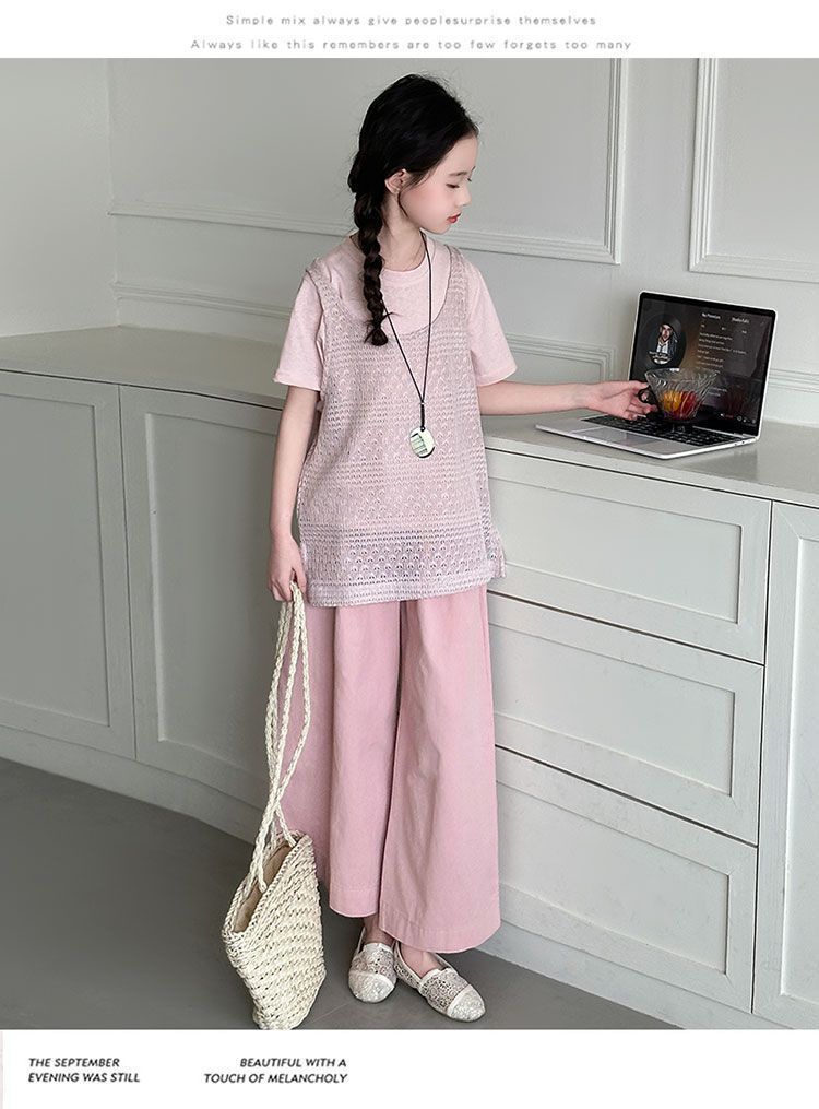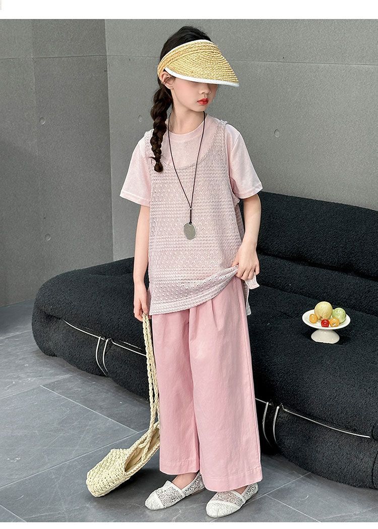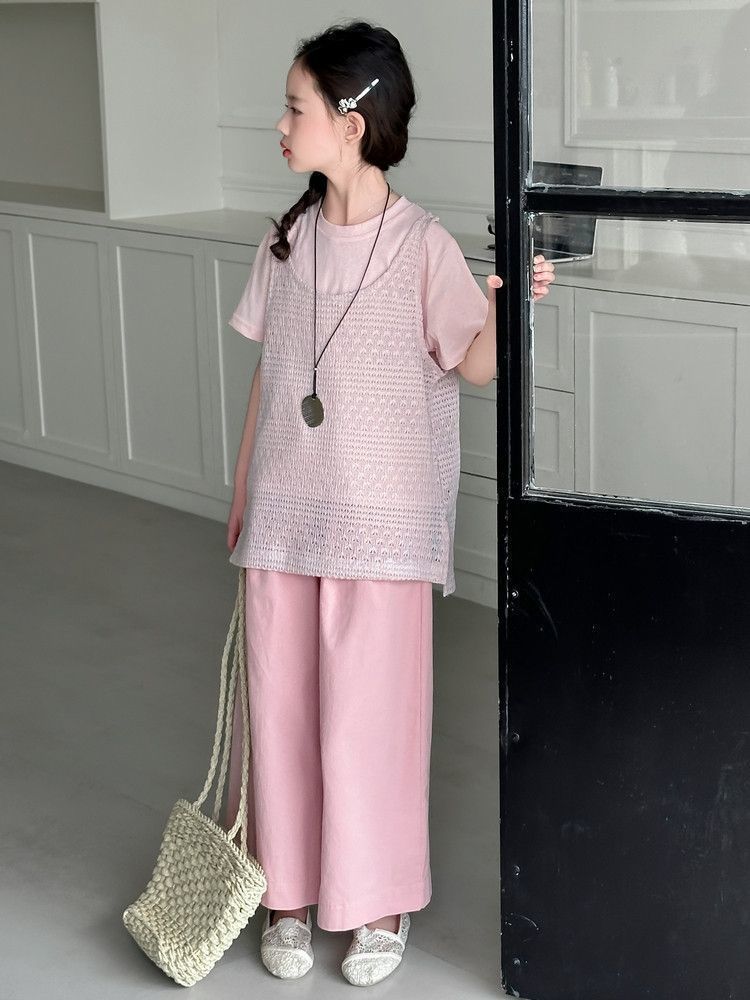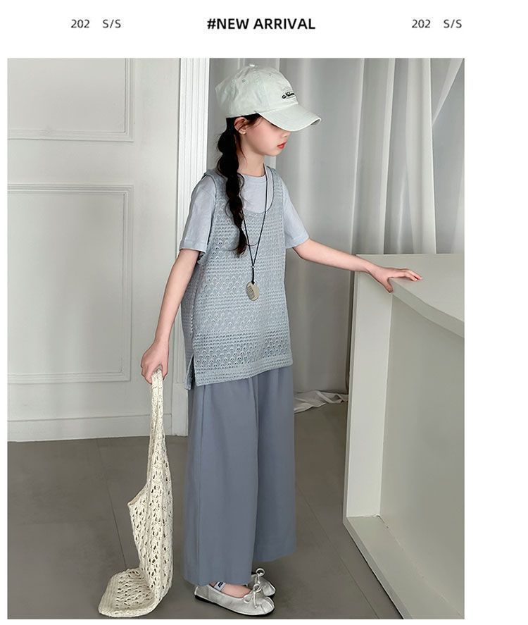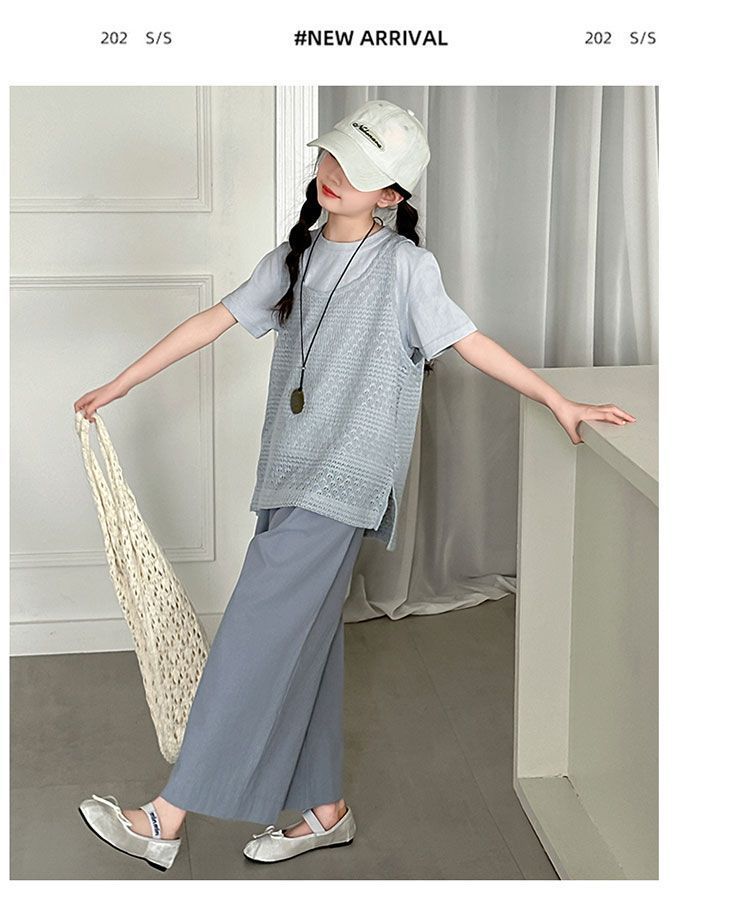 여아 여름 정장 2025 새로운 스타일 중대형 아동용 중공 조끼 한국 스타일 얇은 5부 소매 투피스