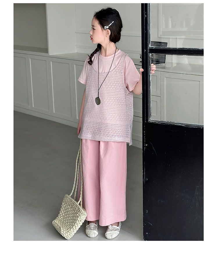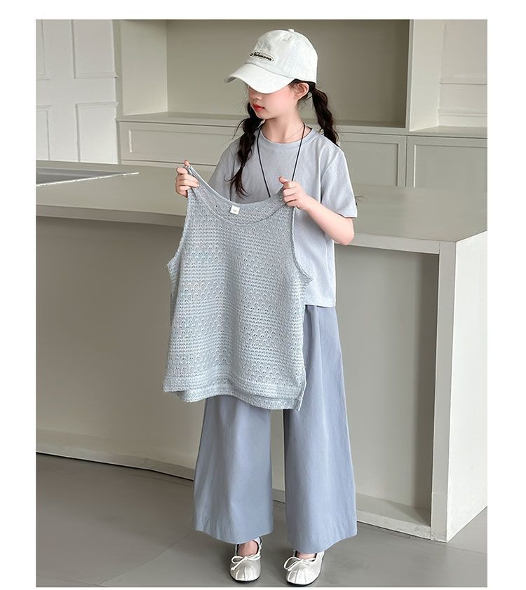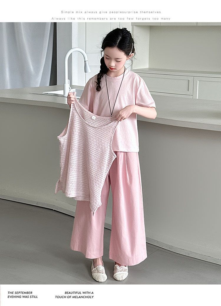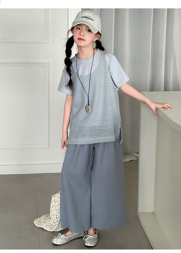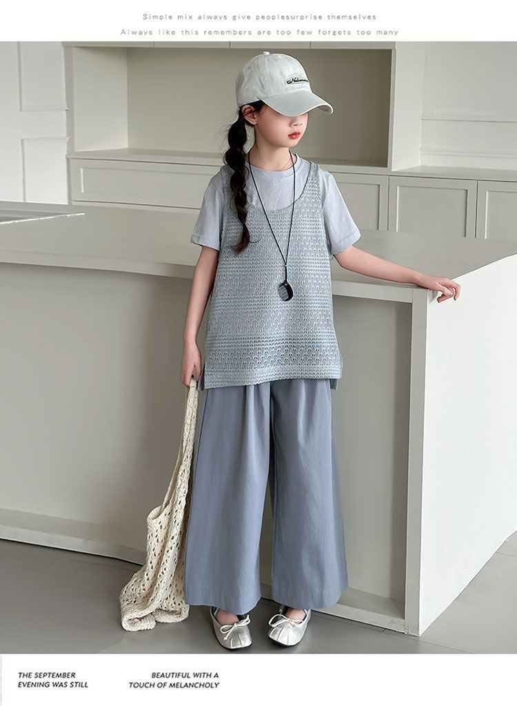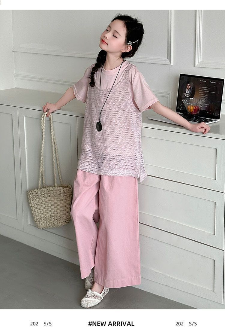 여아 여름 정장 2025 새로운 스타일 중대형 아동용 중공 조끼 한국 스타일 얇은 5부 소매 투피스