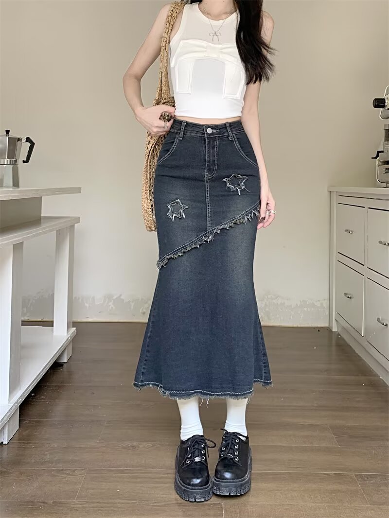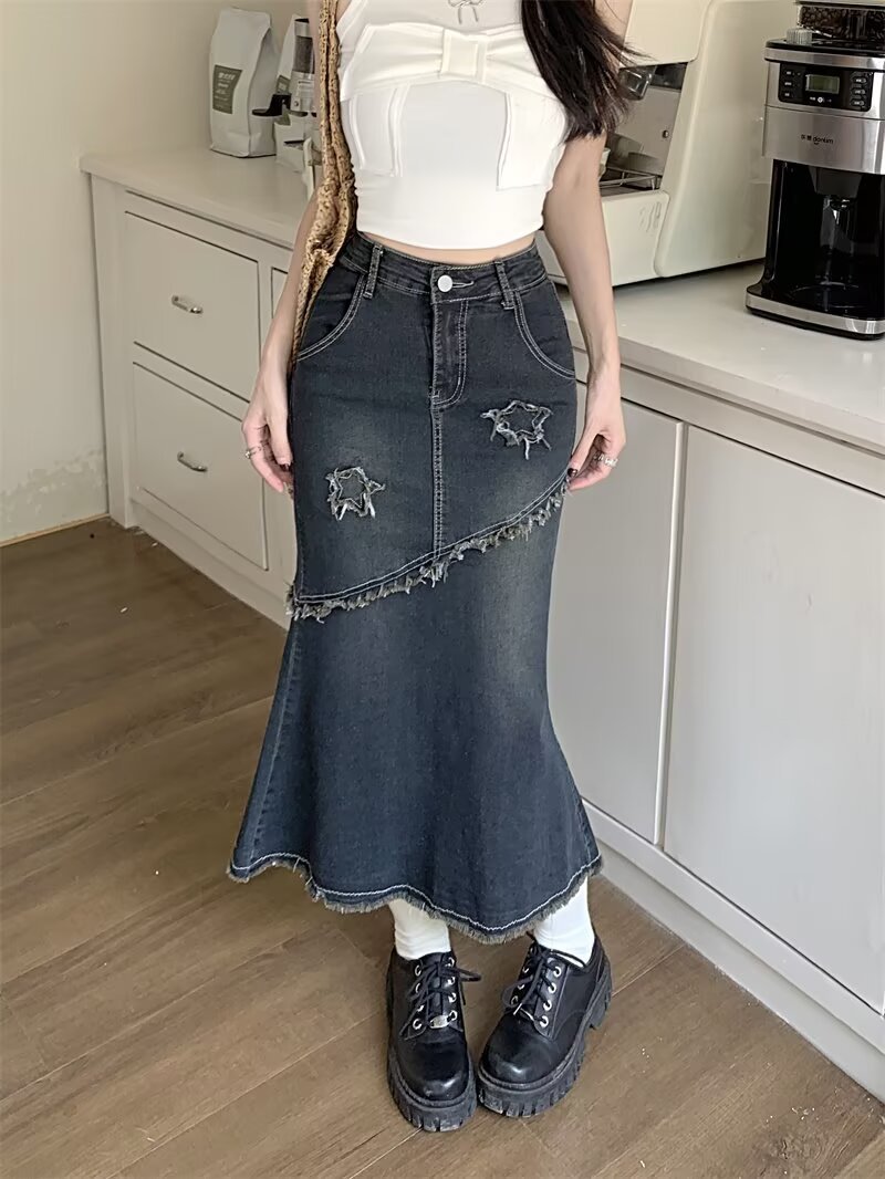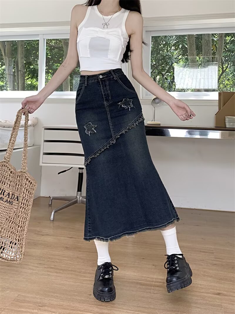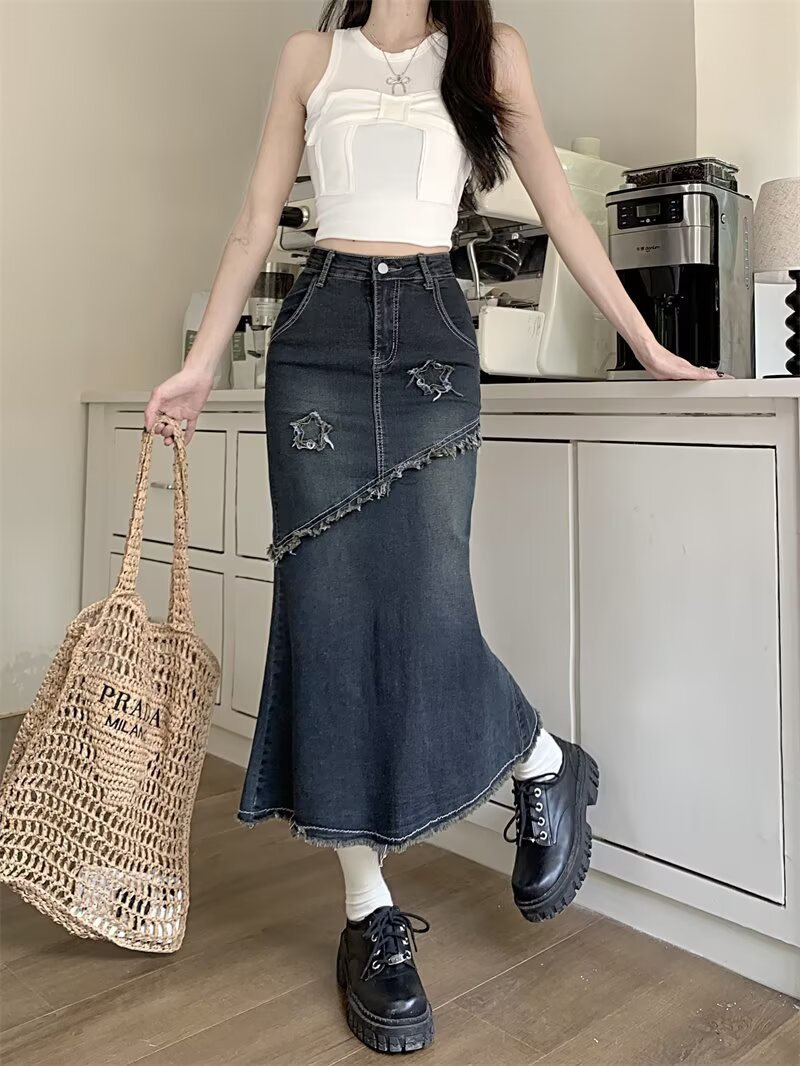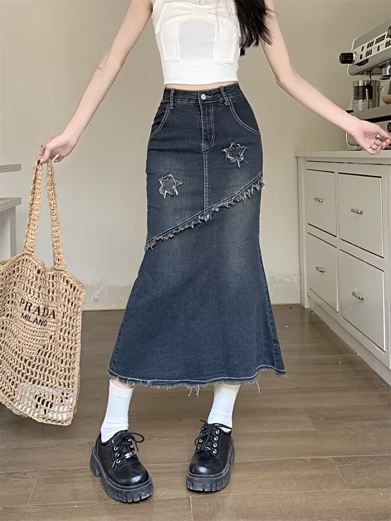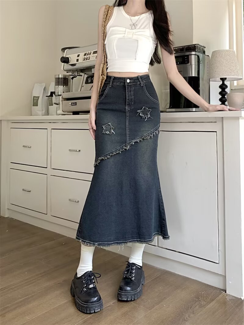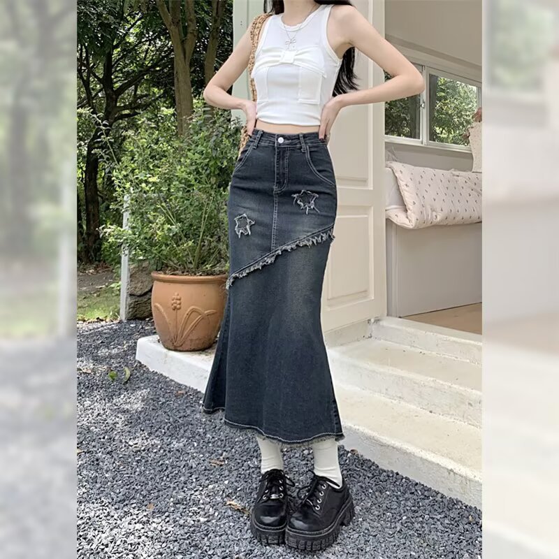 봄, 가을 하이웨이스트 디자인의 아메리칸 레트로 로우 엣지 데님 스커트 미드기장 A라인 힙 커버 피쉬테일 스커트 인스토어 가기
