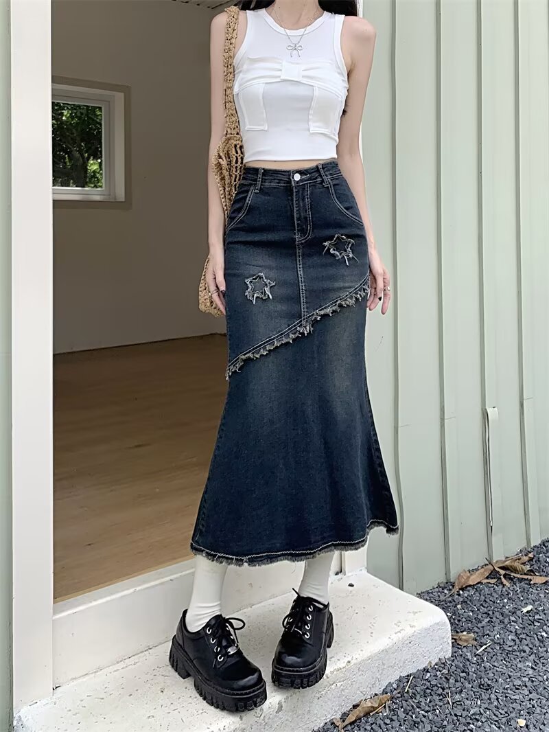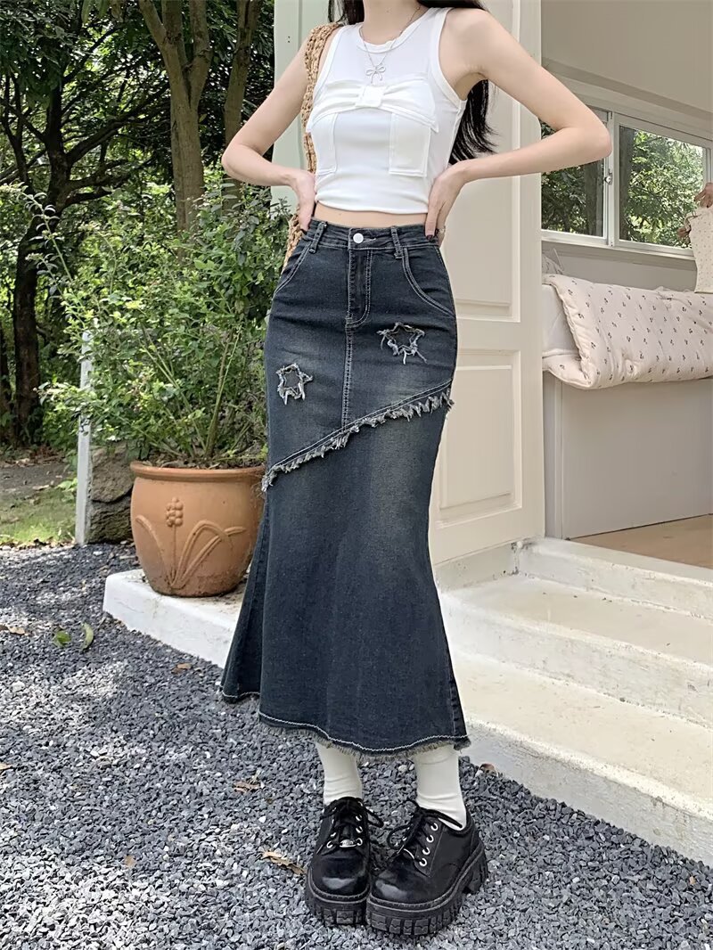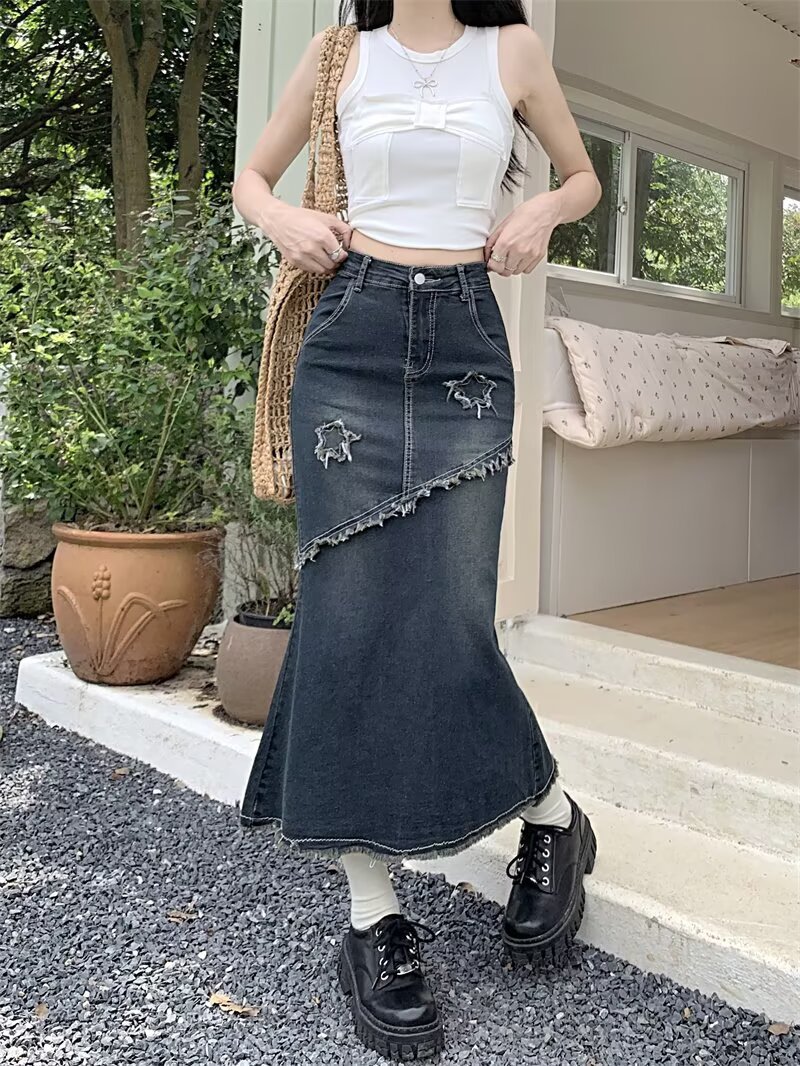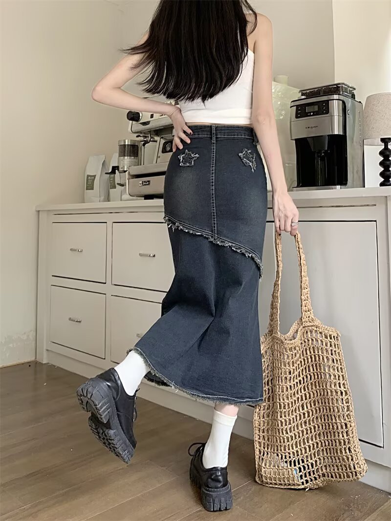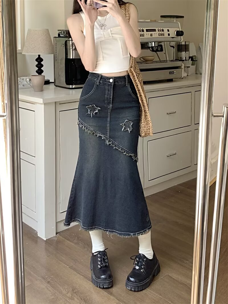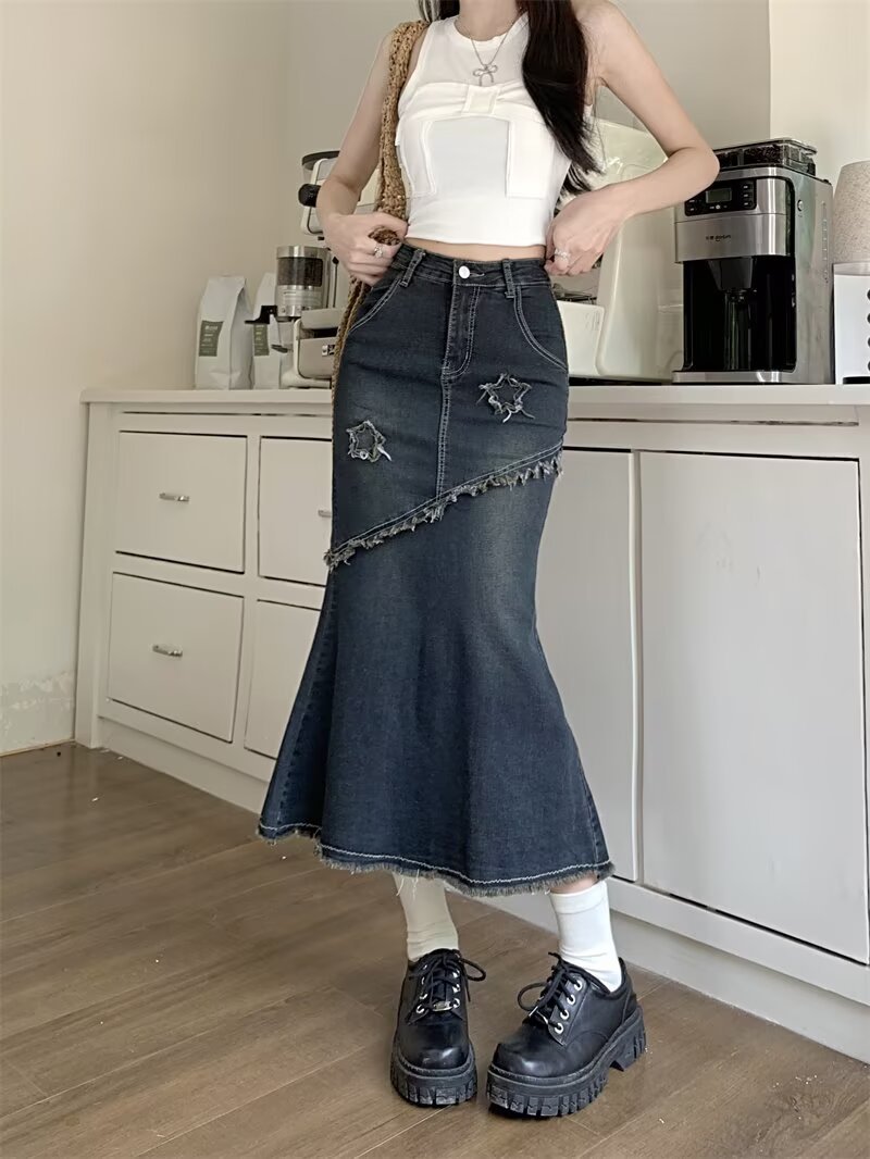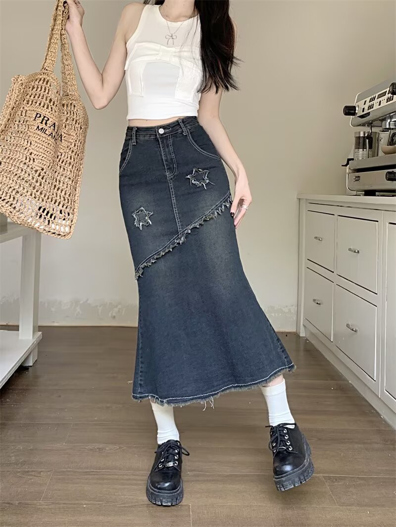 봄, 가을 하이웨이스트 디자인의 아메리칸 레트로 로우 엣지 데님 스커트 미드기장 A라인 힙 커버 피쉬테일 스커트 인스토어 가기
