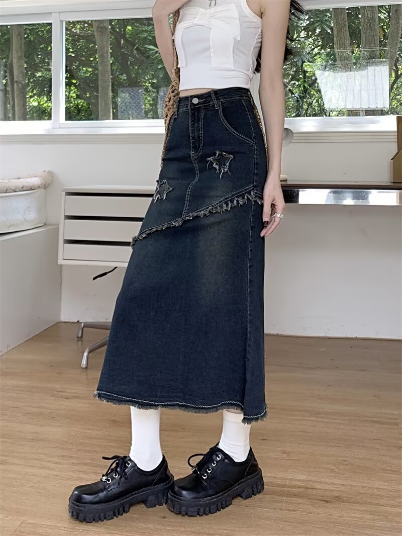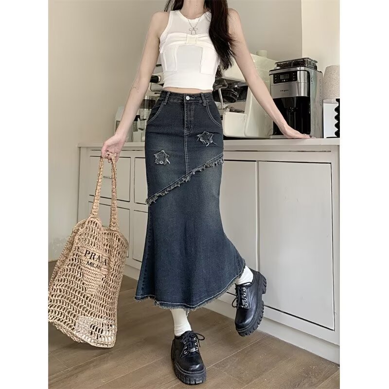 봄, 가을 하이웨이스트 디자인의 아메리칸 레트로 로우 엣지 데님 스커트 미드기장 A라인 힙 커버 피쉬테일 스커트 인
