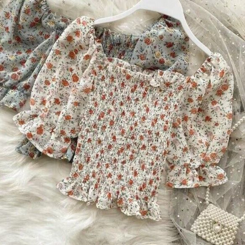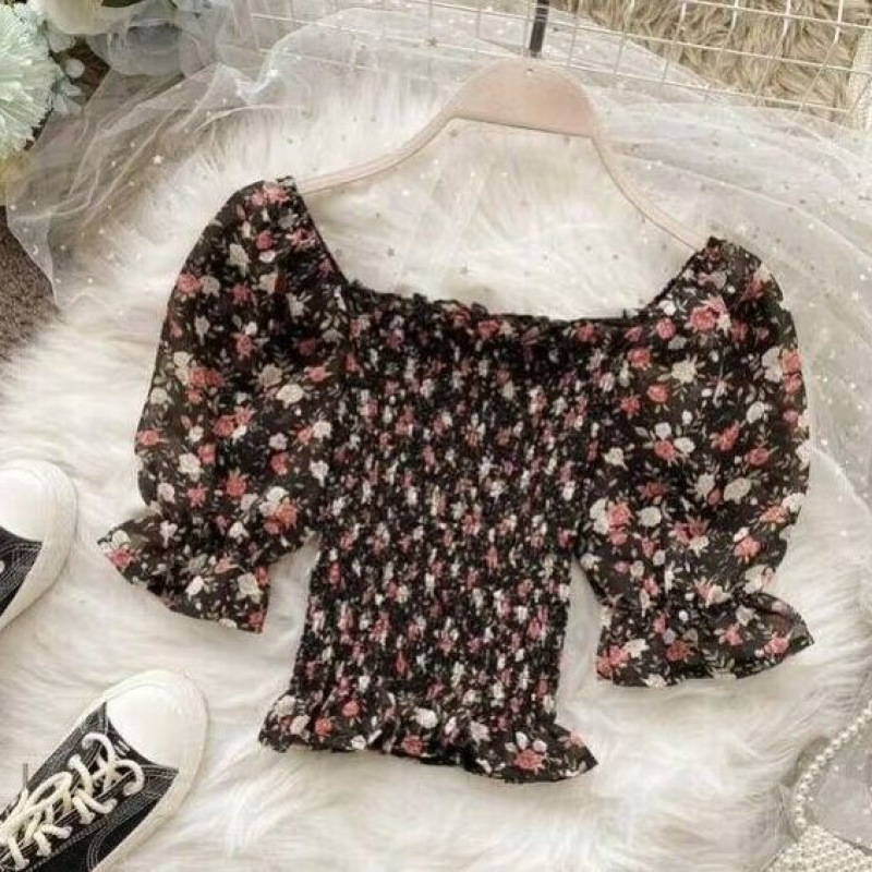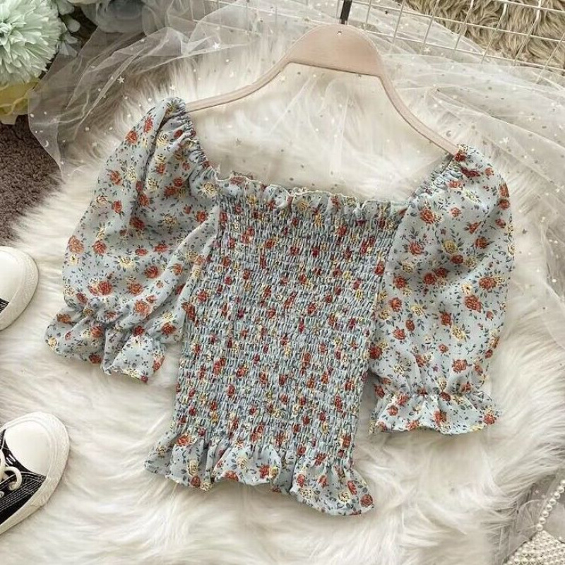 여성을위한 작은 신선한 꽃 짧은 퍼프 슬리브 셔츠 2025 여성을위한 새로운 슬림 피트 꽃 쉬폰 셔츠 탑
