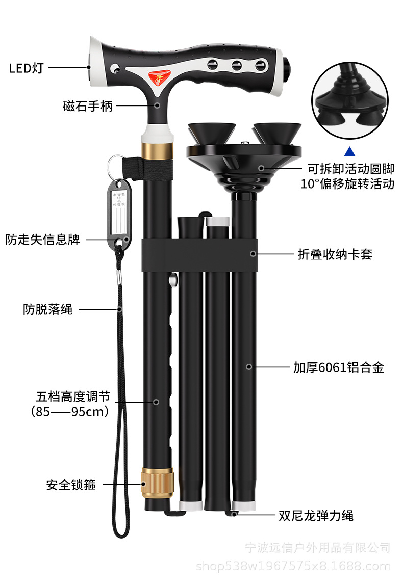노인을 위한 조명이 있는 알루미늄 합금 지팡이, 고무 마그넷이 있는 지팡이, 회전식 4발 이중 목적 지팡이, 접이식 및 휴대용 도매