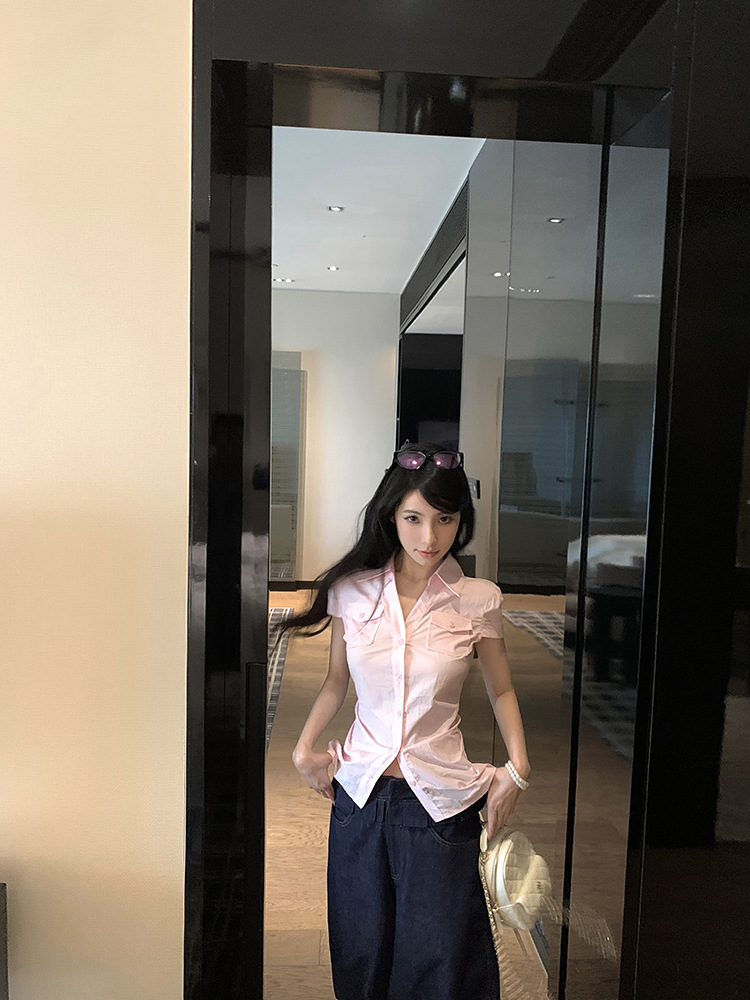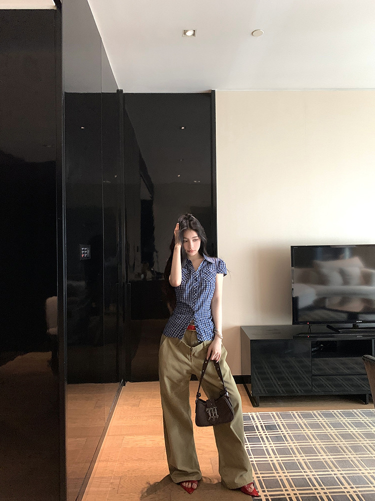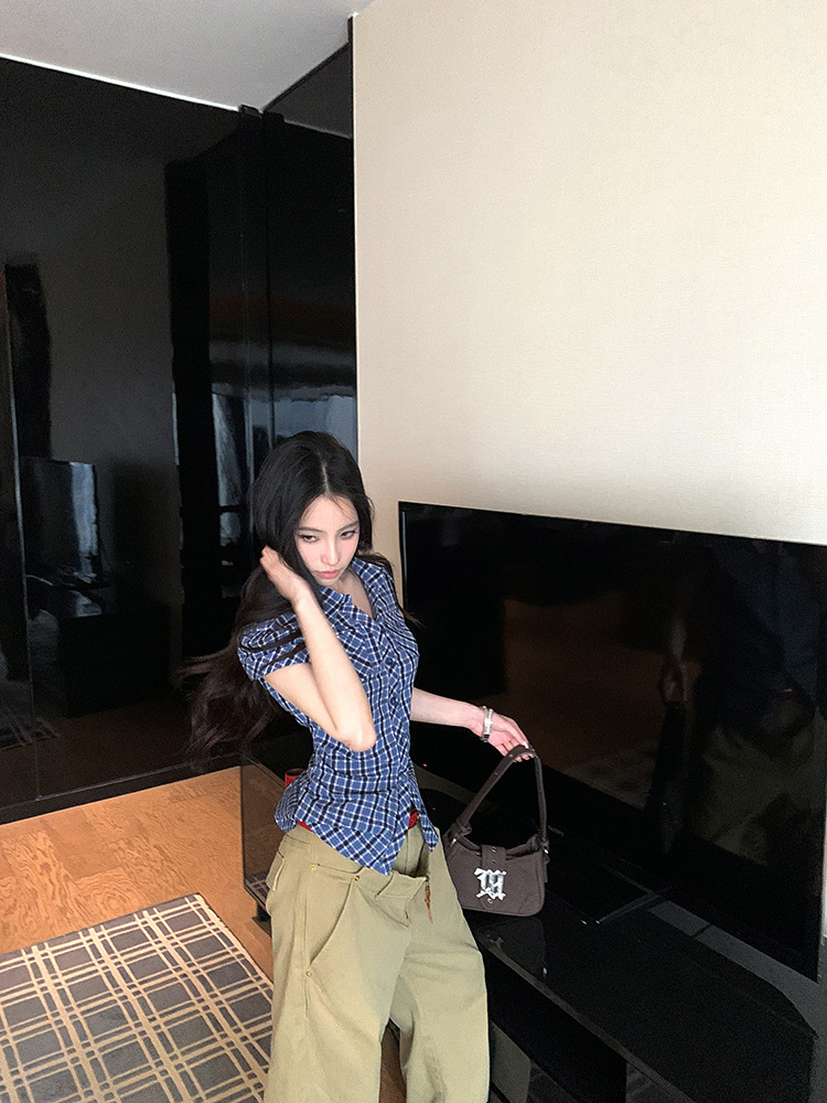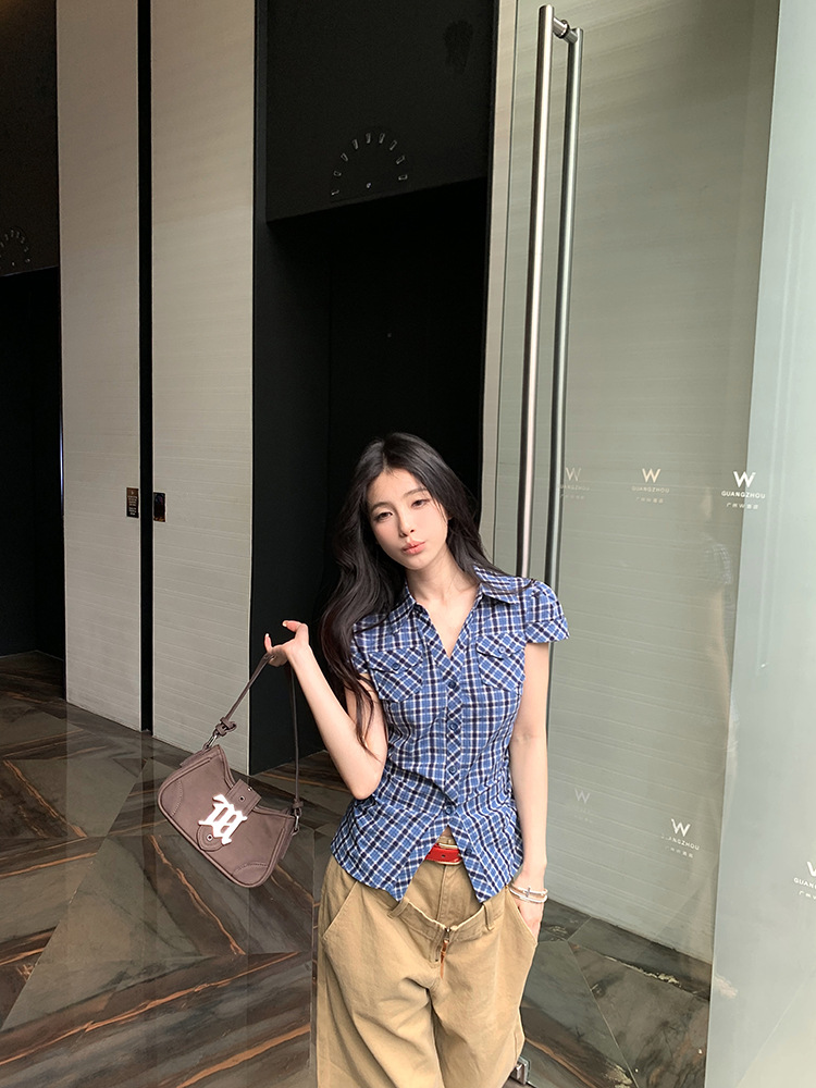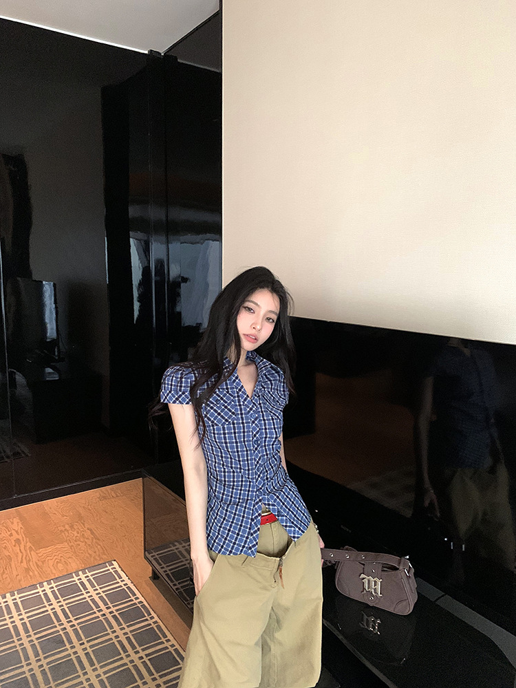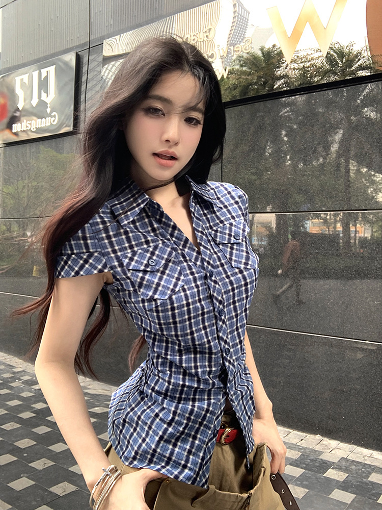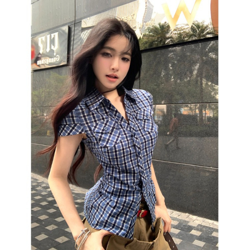 도매 [오리지널 체크 무늬] 여름 한국 스타일 허리 셔츠 디자인의 여성용 블루 체크 무늬 반팔 셔츠스토어 가기