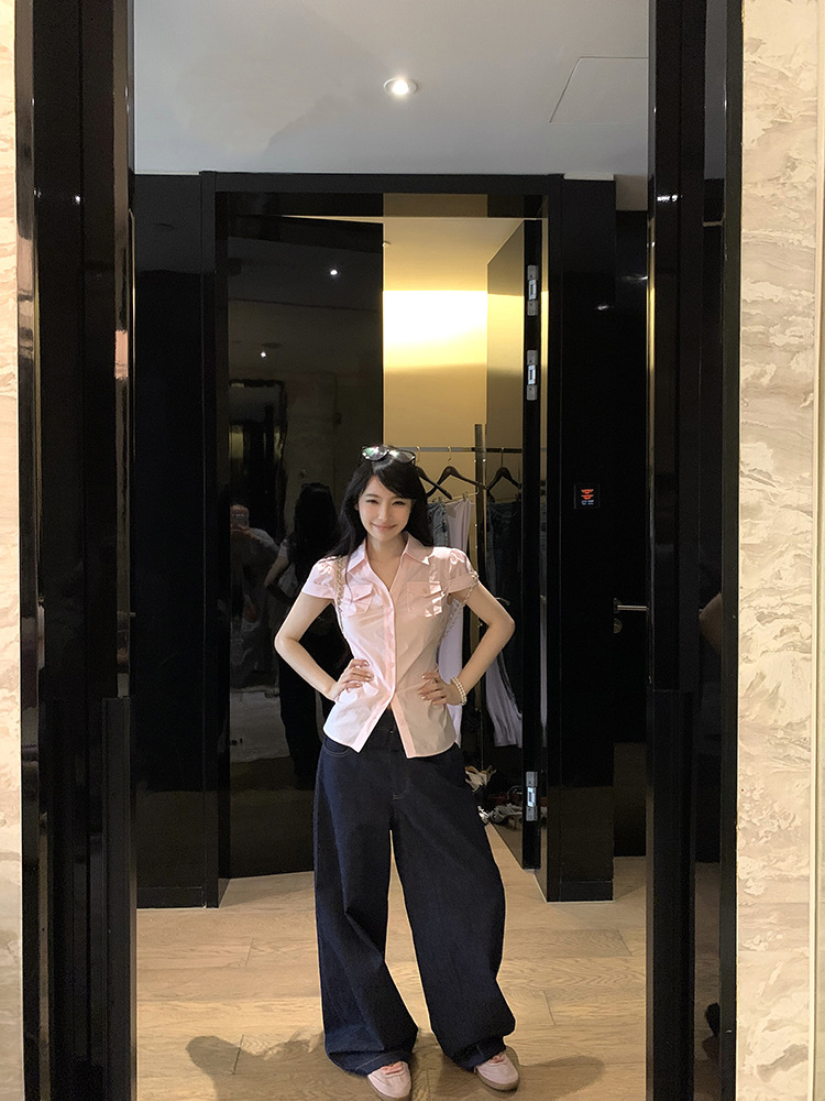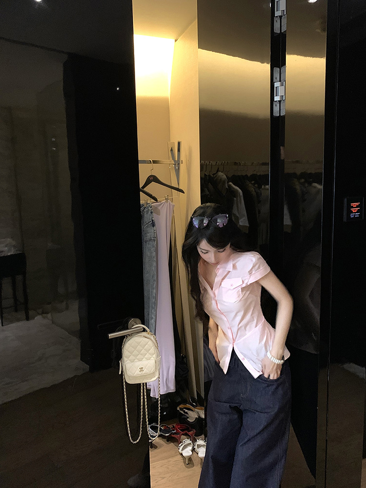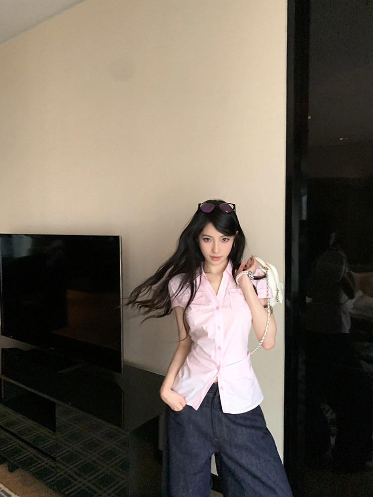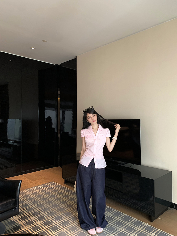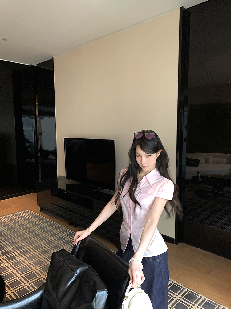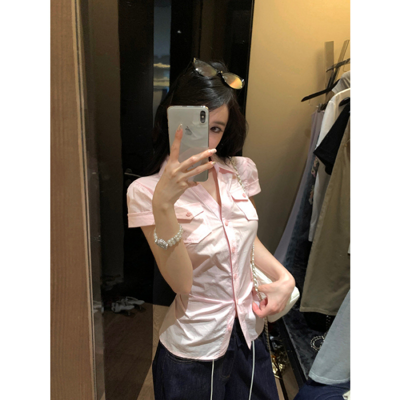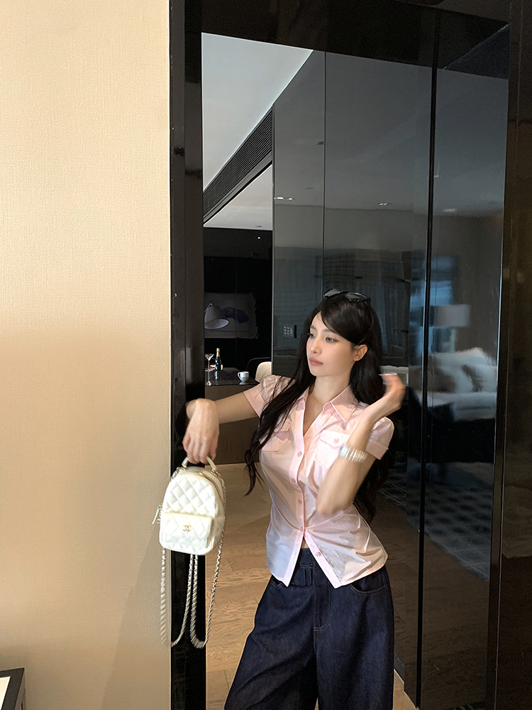 도매 [오리지널 체크 무늬] 여름 한국 스타일 허리 셔츠 디자인의 여성용 블루 체크 무늬 반팔 셔츠스토어 가기