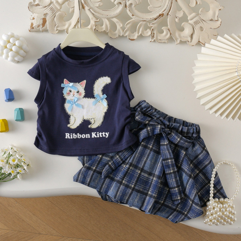2025 새로운 여름 한국 소녀 만화 허리 플라잉 슬리브 반팔 티셔츠 불규칙한 격자 무늬 스커트 투피스 세트스토어 가기