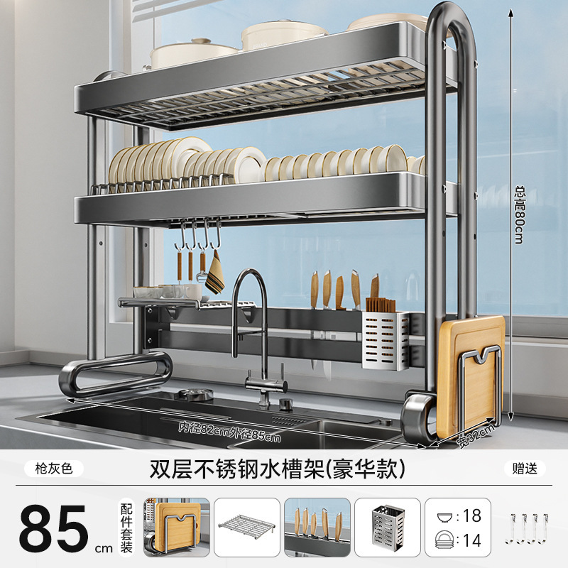 • [건그레이 스테인레스] 더블 레이어 85CM 컴플리트 세트 + 수납바구니 + 젓가락통 + 도마걸이 + 고리*4