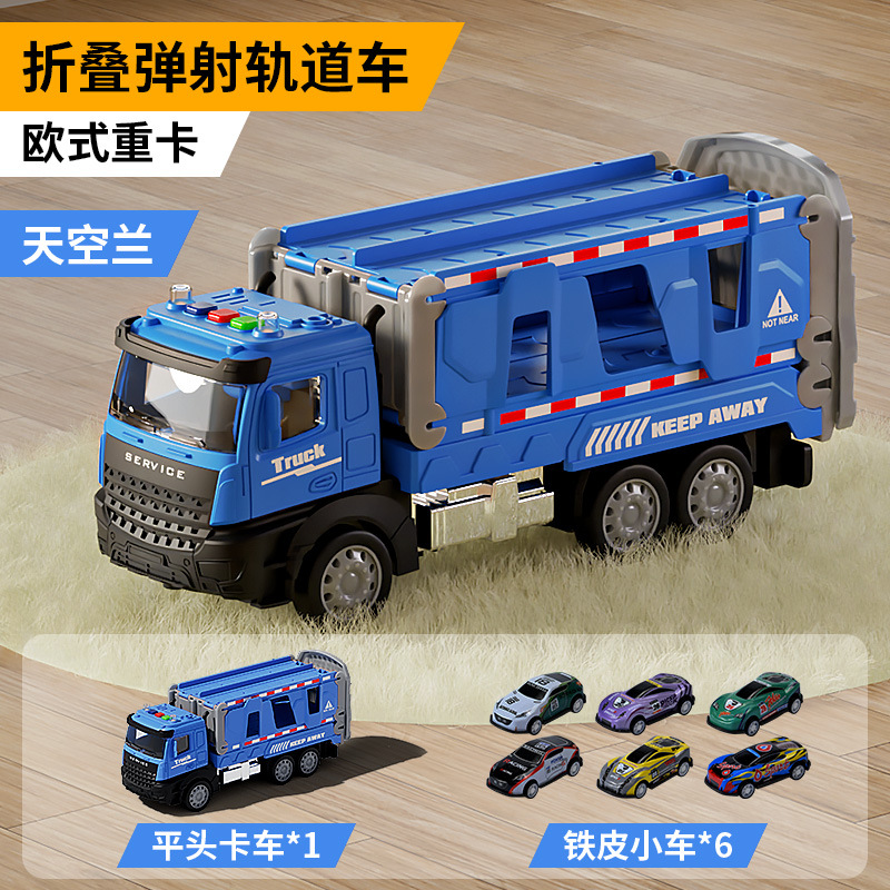 • 파란색 배출 컨테이너 트럭 + 주석 경주용 자동차 6대 [익스프레스 박스] A194-37