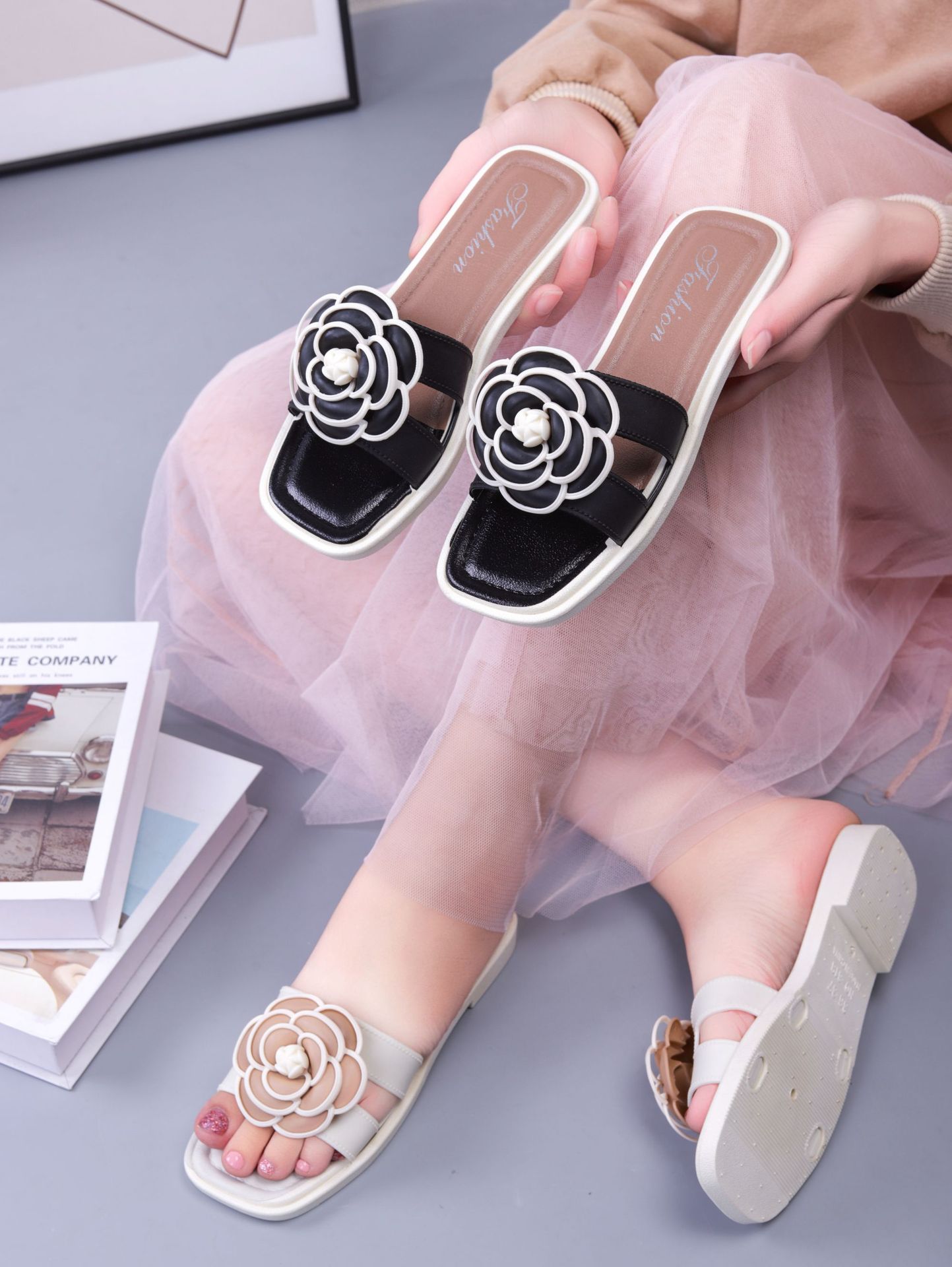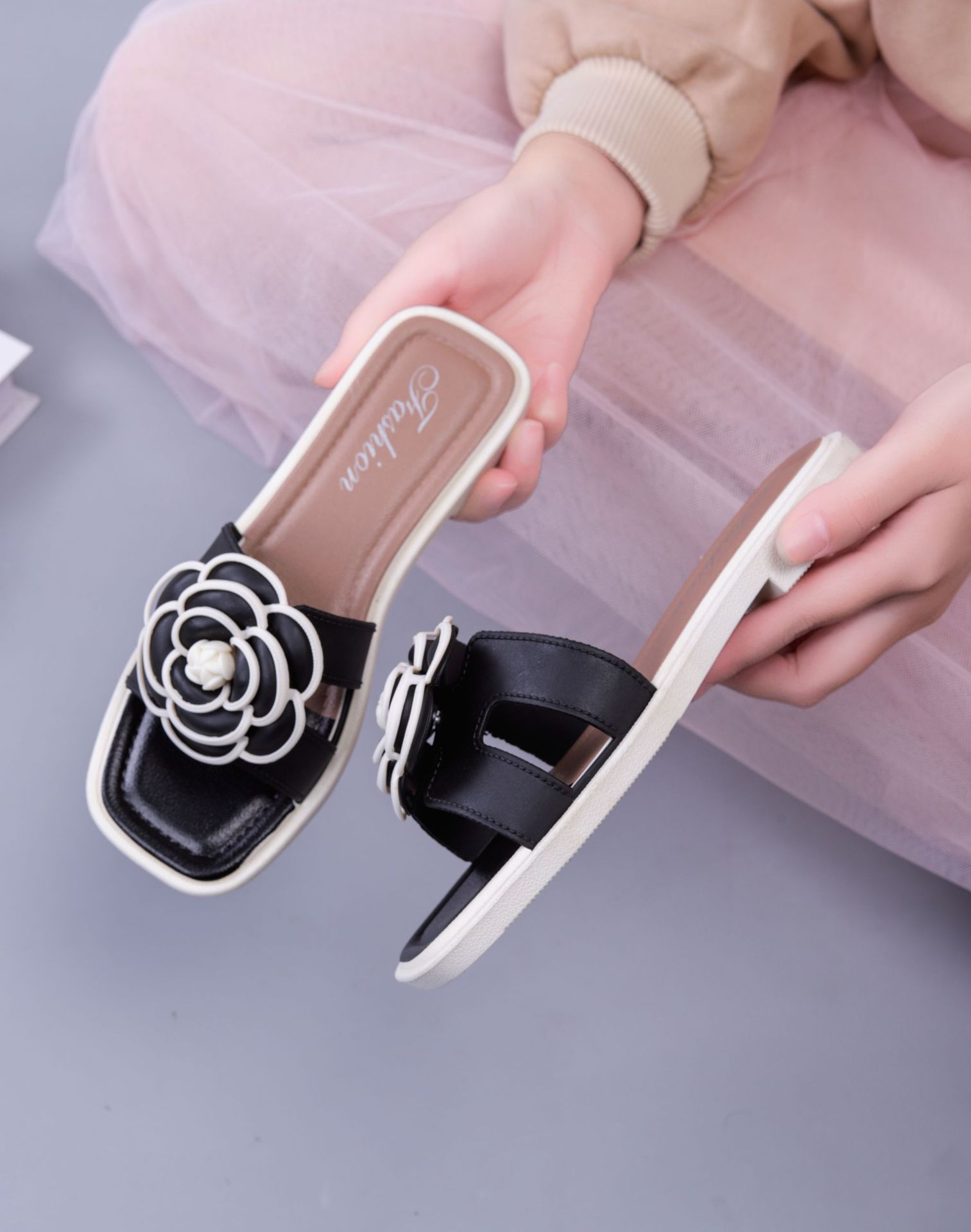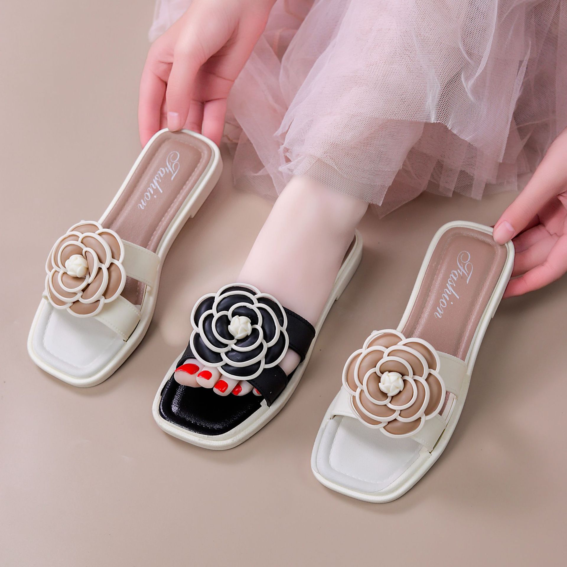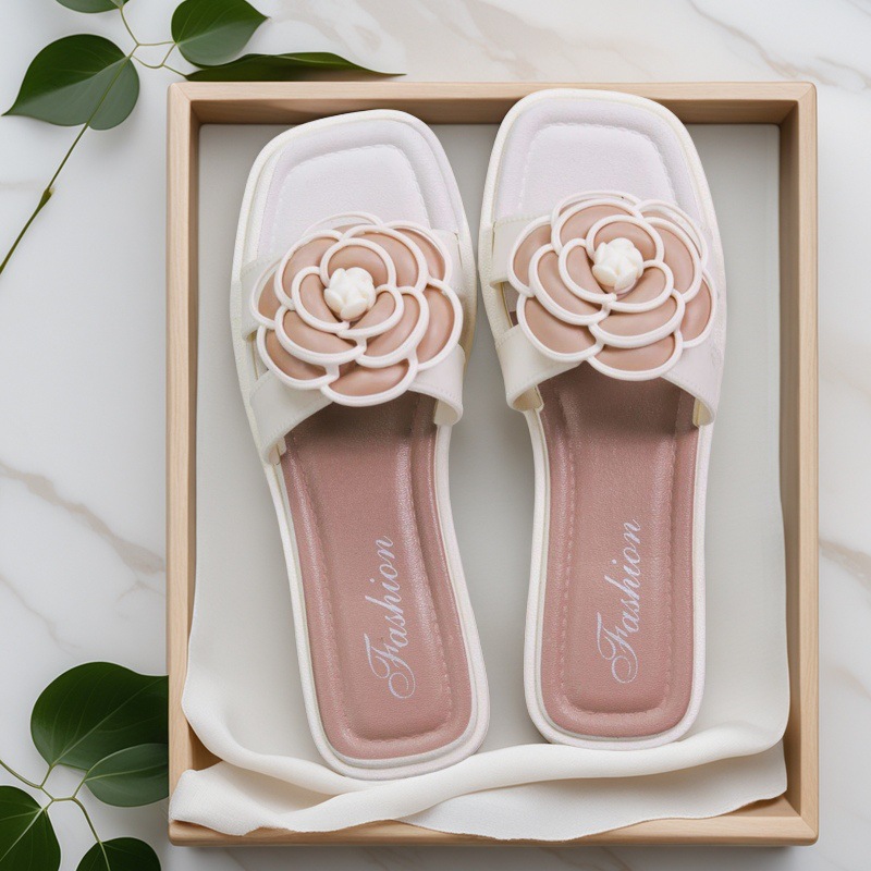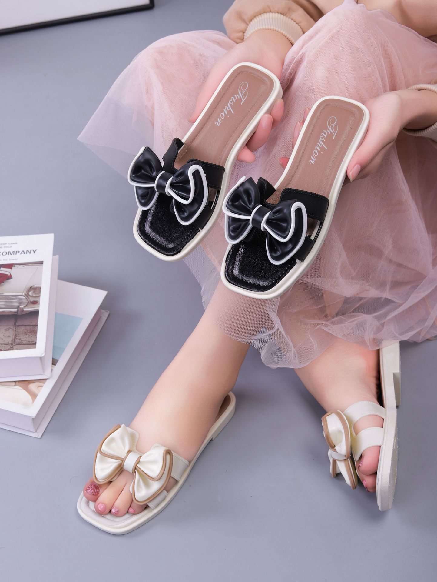 여성용 신상 슬리퍼, 부드러운 밑창, 크로스보더 패션, 여름 여성을 위한 미끄럼 방지 플랫 밑창 나비 사각 버클 샌들스토어 가기