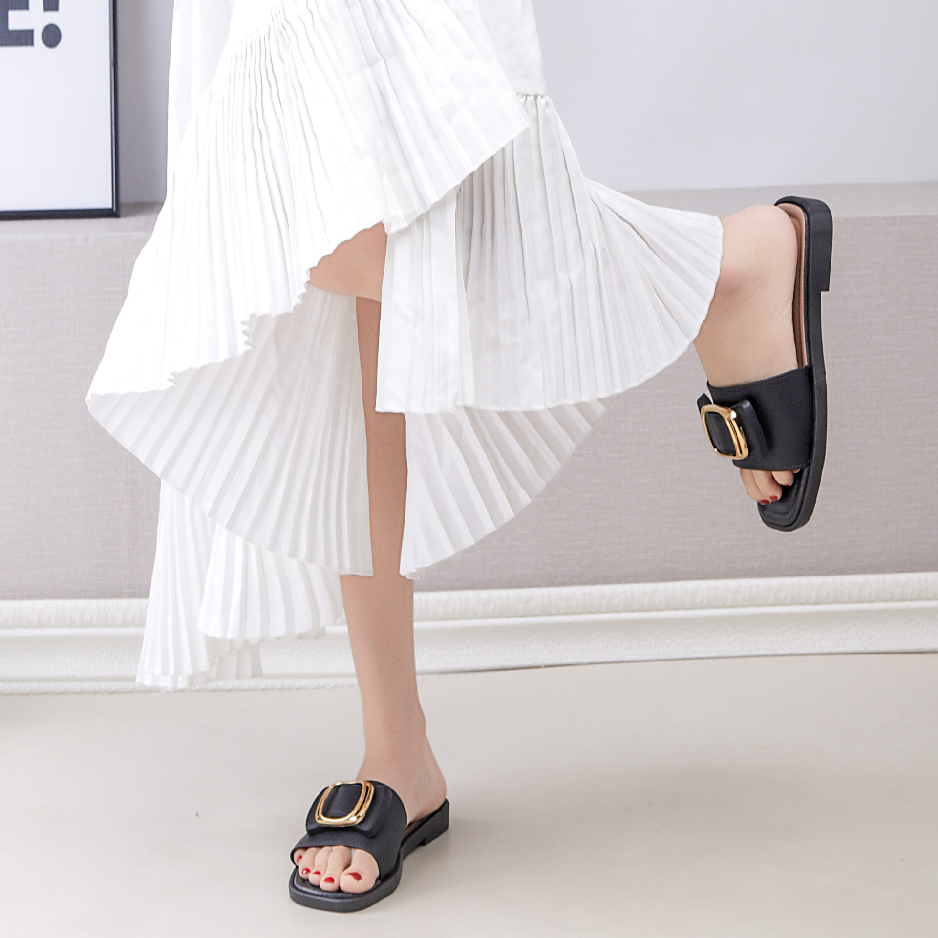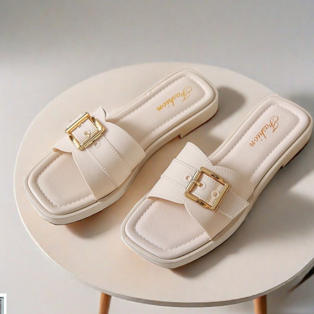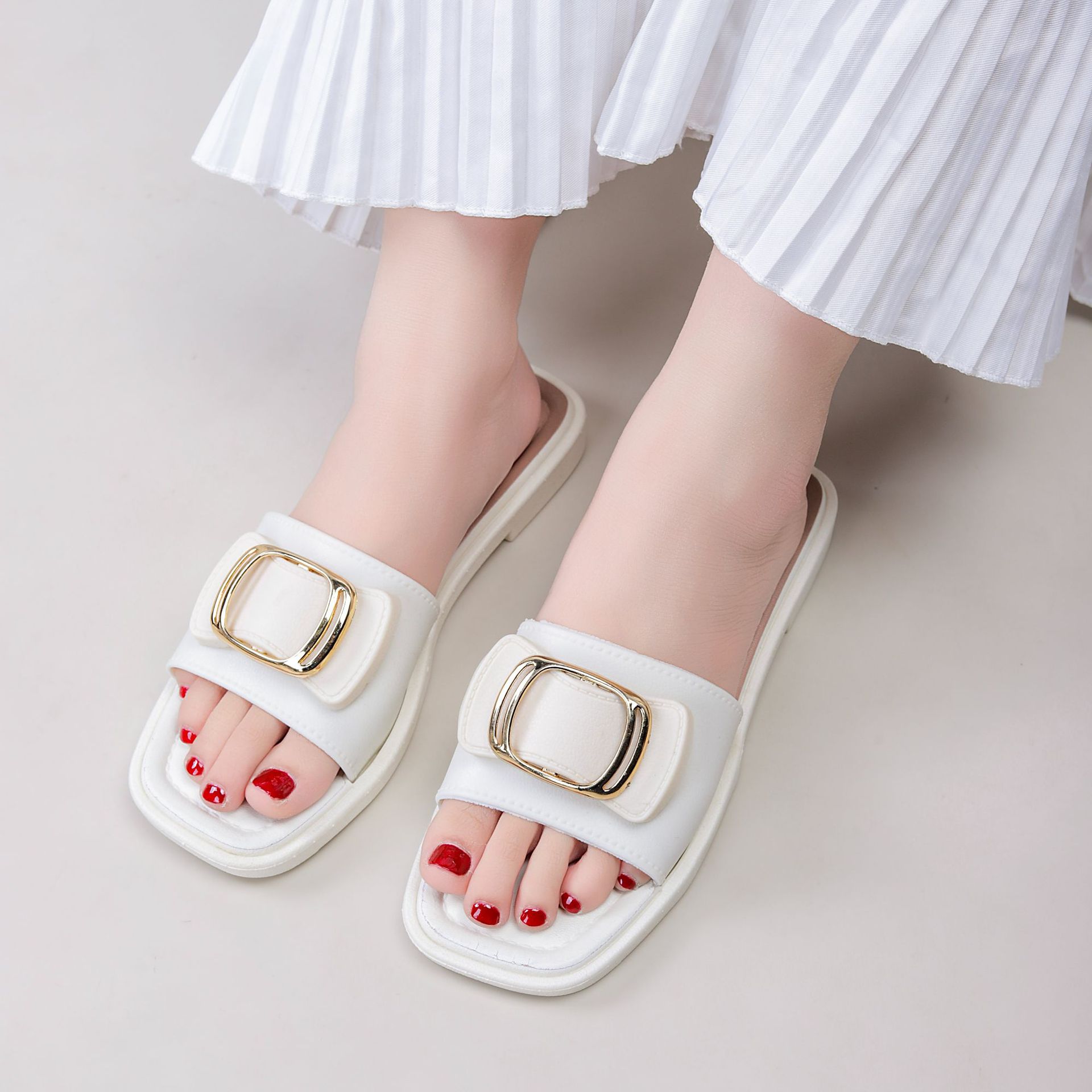 여성용 신상 슬리퍼, 부드러운 밑창, 크로스보더 패션, 여름 여성을 위한 미끄럼 방지 플랫 밑창 나비 사각 버클 샌들
