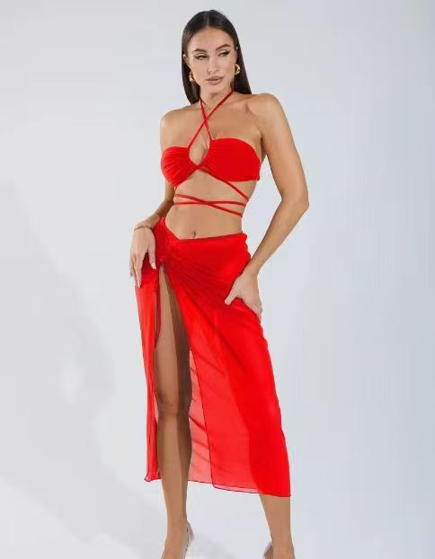 2025 유럽과 미국의 고급 비키니 스플릿 수영복 대외 무역 섹시한 허리 노출 3피스 수영복 롱 스커트 레이스 업 수영복 러시아스토어 가기