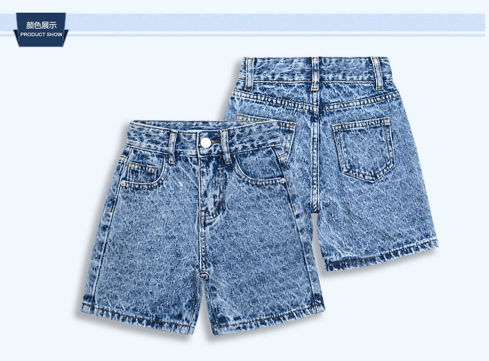 대외 무역 아동 바지 공장 도매 여름 새로운 스타일 데님 반바지 아기 패션 후크 패턴 찢어진 데님 A 라인 반바지