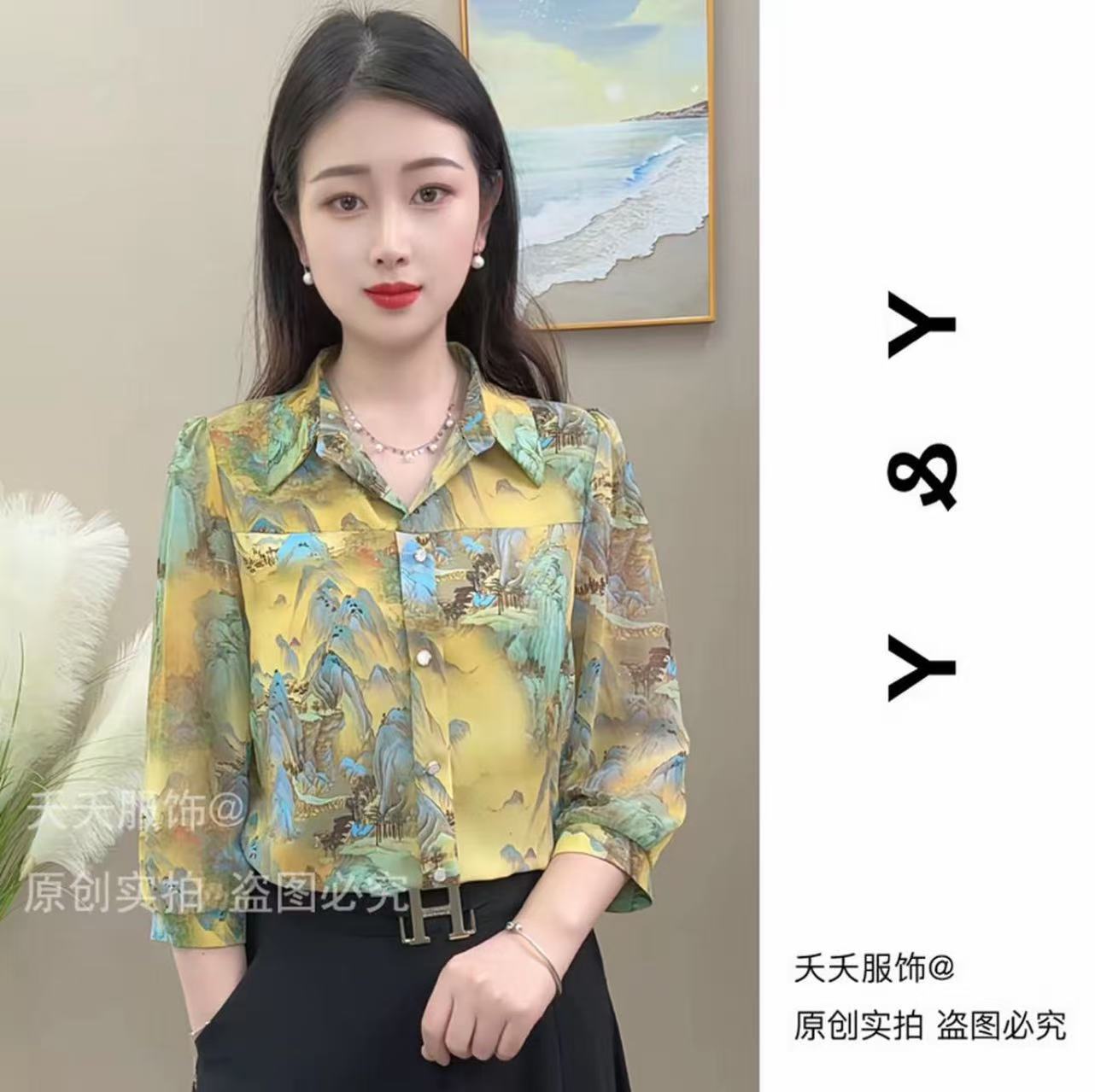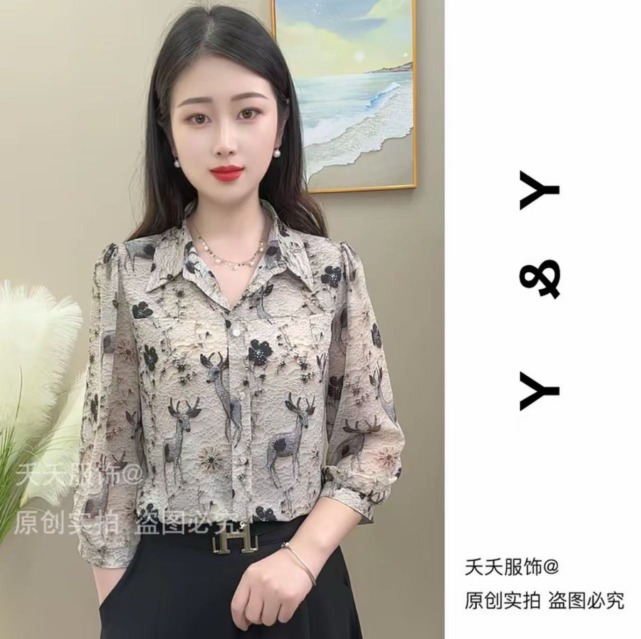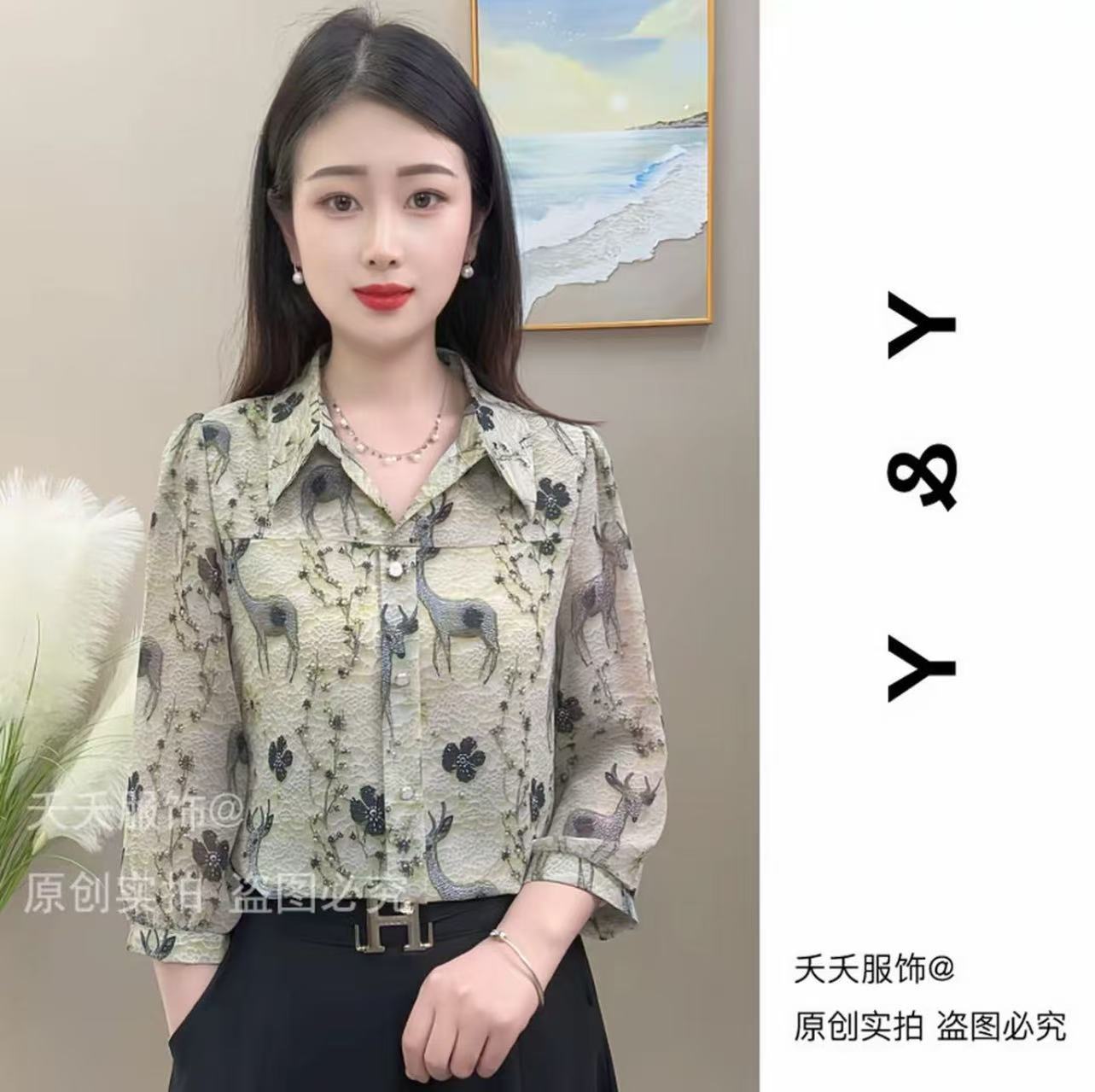 2025 새로운 여름 7부 소매 프린트 라펠 루즈 캐주얼 패션 셔츠 여성용 얇은 배 커버 셔츠스토어 가기