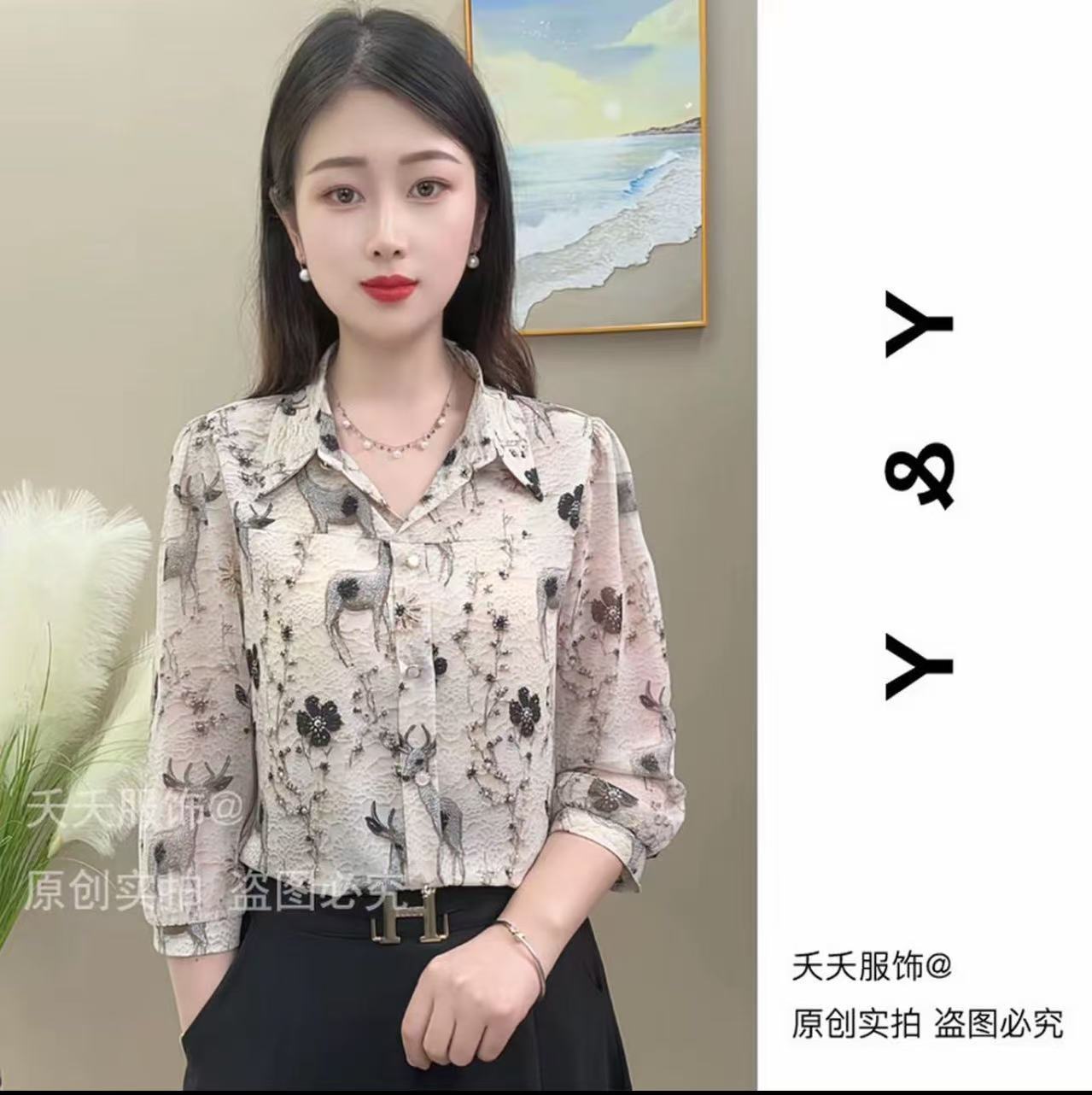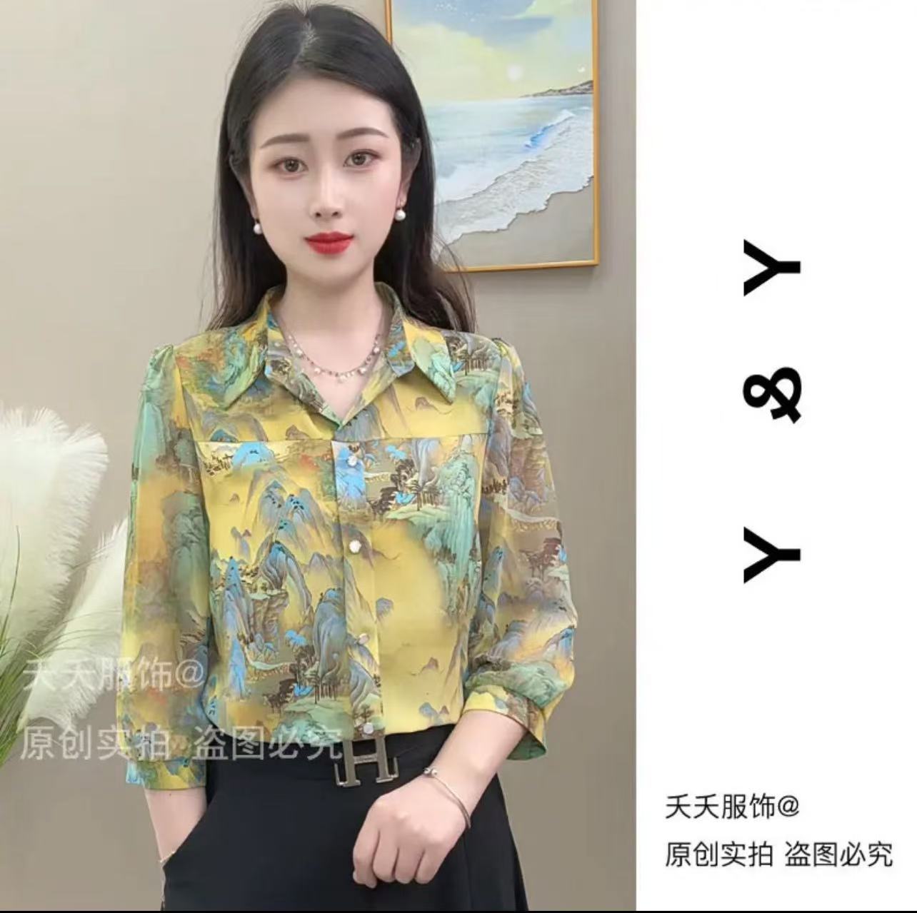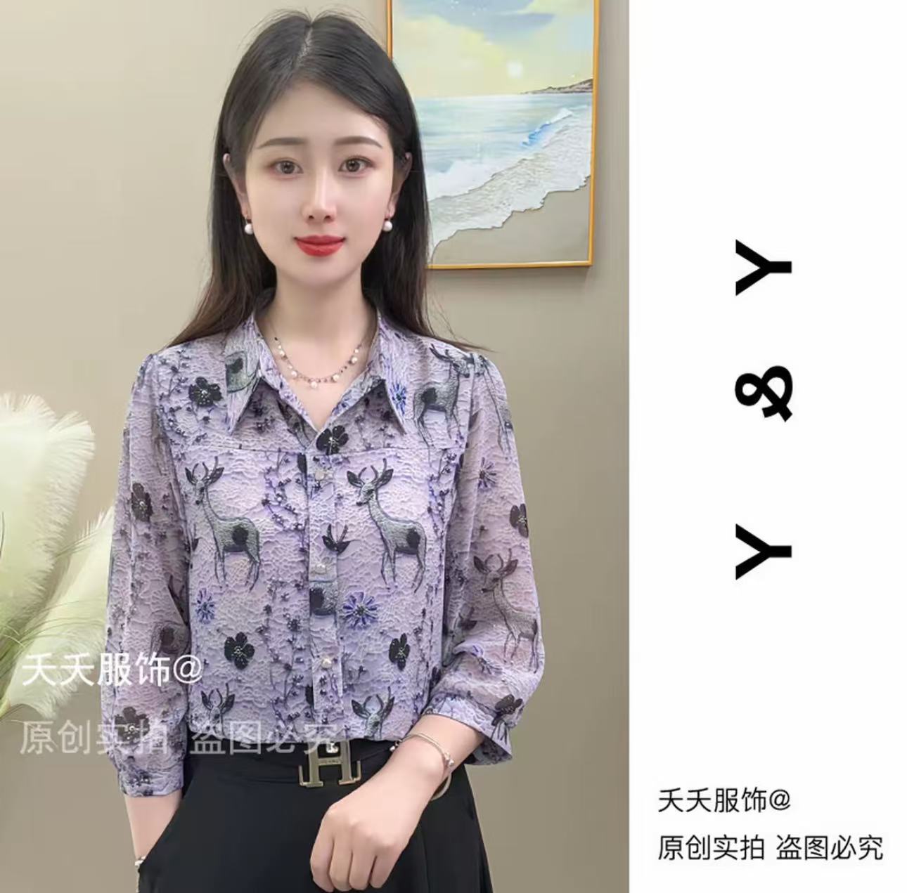 2025 새로운 여름 7부 소매 프린트 라펠 루즈 캐주얼 패션 셔츠 여성용 얇은 배 커버 셔츠스토어 가기