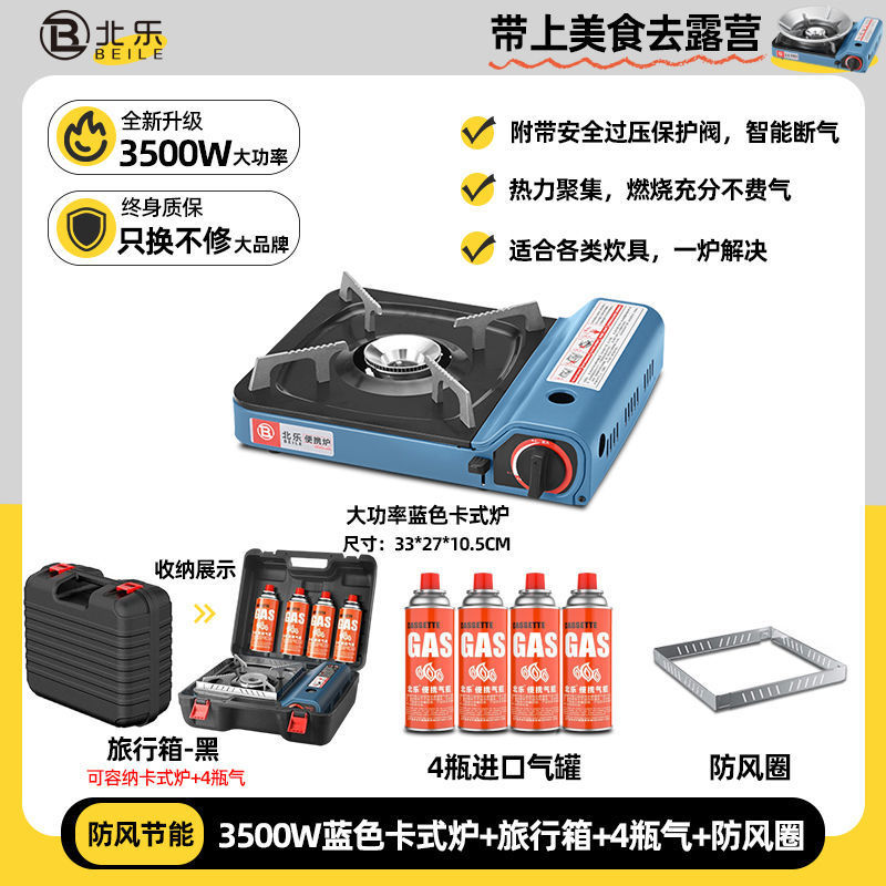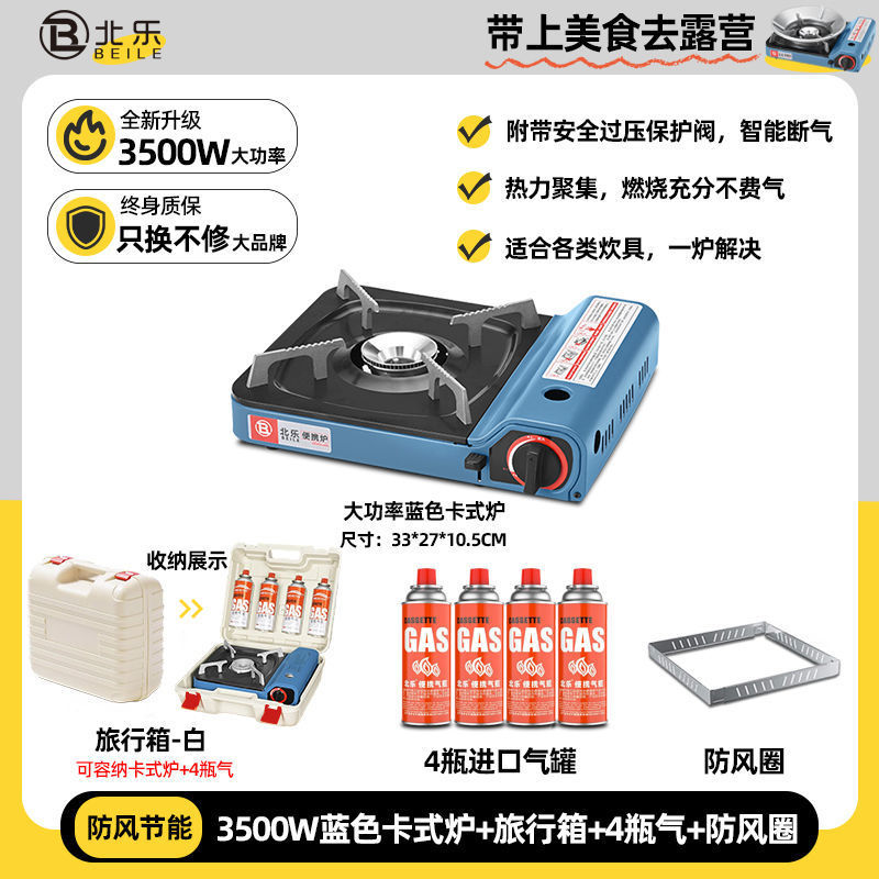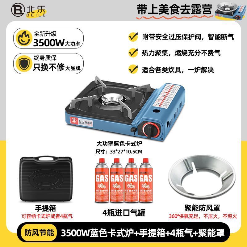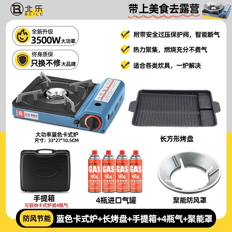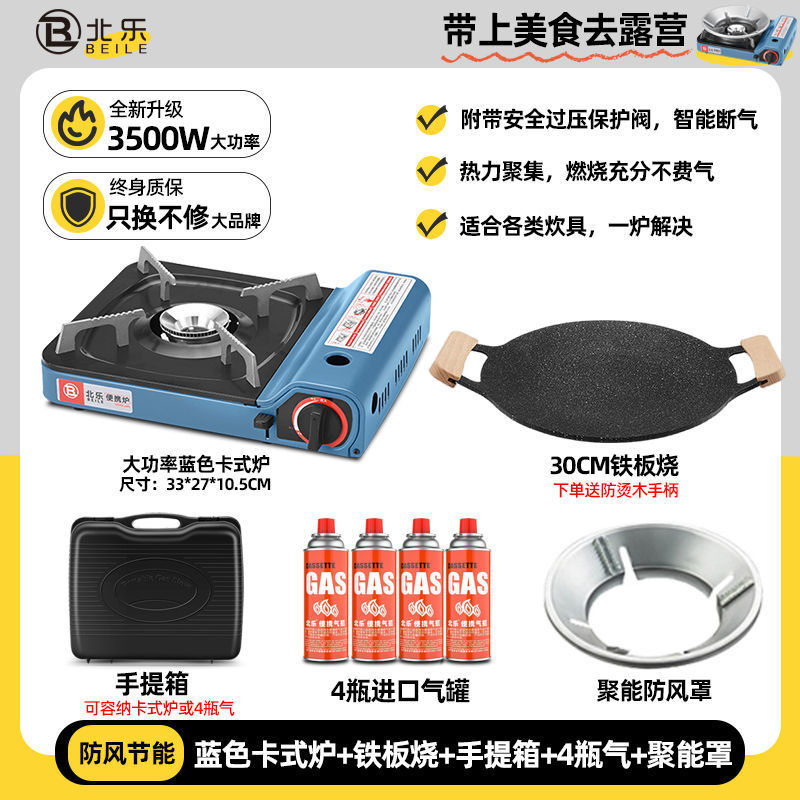 • 블루카드 스토브 + [철판 베이킹 팬] + 가스 4병 + 박스 + 에너지 수집 방풍 커버 - [진정한 방풍 에너지 수집] 새로 업그레이드된 3500W 블루 카드 스토브