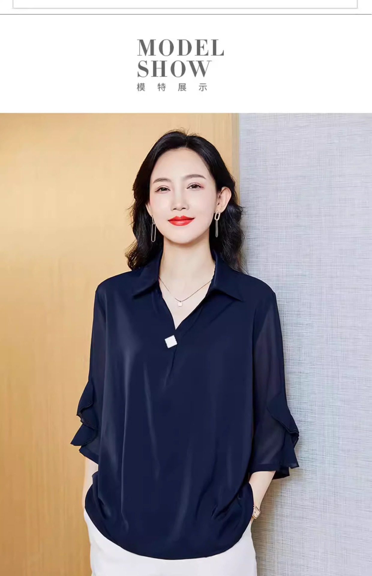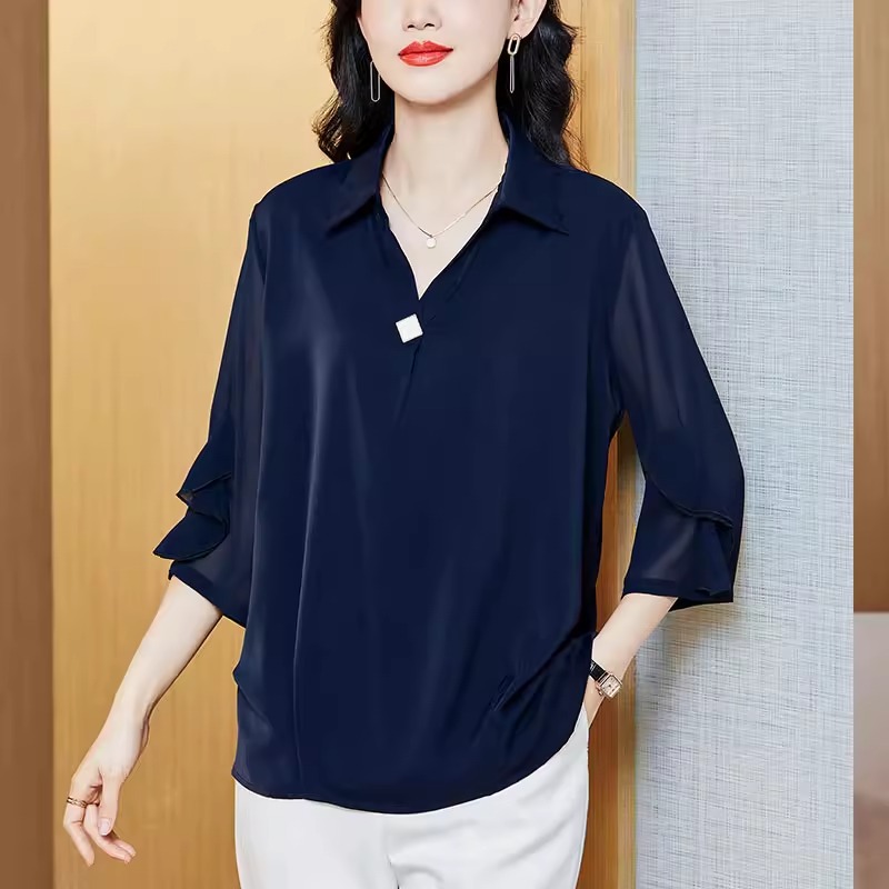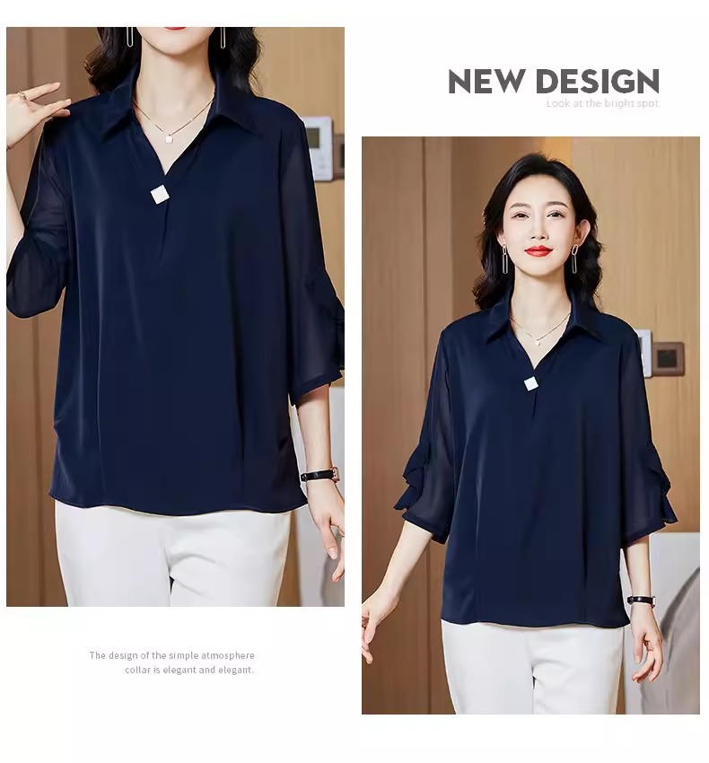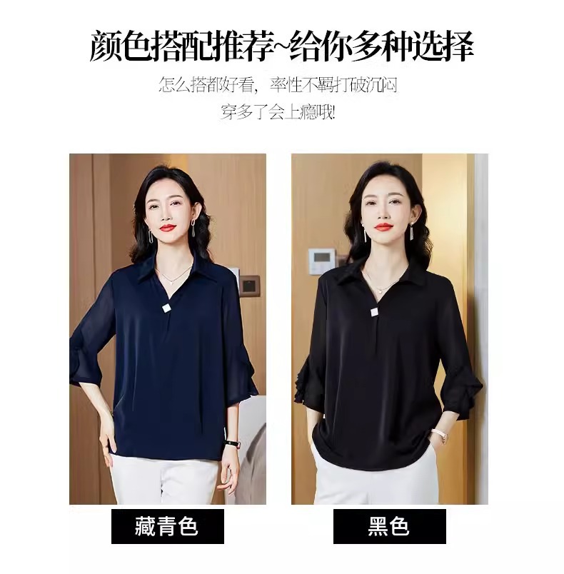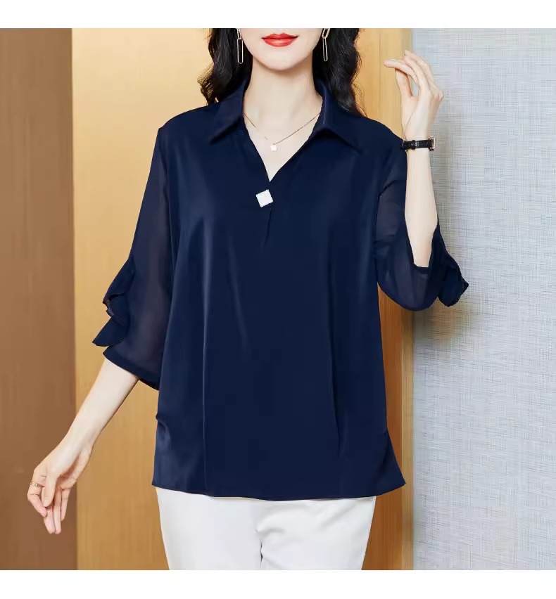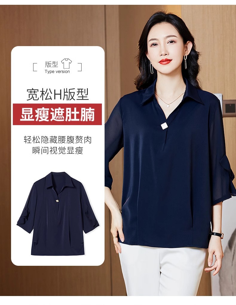 여성을위한 얼음 실크 반팔 쉬폰 셔츠 2025 새로운 여름 대형 스타일 중년 어머니 기질 하이 엔드 솔리드 컬러 탑