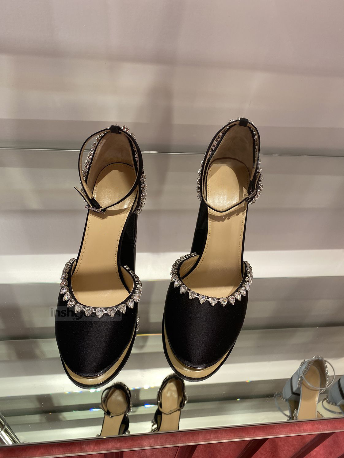MACH 같은 스타일의 얕은 입 둥근 발가락 중공 신발 2025 봄과 가을 새로운 스타일의 라인스톤 원 스트랩 하이힐 여성용 두꺼운 굽
