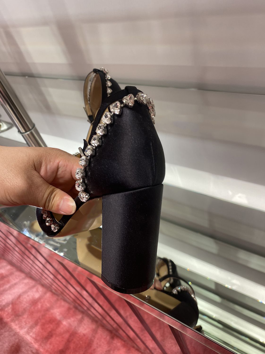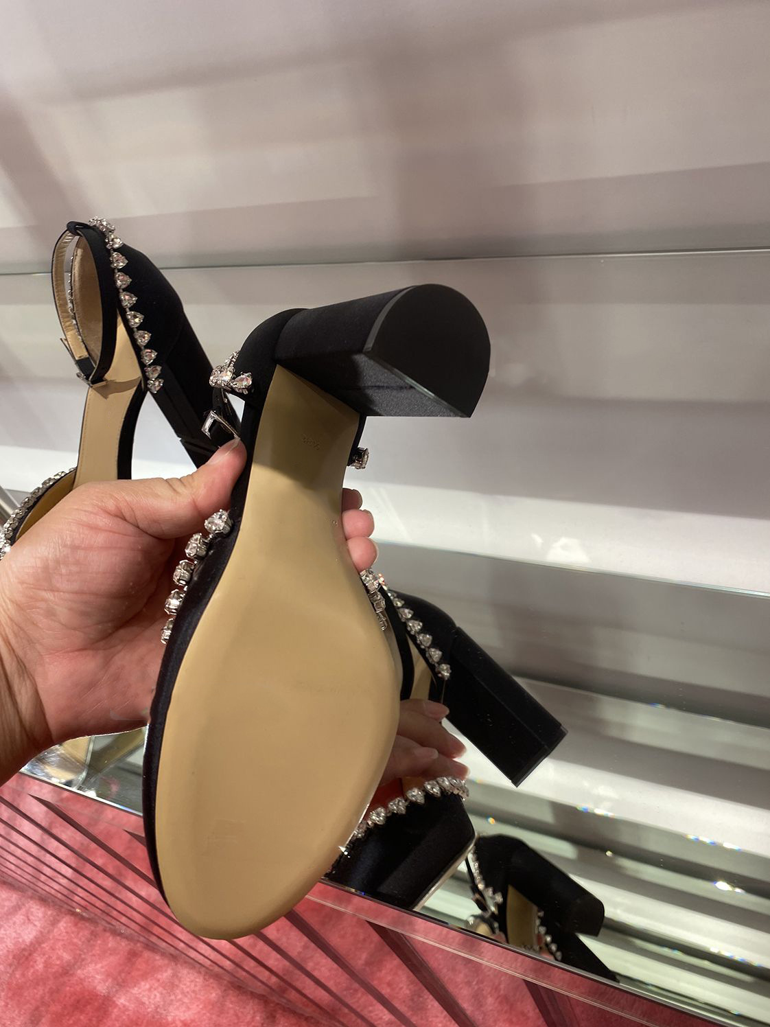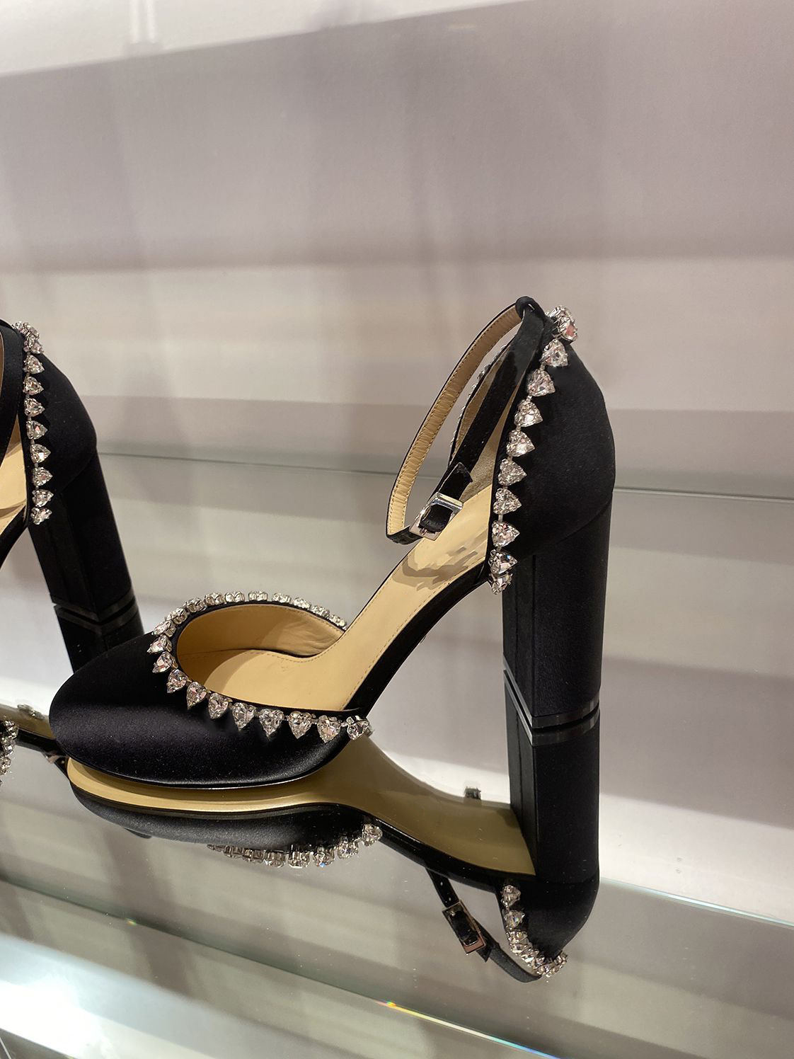 MACH 같은 스타일의 얕은 입 둥근 발가락 중공 신발 2025 봄과 가을 새로운 스타일의 라인스톤 원 스트랩 하이힐 여성용 두꺼운 굽스토어 가기