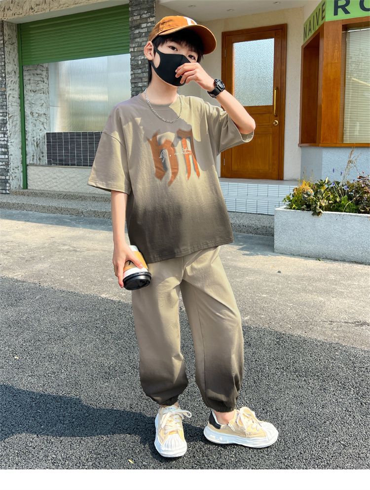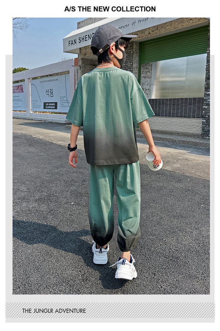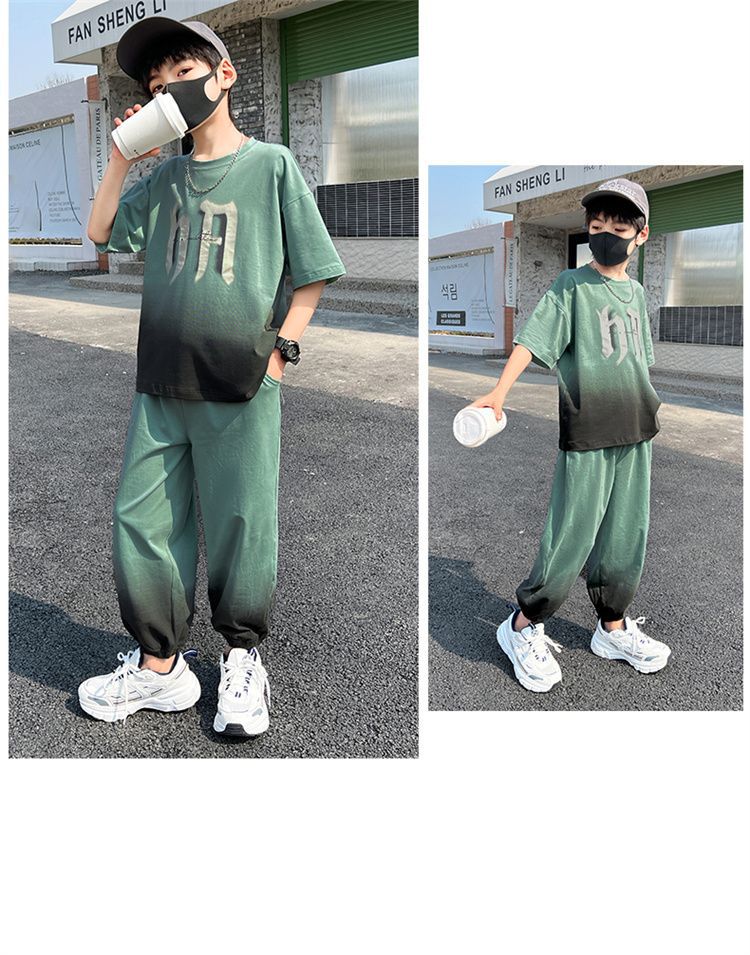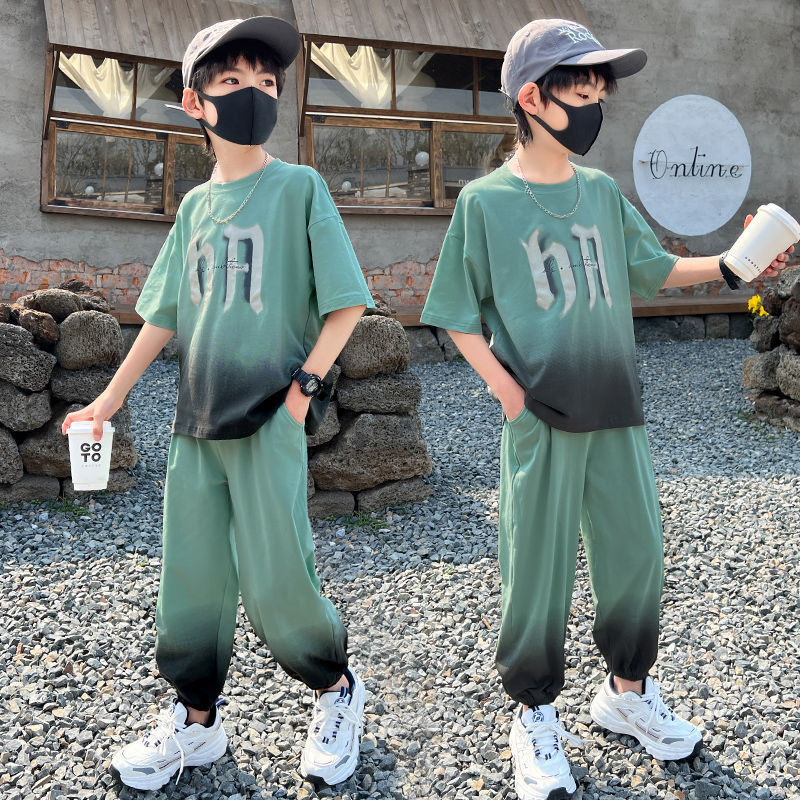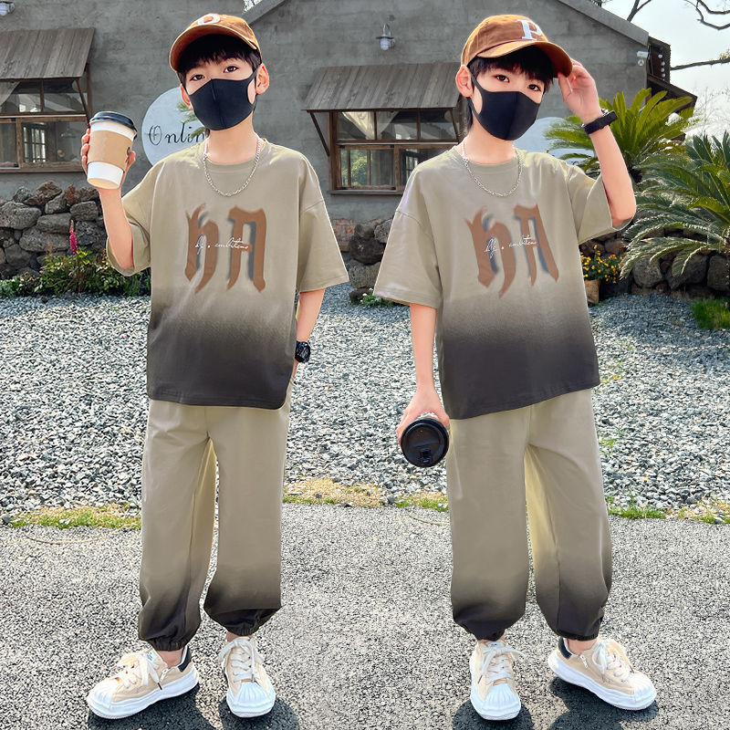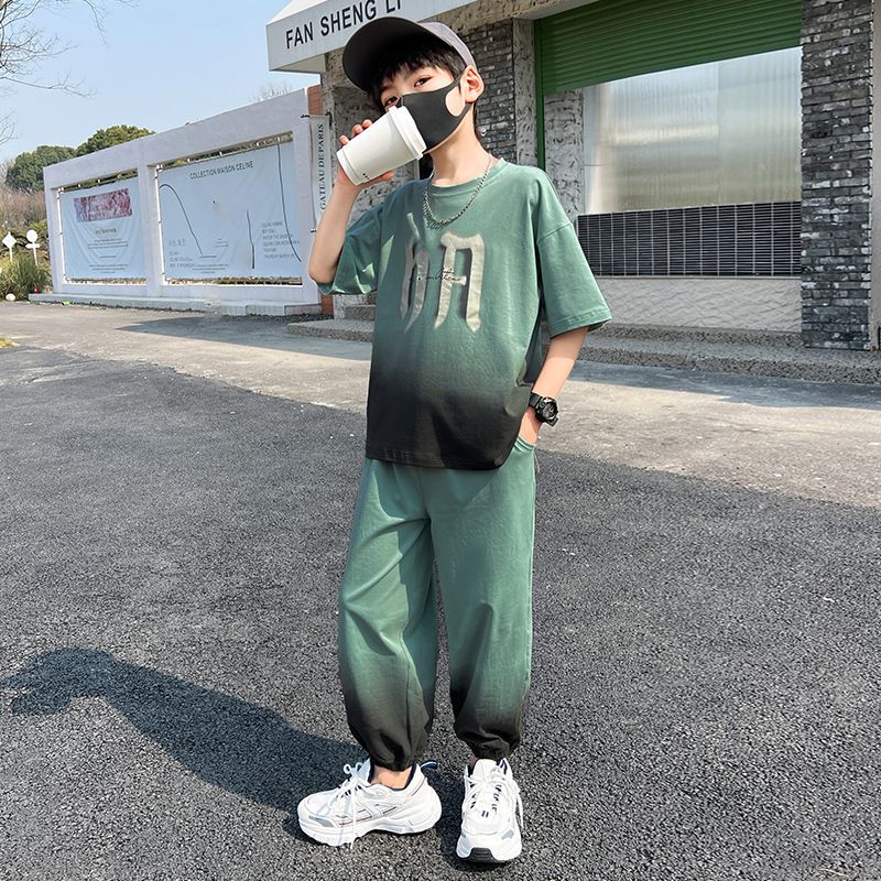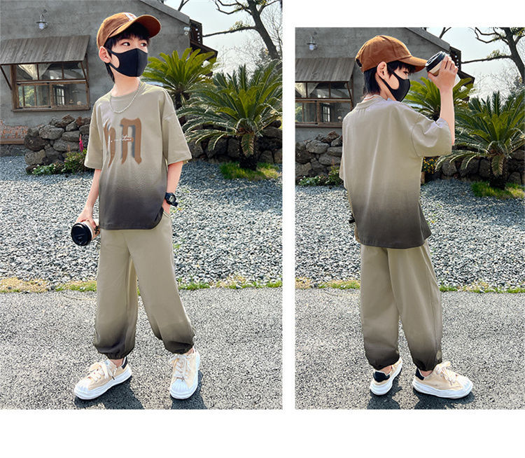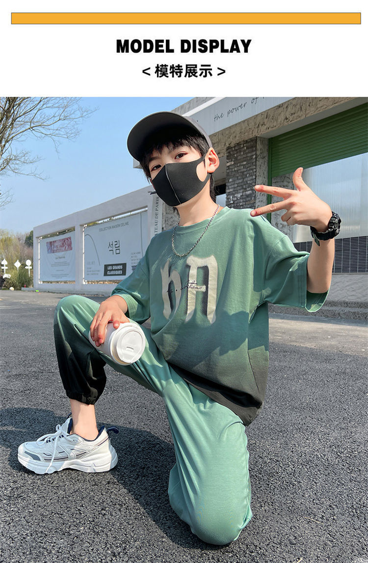 어린이 트렌디하고 멋진 여름 반팔 양복, 큰 어린이를 위한 패셔너블한 얇은 티셔츠, 루즈한 스포츠 바지 투피스 세트