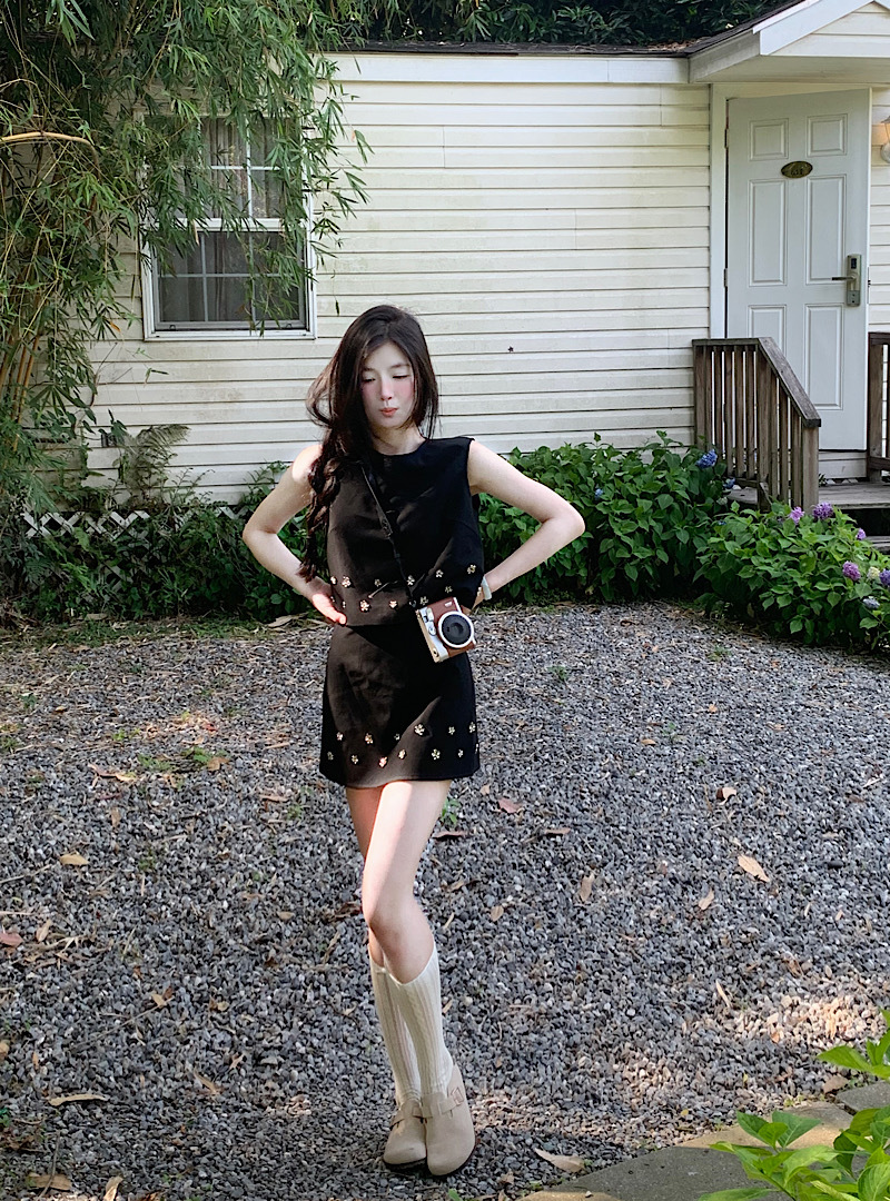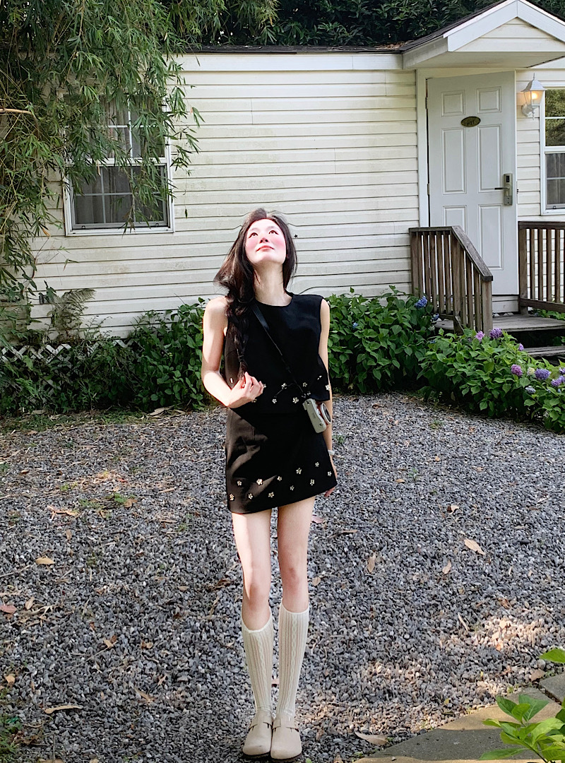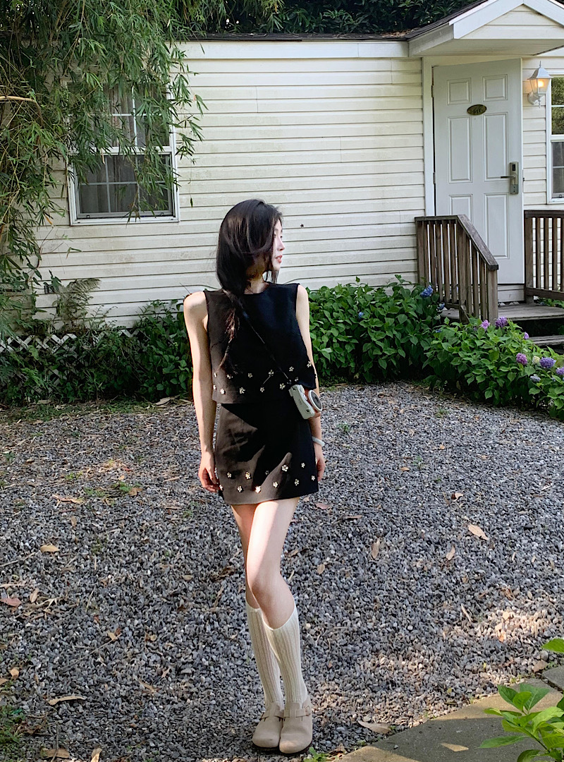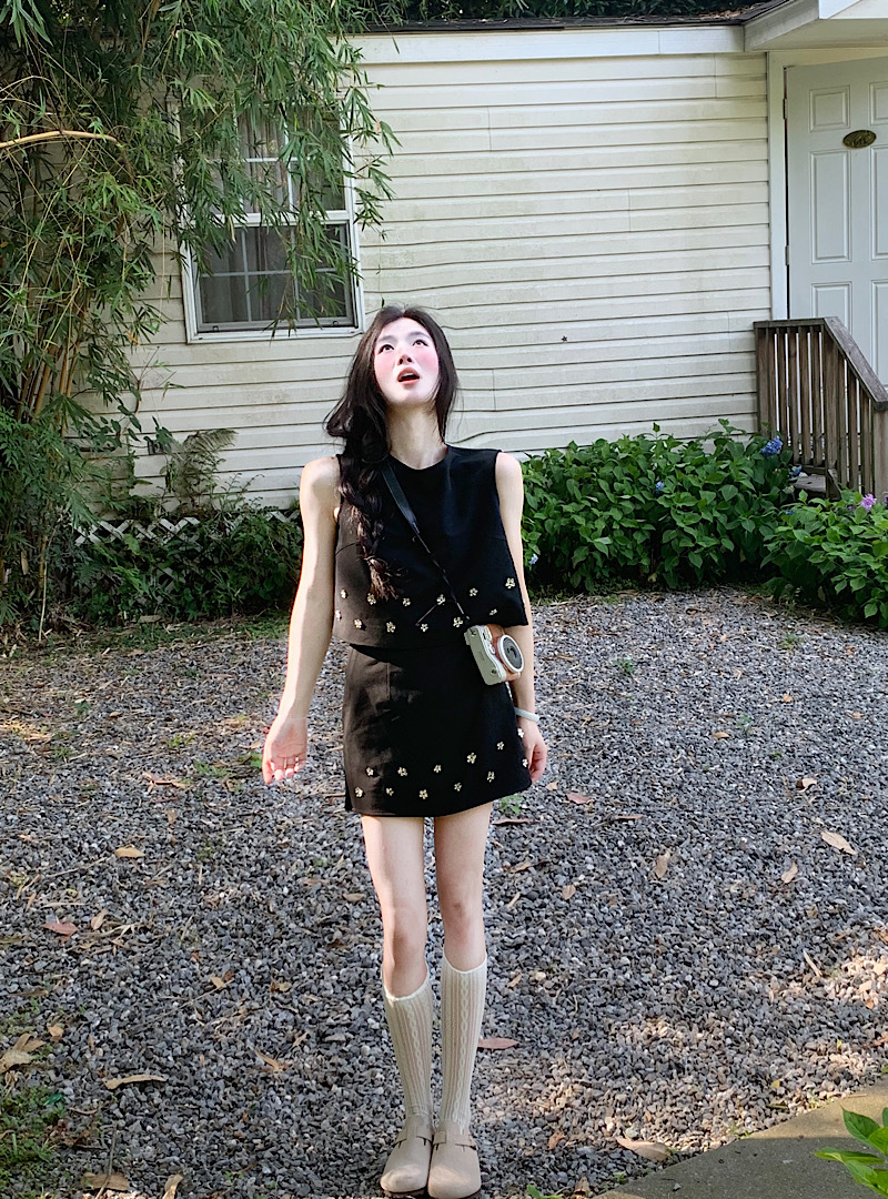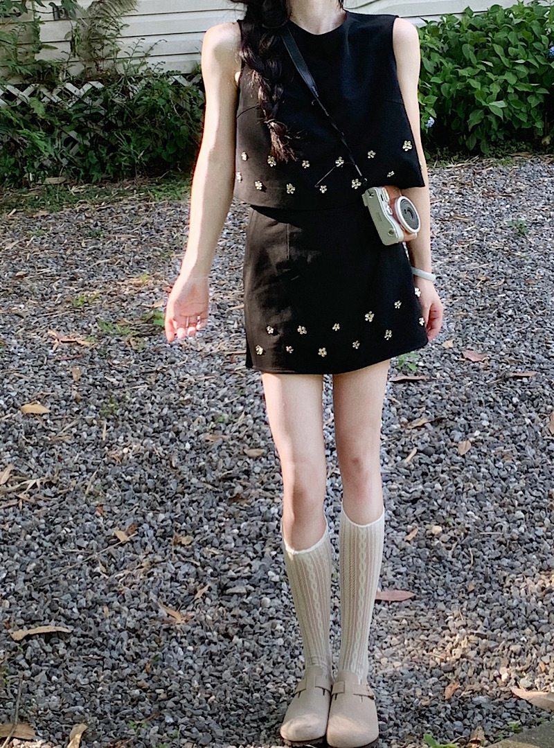 여성을위한 우아한 작은 향기로운 패션 정장 여름 2025 새로운 손으로 꿰맨 꽃 조끼 스트레이트 스커트 투피스 세트