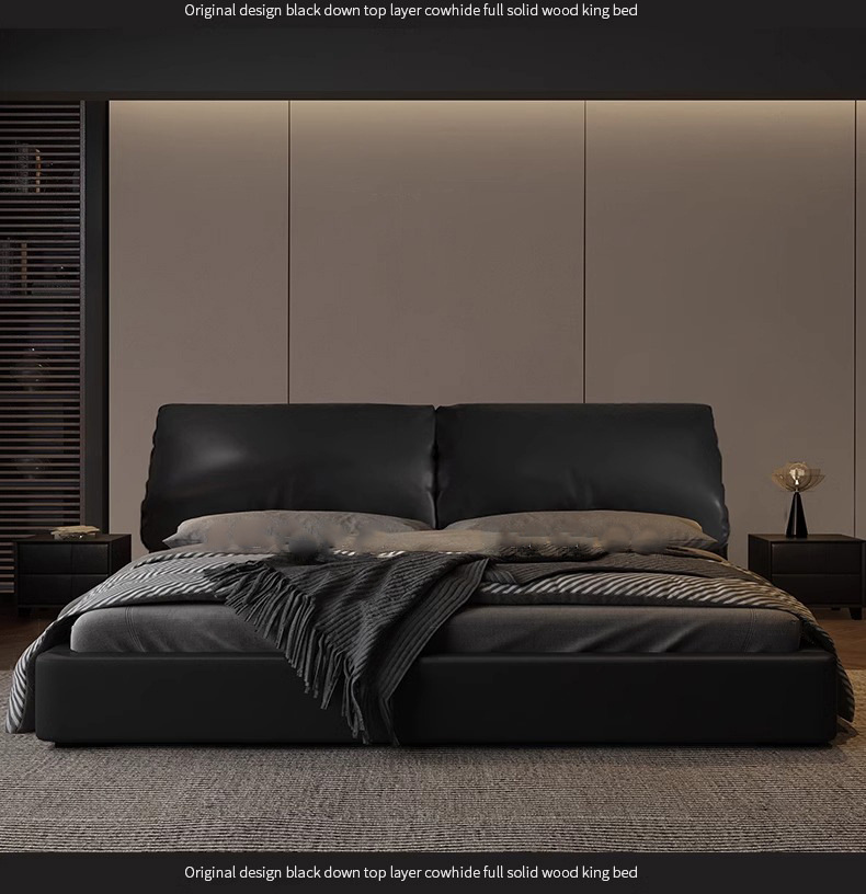 이탈리아 미니멀리스트 코끼리 귀 검은색 가죽 침대 바닥형 마스터 침실 고급스럽고 분위기 있는 더블 소프트백 웨딩 침대