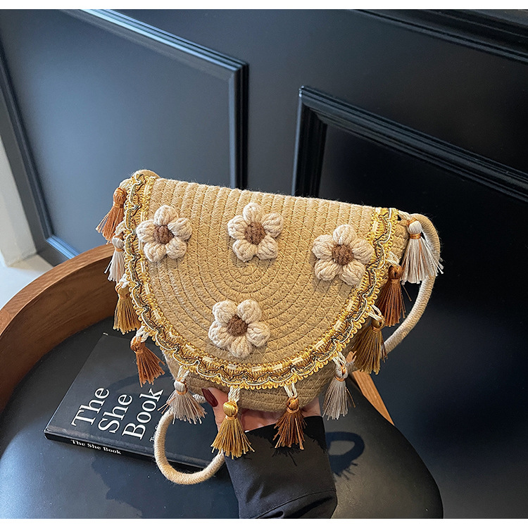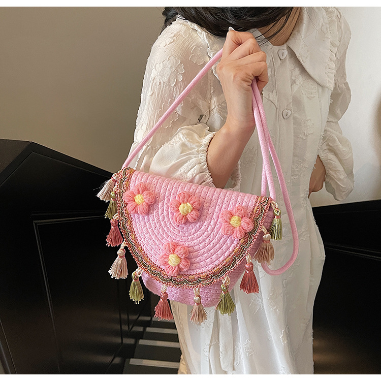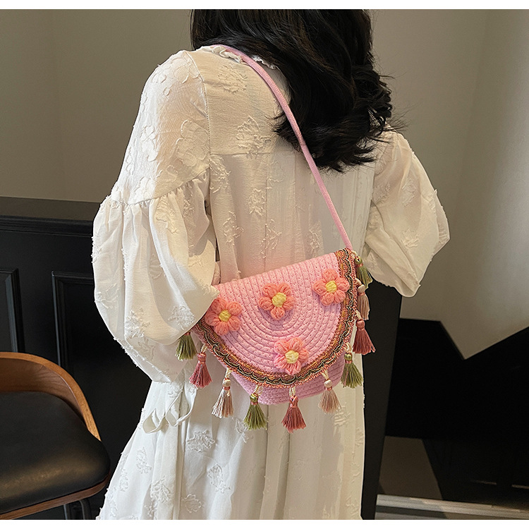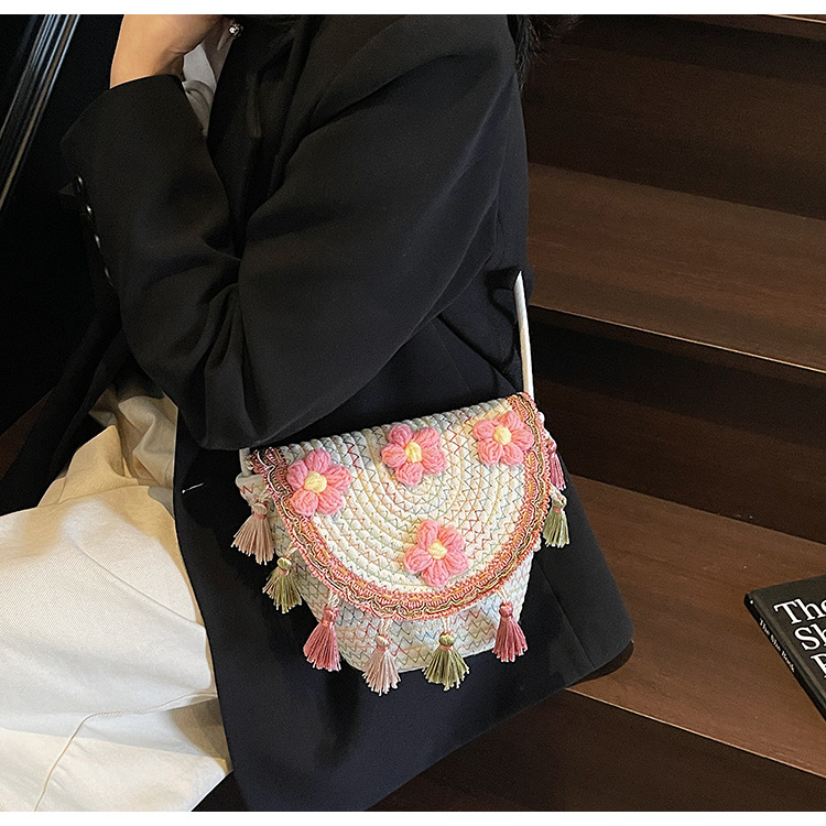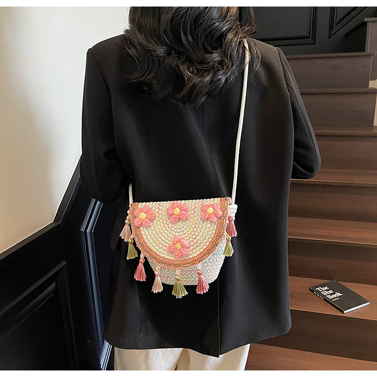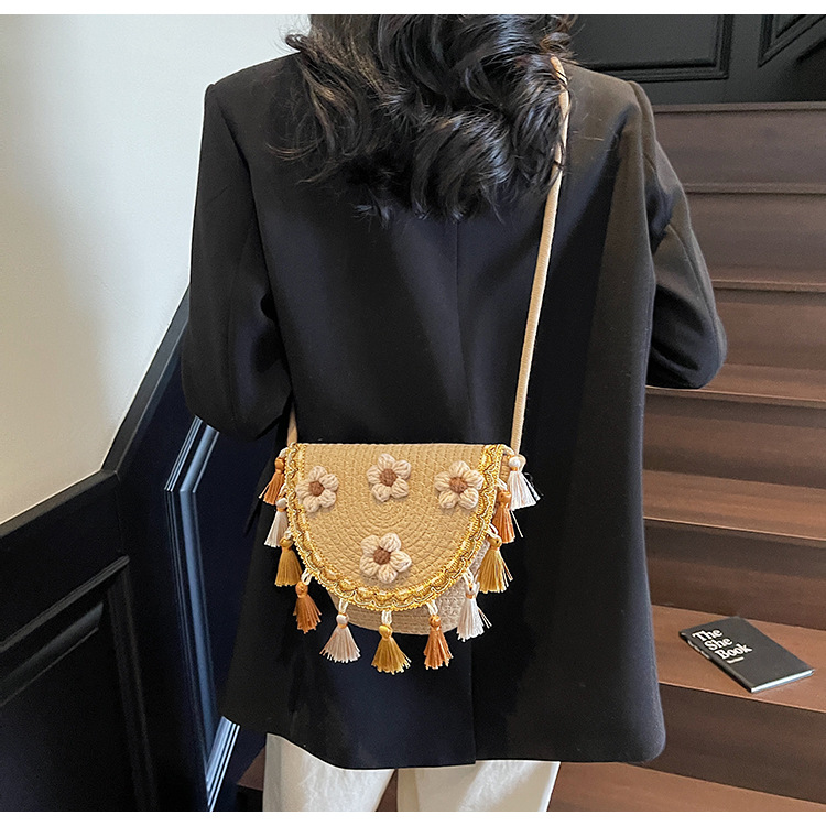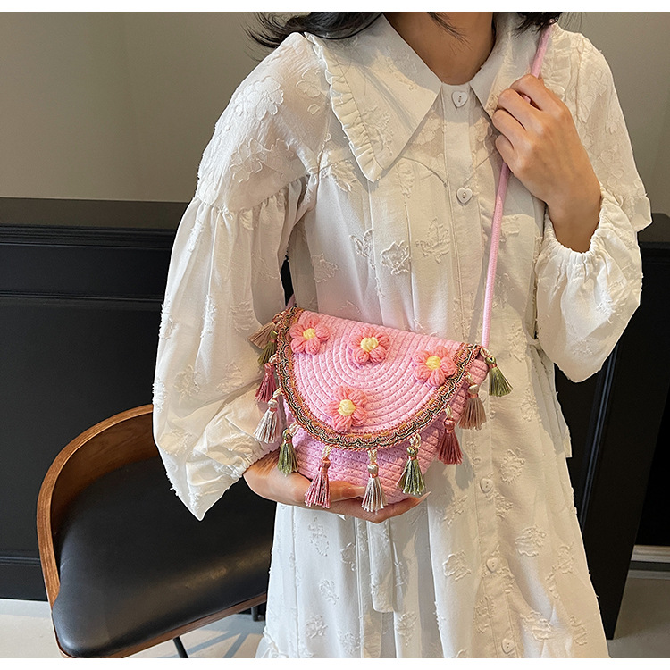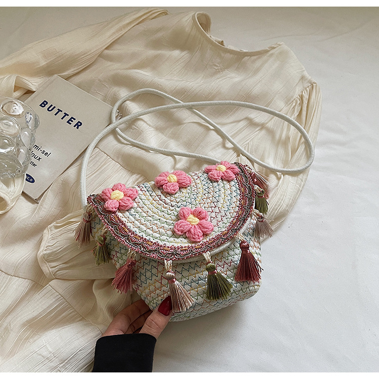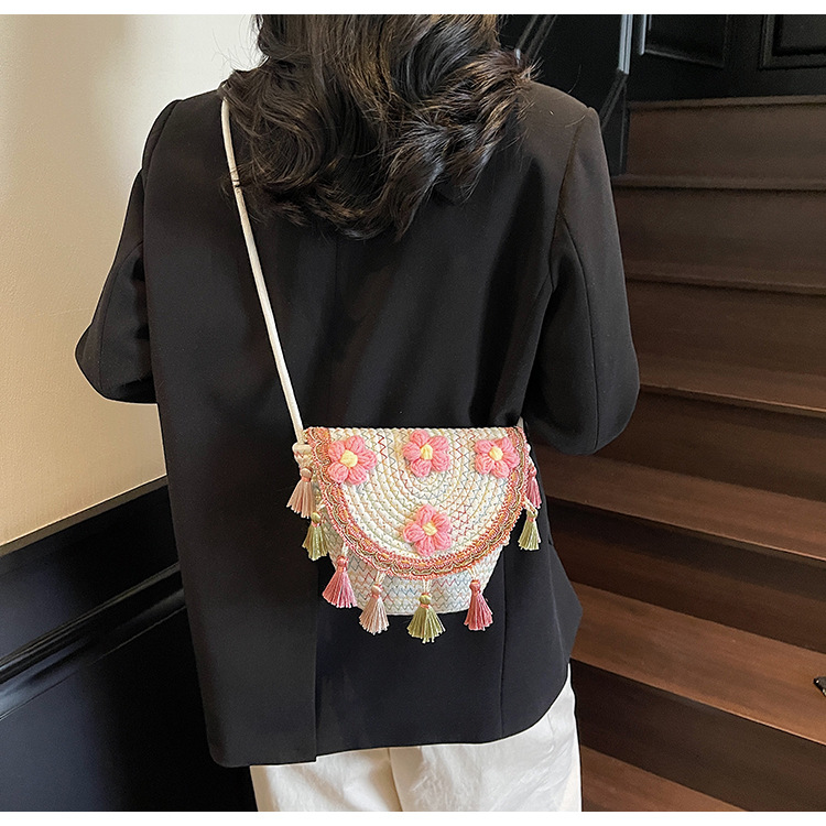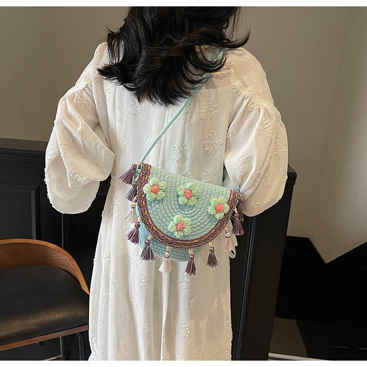 아름다운 꽃 수제 태슬 직조 에스닉 스타일 밀짚 패션 숄더백 작은 버킷 비치 휴가 크로스백스토어 가기