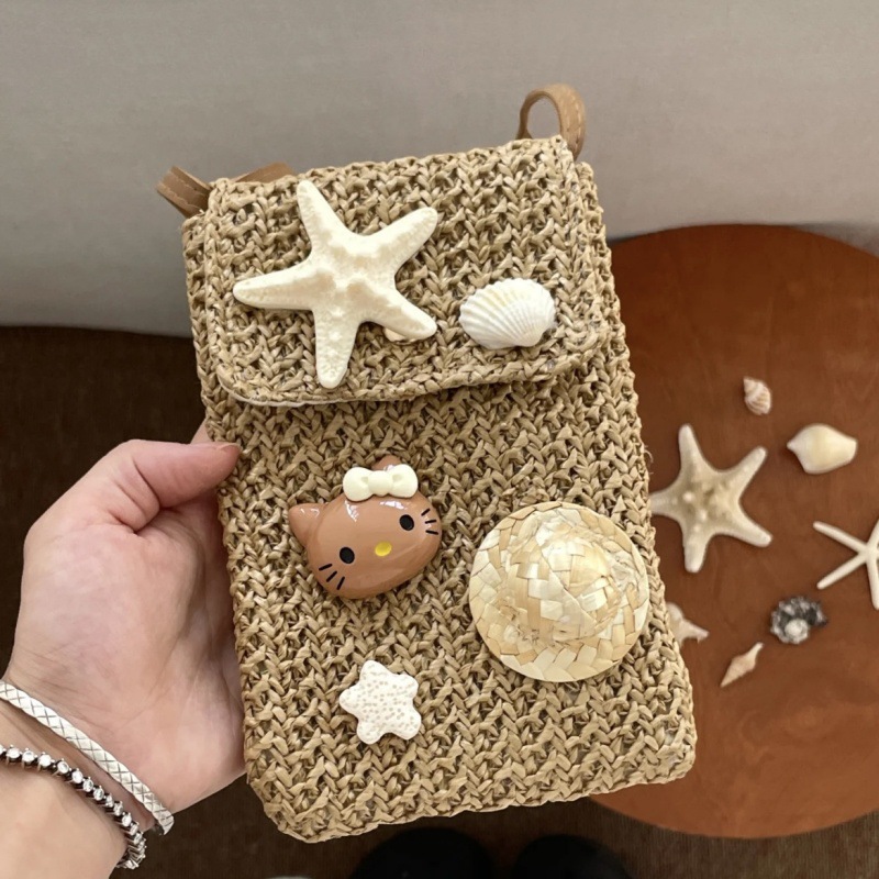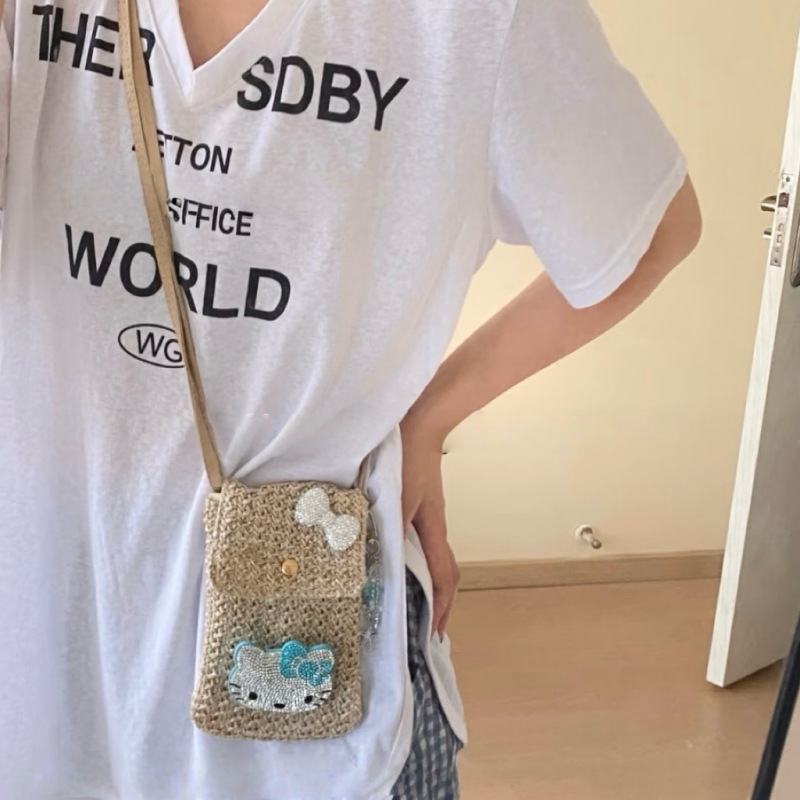 귀여운 쉘 헬로 키티 짠 휴대 전화 가방 여름 검은 가죽 kt 고양이 크로스 바디 백 해변 안경 카메라 가방