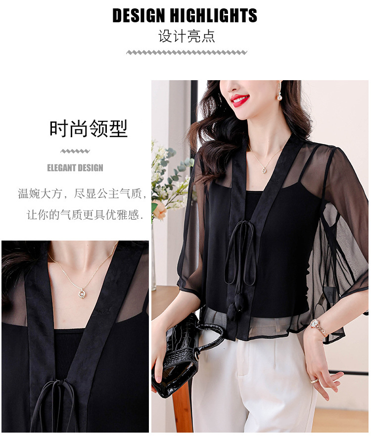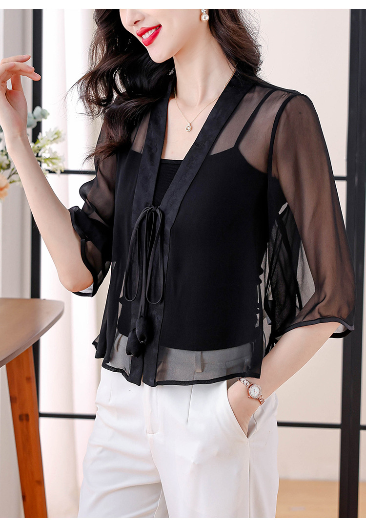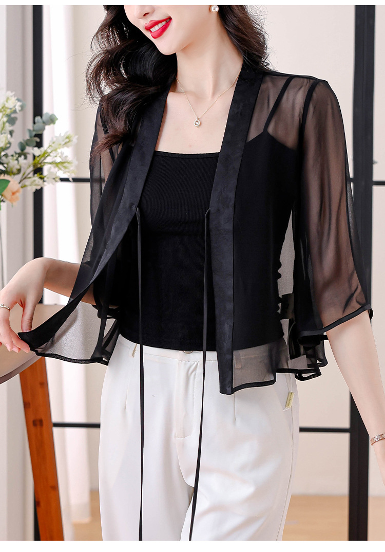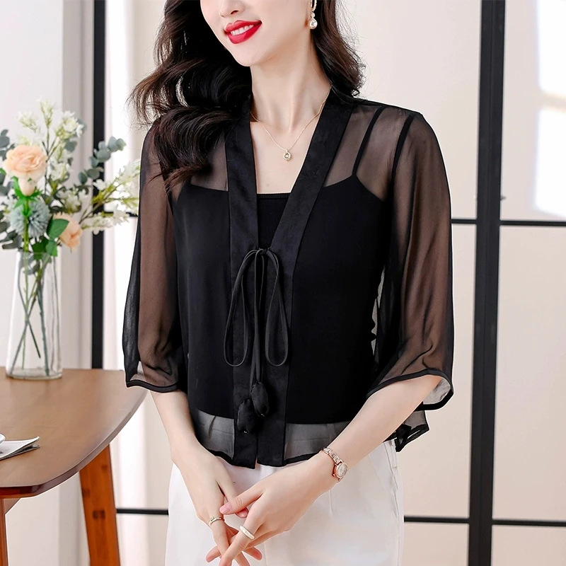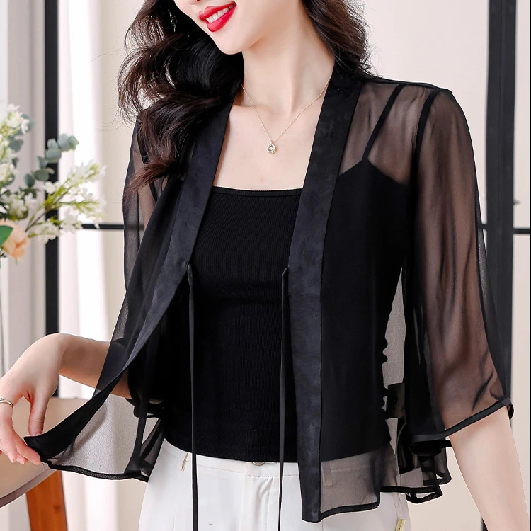 공장에서 직접 공급, 여성용 솔리드 컬러 자외선 차단 의류, 작은 숄, 고급스러운 외부 착용, 여성용 다용도 진주 쉬폰 셔츠