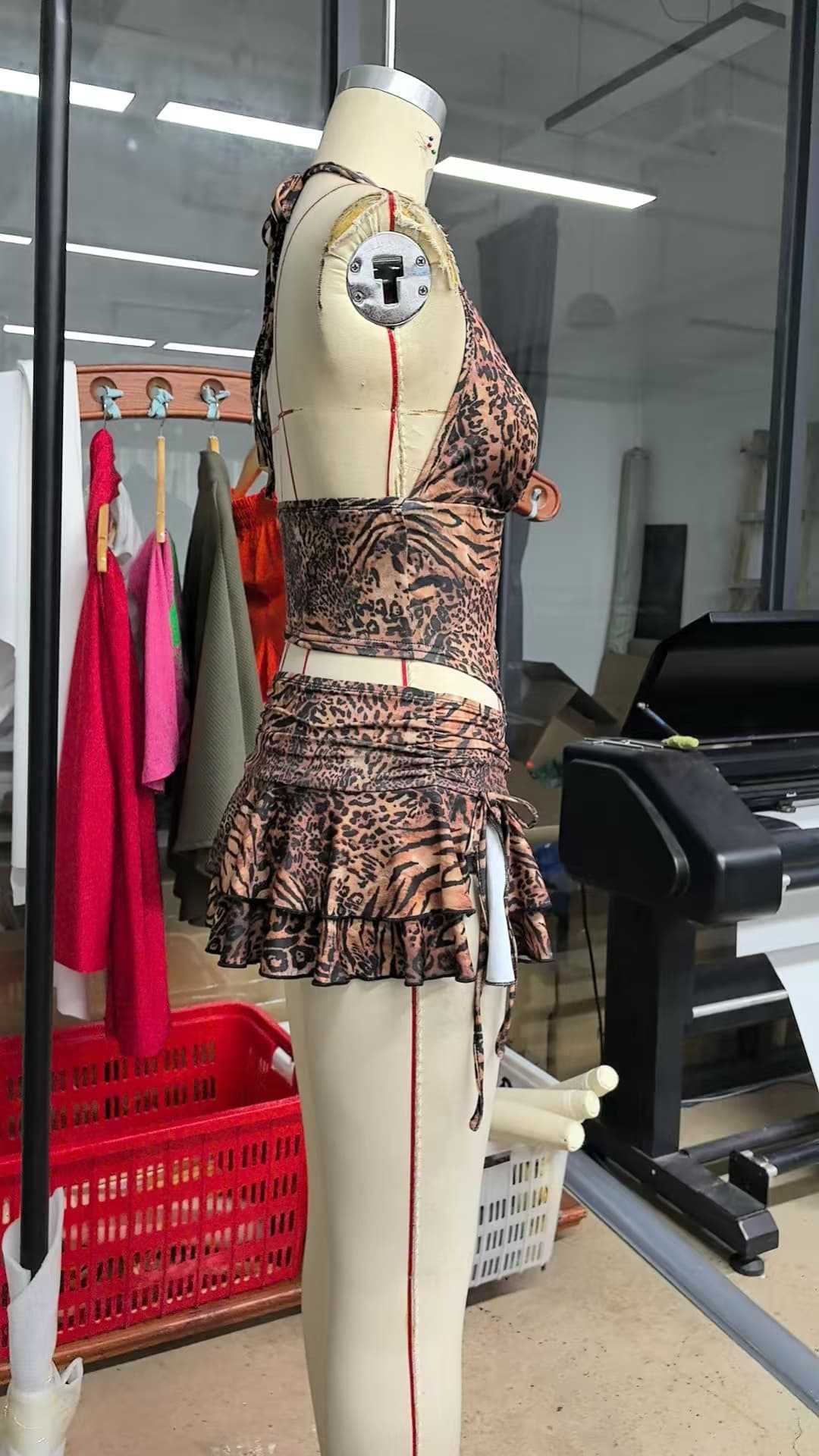 2025 Amazon TK 대외 무역 투피스 여성 홀터넥 백리스 레오파드 프린트 조끼 로우 웨이스트 스커트 섹시한 핫 소녀 슈트스토어 가기