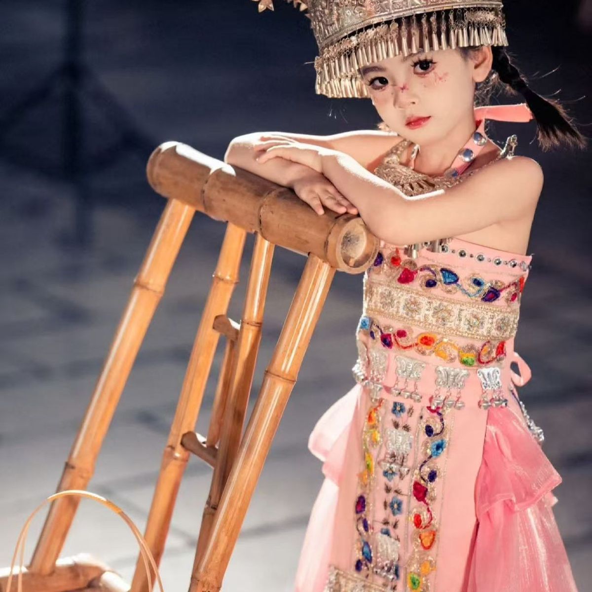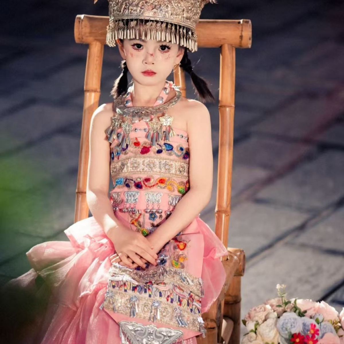 어린이와 소녀의 미오족 의상, 민족 여행 사진, 새로운 사진, 미오족 초등학생 의상, 여름 핑크 거즈 스커트 슈트