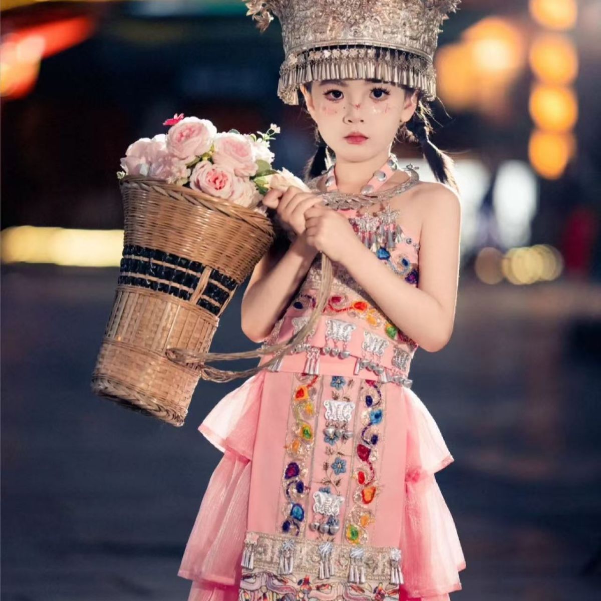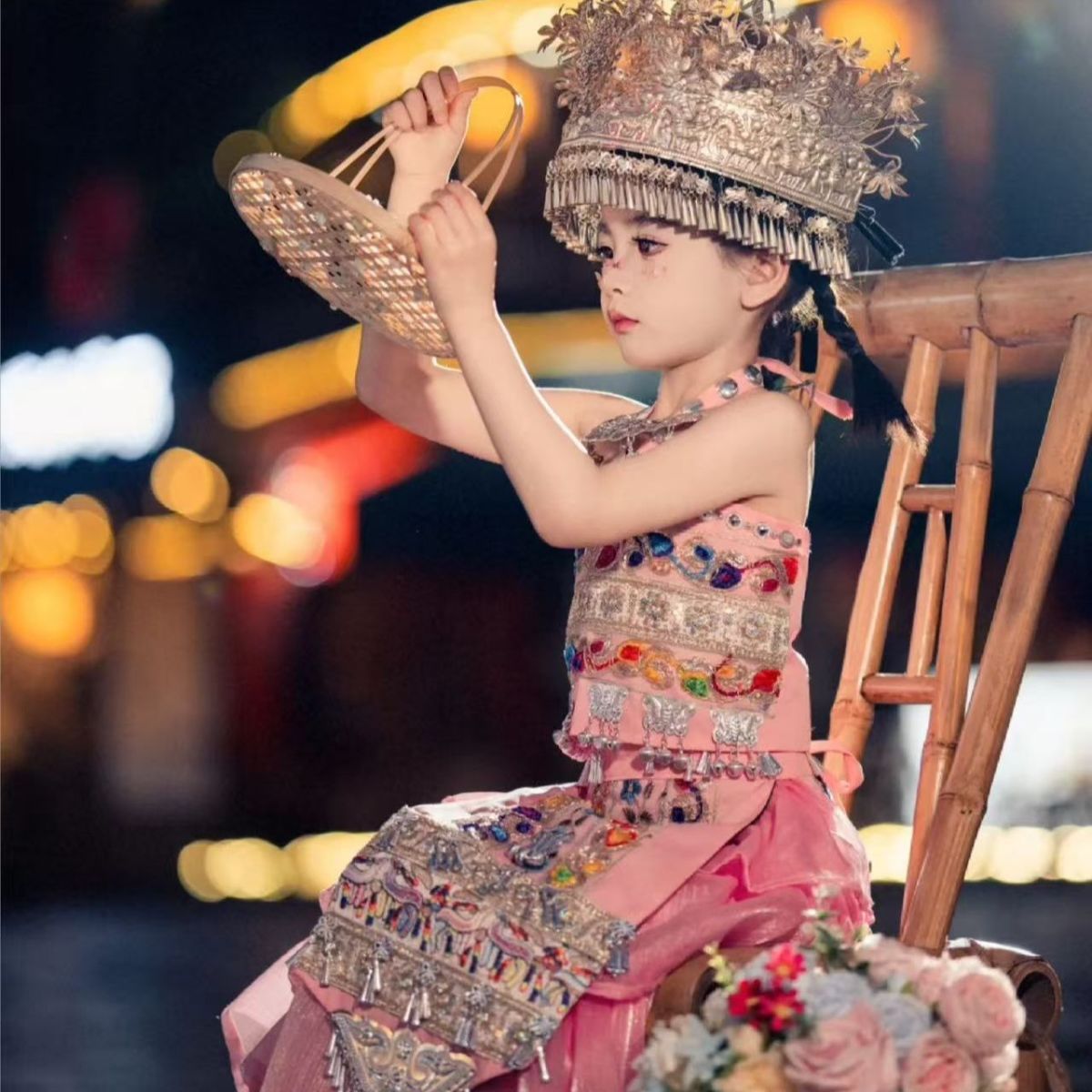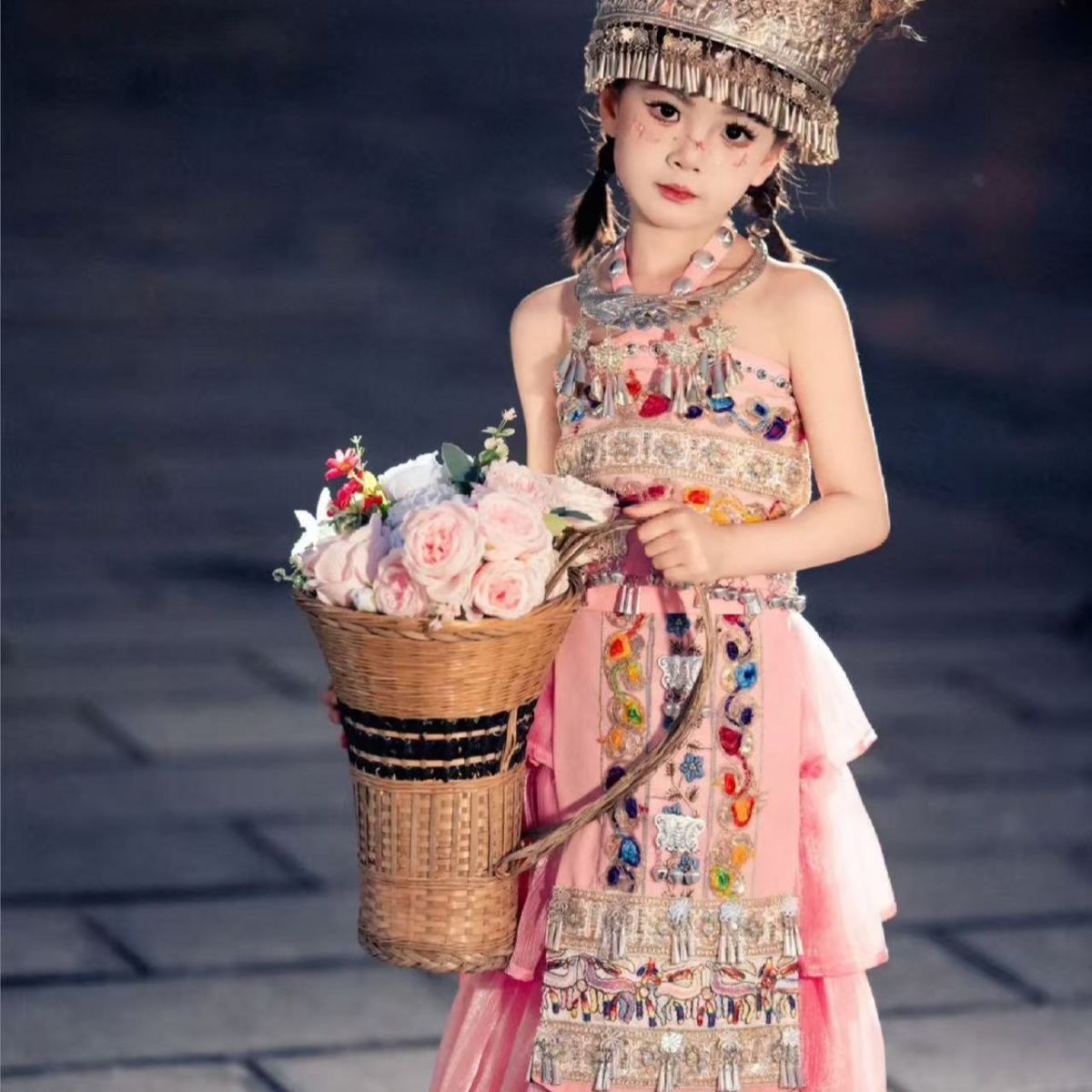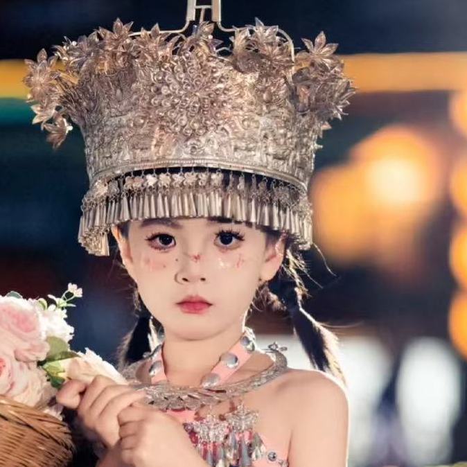 어린이와 소녀의 미오족 의상, 민족 여행 사진, 새로운 사진, 미오족 초등학생 의상, 여름 핑크 거즈 스커트 슈트스토어 가기