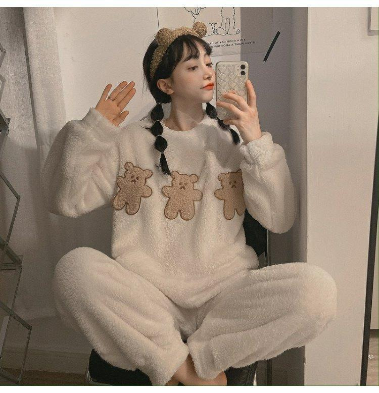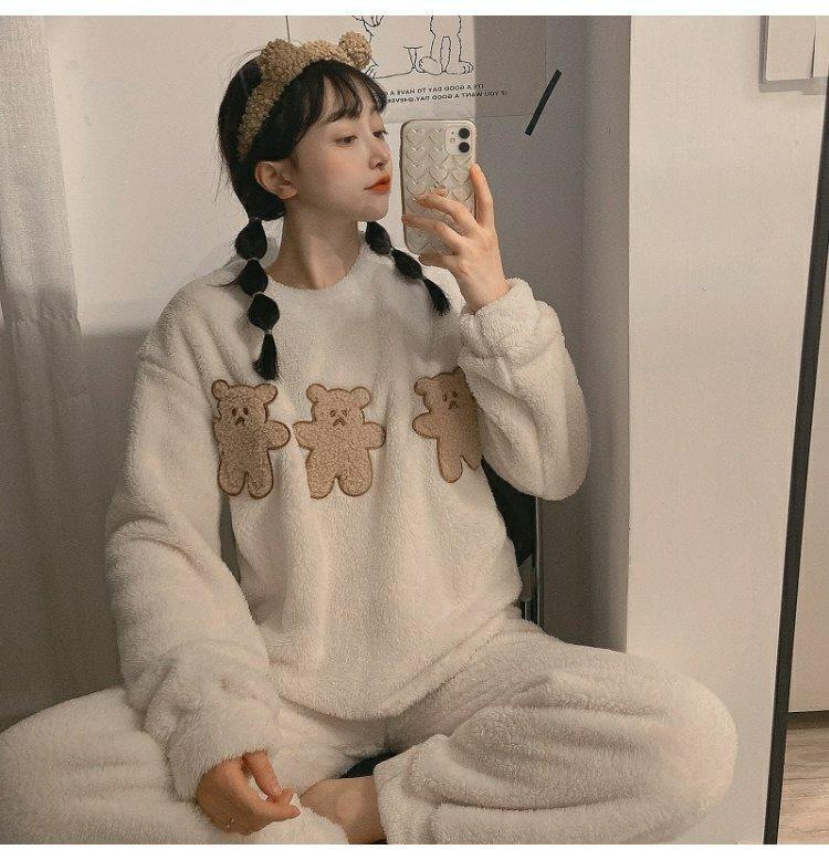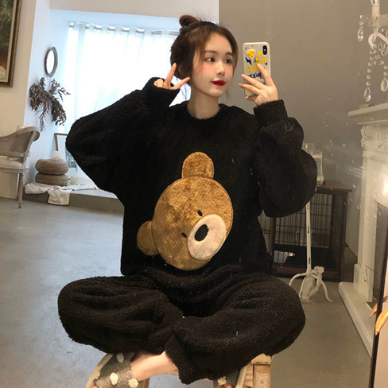여성을위한 라이브 방송 인기 잠옷 겨울 플란넬 따뜻하고 달콤한 기능 스타일 만화 소녀 홈웨어 세트 외부에 사용 가능스토어 가기