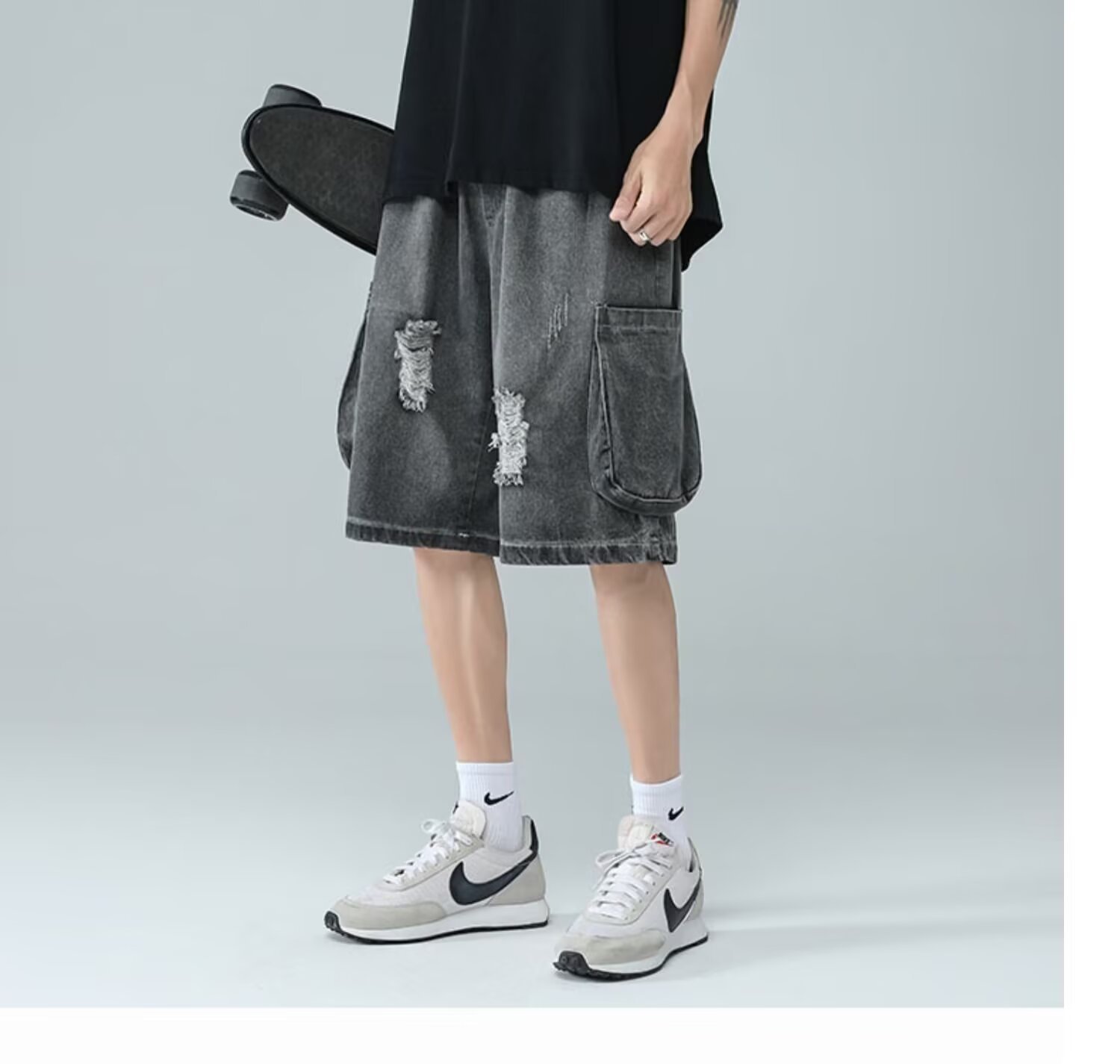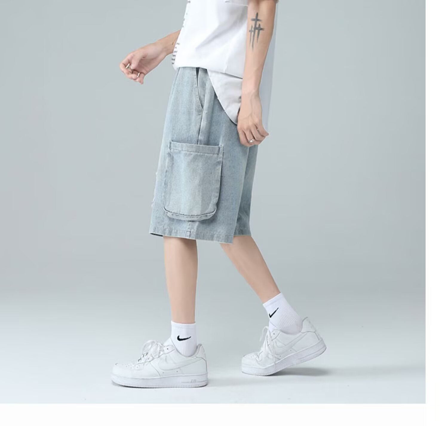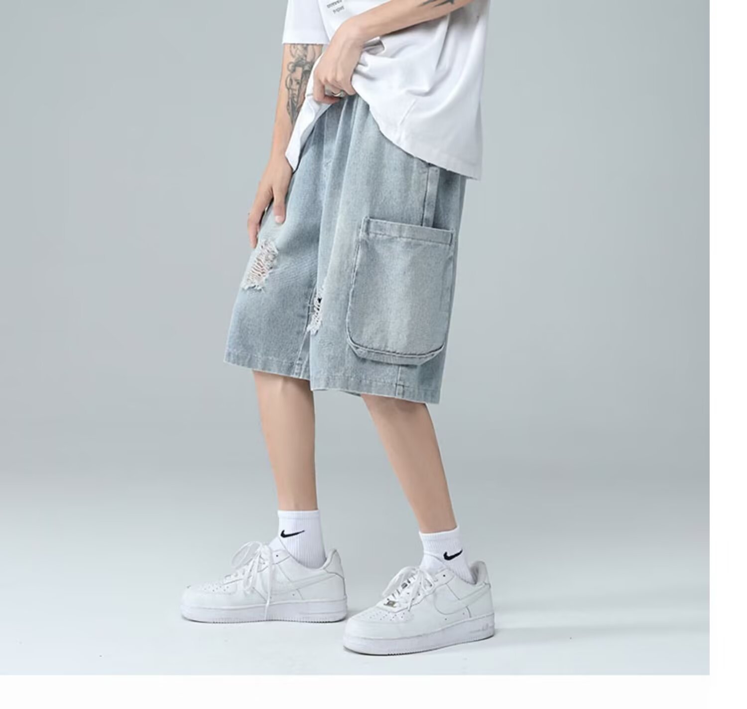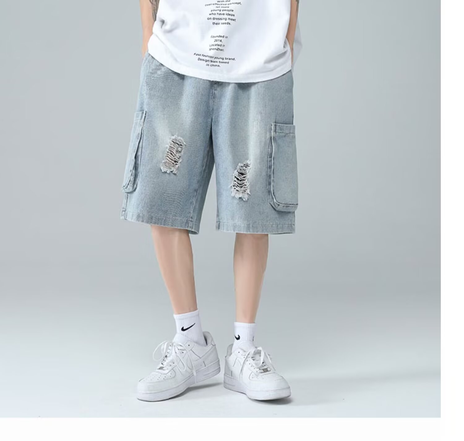 리퍼드 데님 반바지 남성 여름 얇은 트렌디 브랜드 작업복 바지 루즈한 5부 바지 아메리칸 하이 스트리트 빅 팬츠