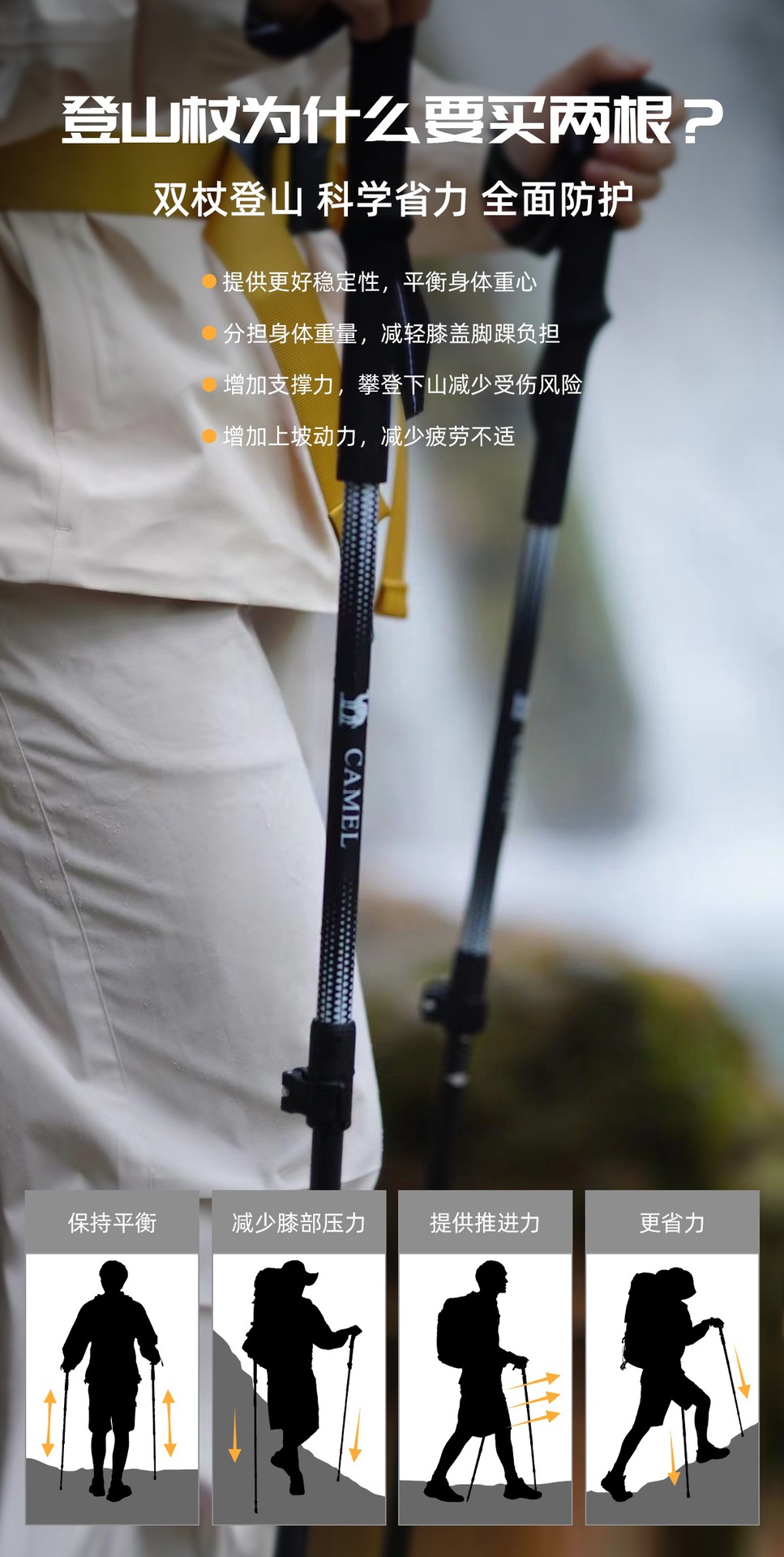 Camel 전문 야외 하이킹 스틱 초경량 탄소 텔레스코픽 접이식 하이킹 및 등산 장비 남성과 여성을위한 지팡이스토어 가기