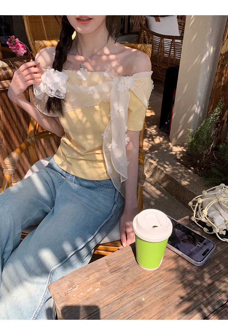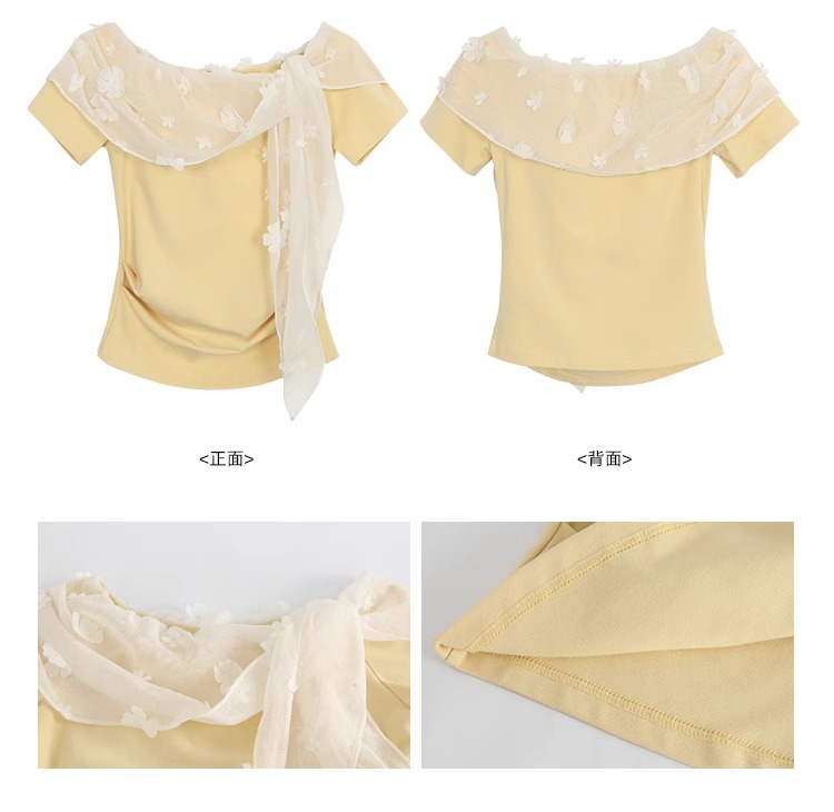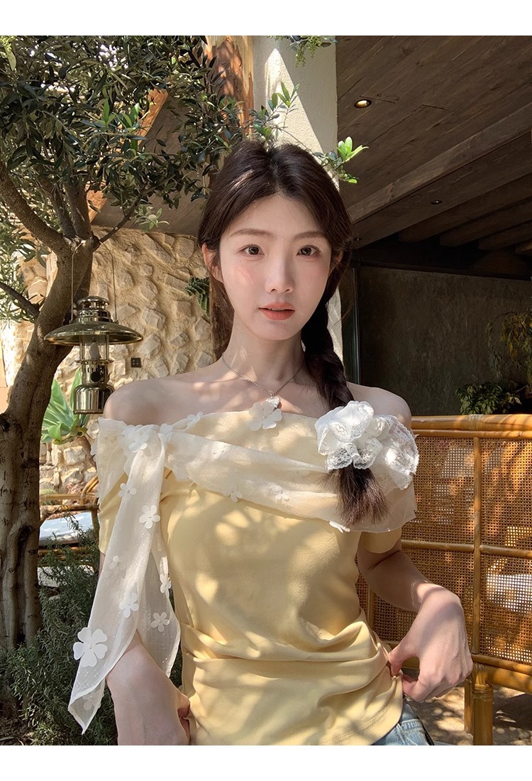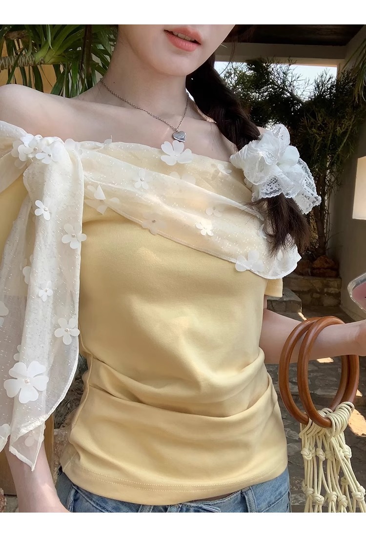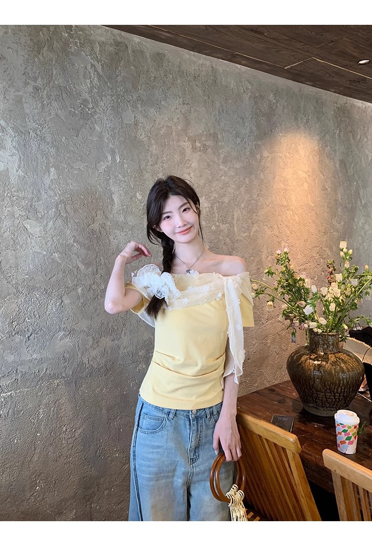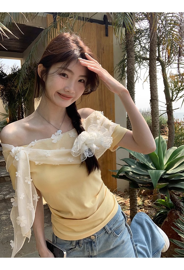 2025 새로운 반팔 티셔츠 여성 여름 디자인 틈새 짧은 노란색 레이스 오프 숄더 원 숄더 탑스토어 가기