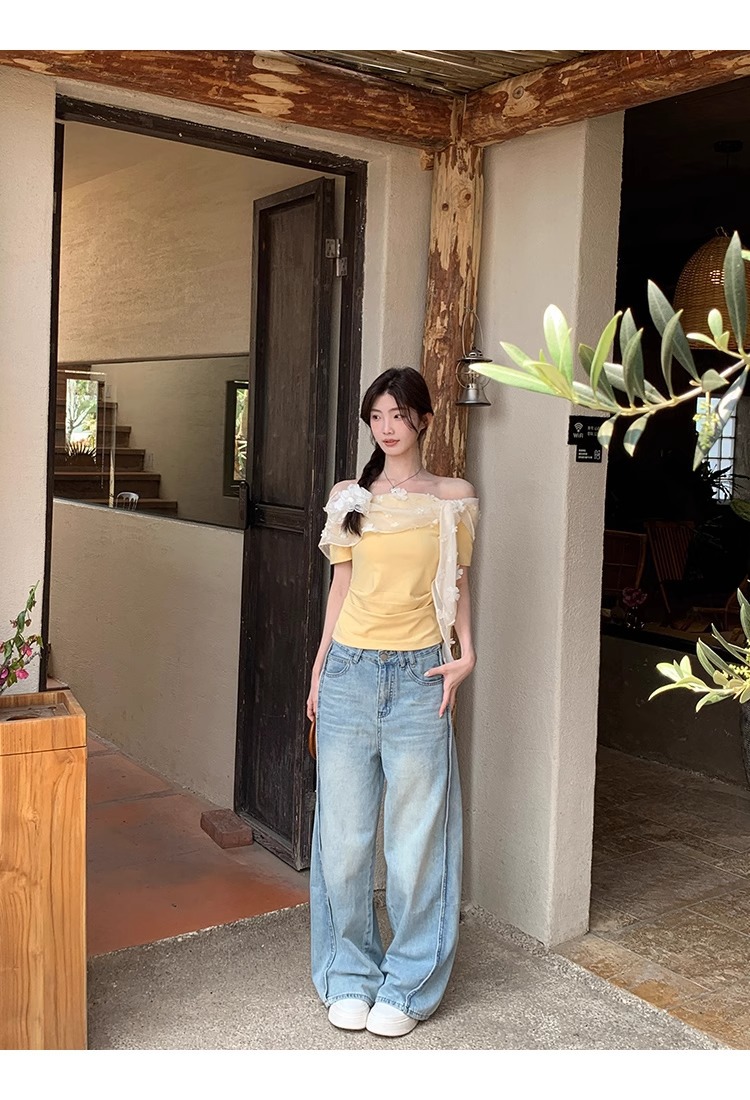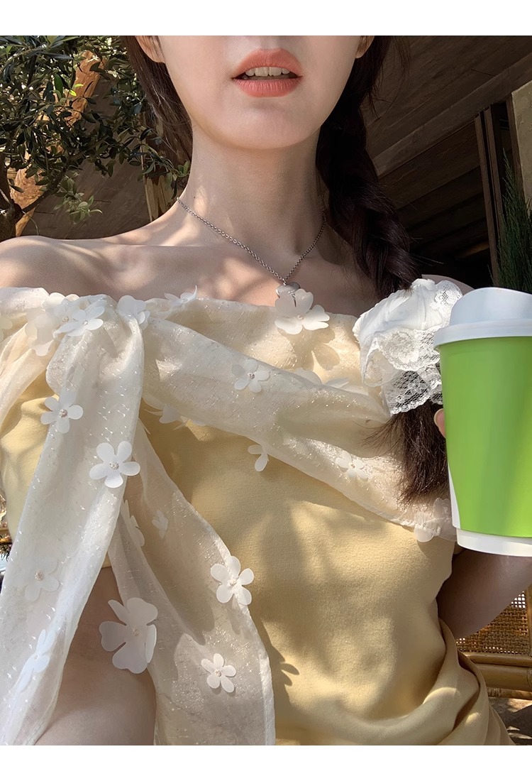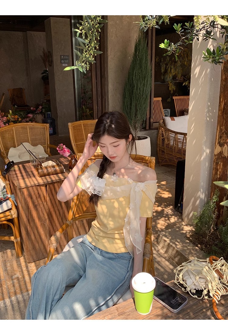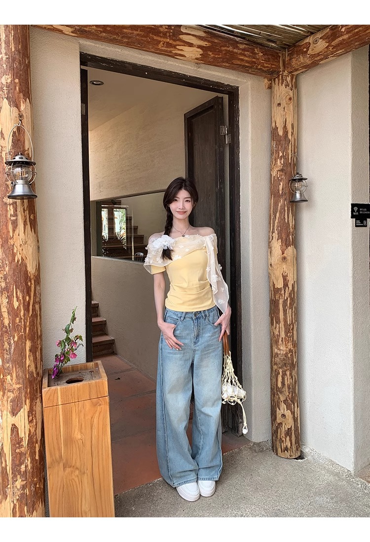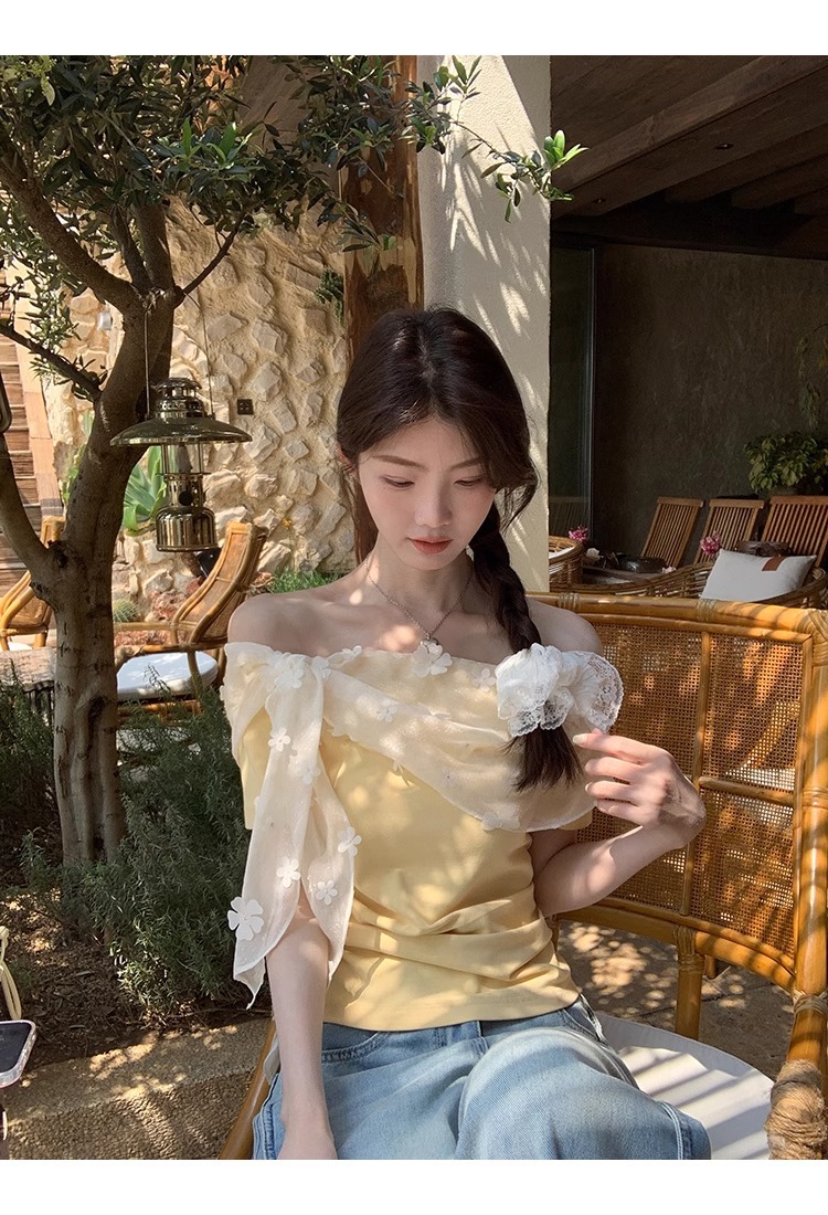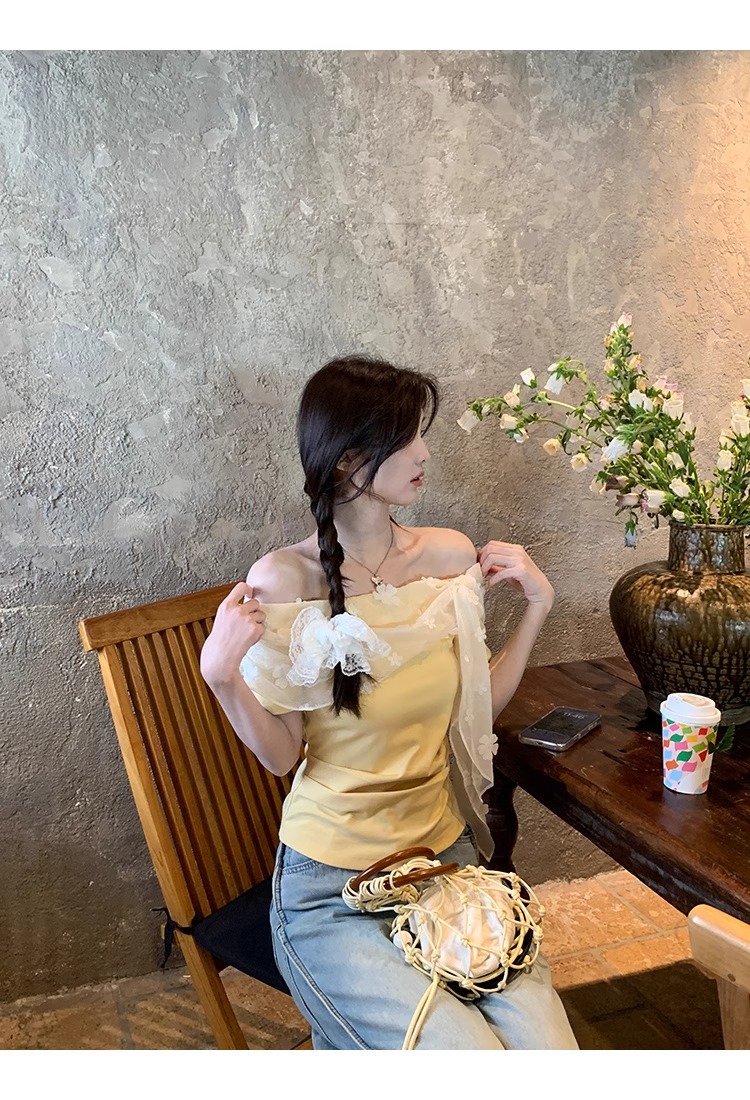 2025 새로운 반팔 티셔츠 여성 여름 디자인 틈새 짧은 노란색 레이스 오프 숄더 원 숄더 탑스토어 가기