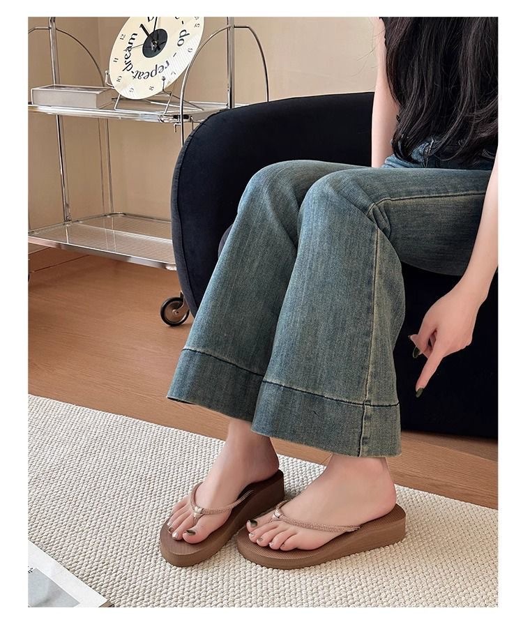 Jinbukang 여성용 새 비치 슈즈 슬리퍼 여름 패션 아우터웨어 해변 두꺼운 밑창 웨지 힐 플립 플롭 라인스톤 헤링본스토어 가기